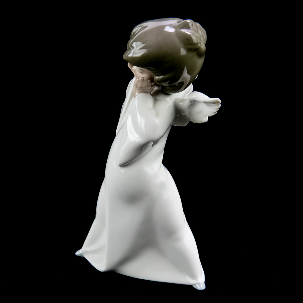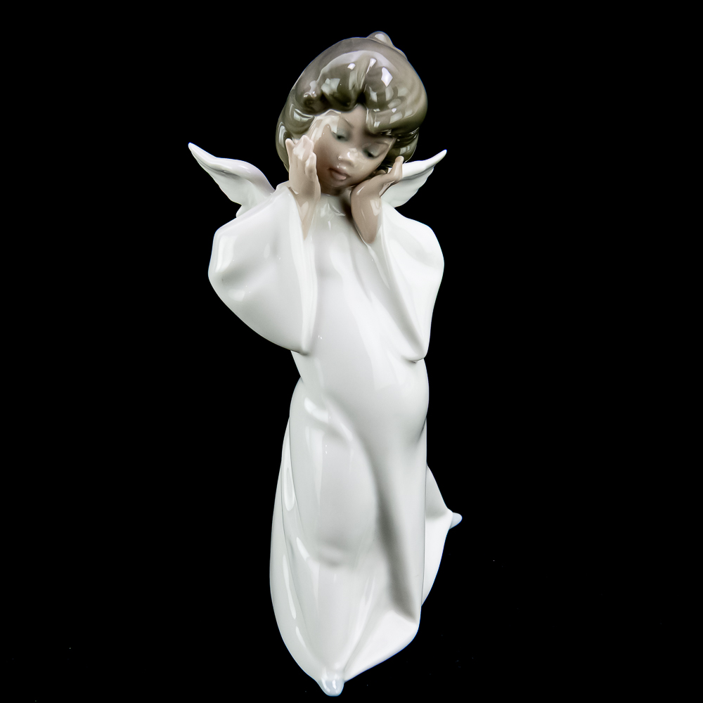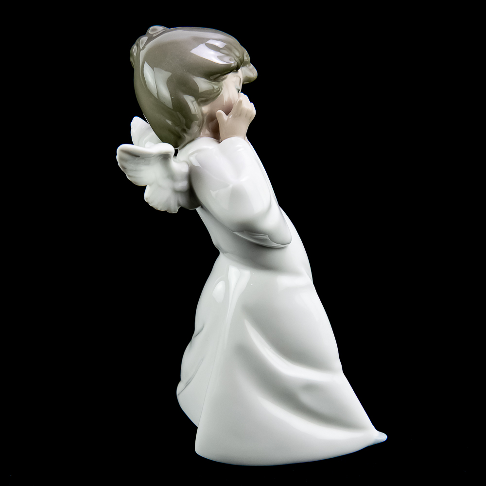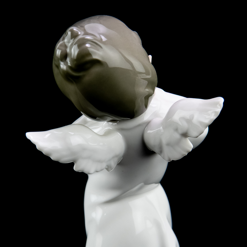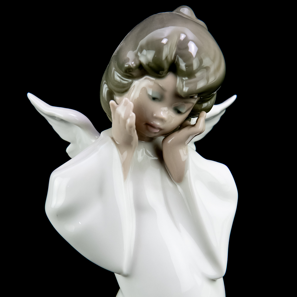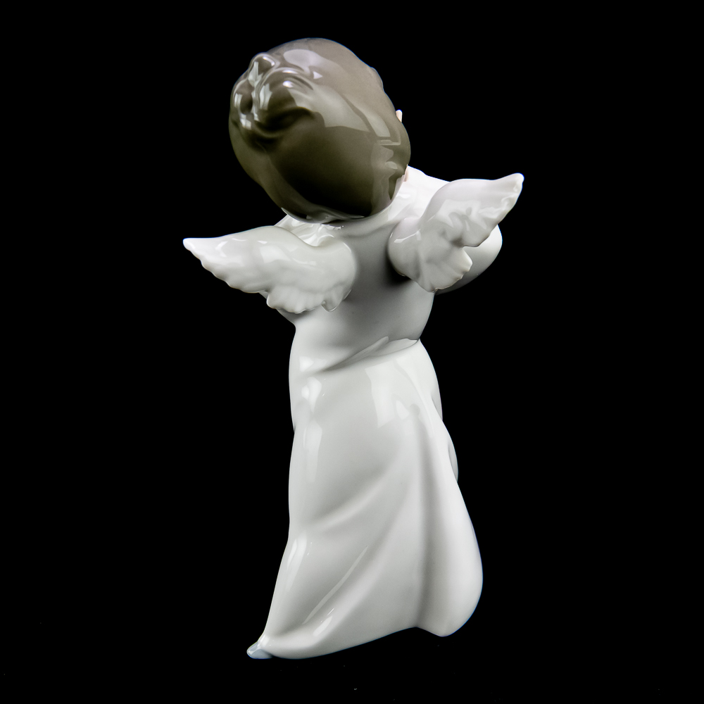 This charming piece features a young angel with a shy, blushing expression. The figurine stands about 8.75 inches tall and has a glossy finish with pastel colors..In VG condition with no chips, cracks, or repairs. No box or paperwork.