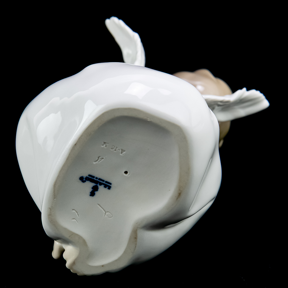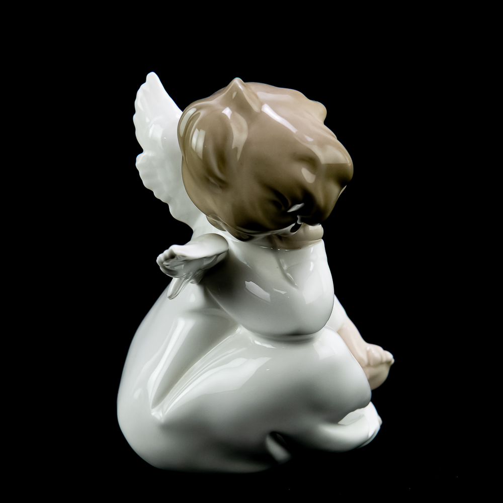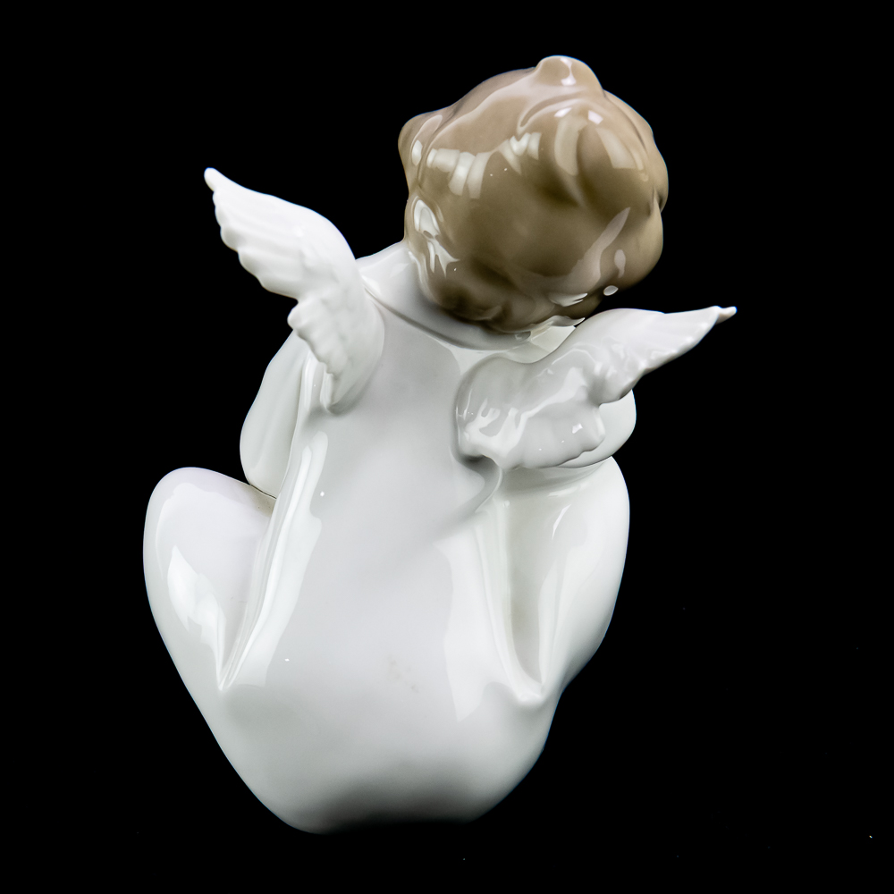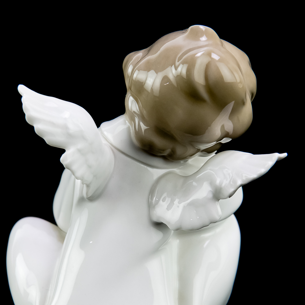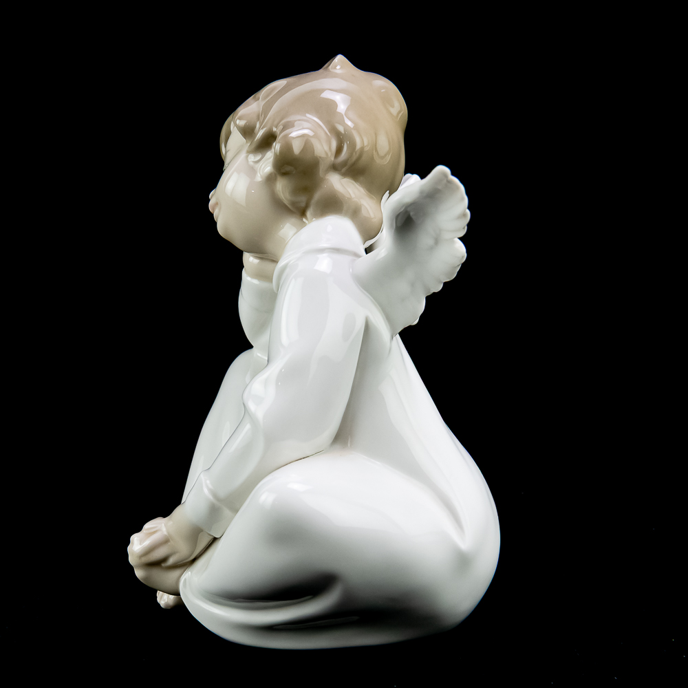 Angel Dreaming (model #4961). This charming piece features a porcelain angel sitting with its head resting on its hand, giving a dreamy and serene expression. The figurine stands about 8.75 inches tall and is decorated in soft pastel colors. In VG condition with no chips, cracks, or repairs. No box or paperwork.