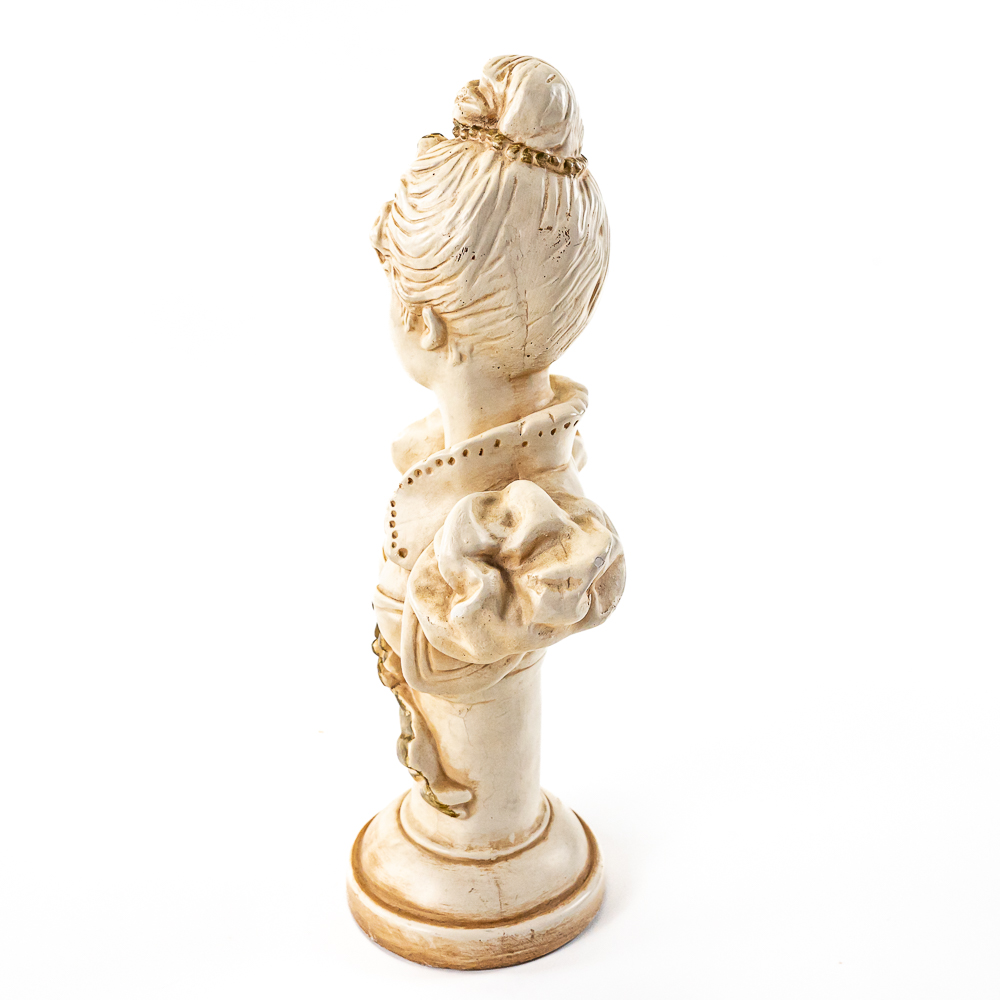 Attractive 12″ Victorian Lady bust chalkware statue. In very good overall condition with signs of age including light discoloration, minor chips along with a minor abrasion on backside of pedestal (primarily near base edge); noticeable under close examination. Perfect addition to your home or office. Please use photos to judge condition and bid accordingly.