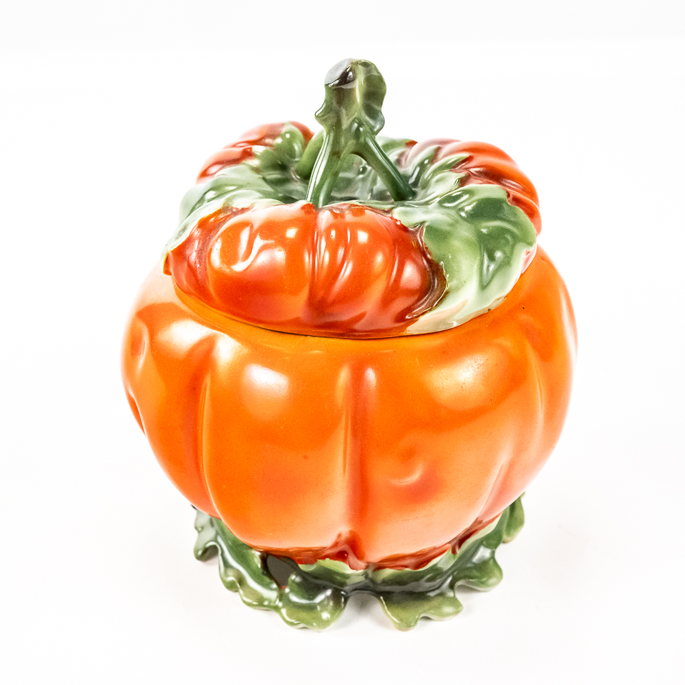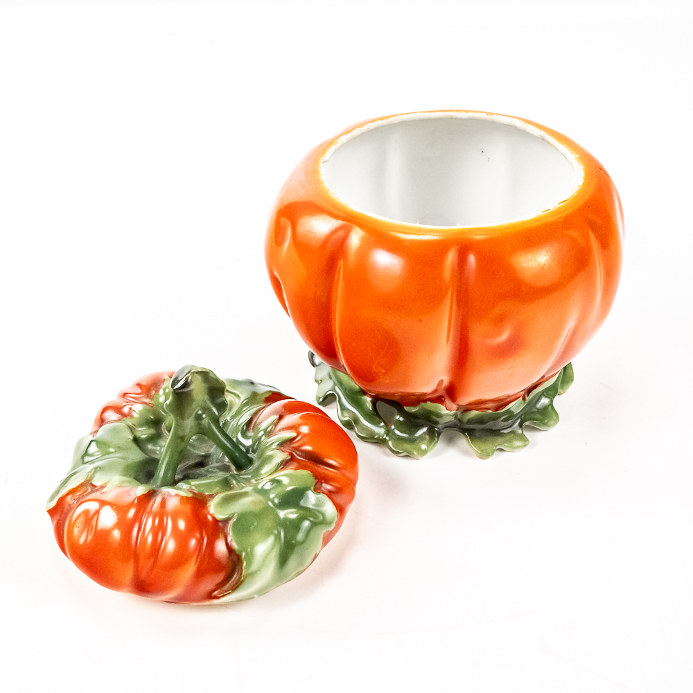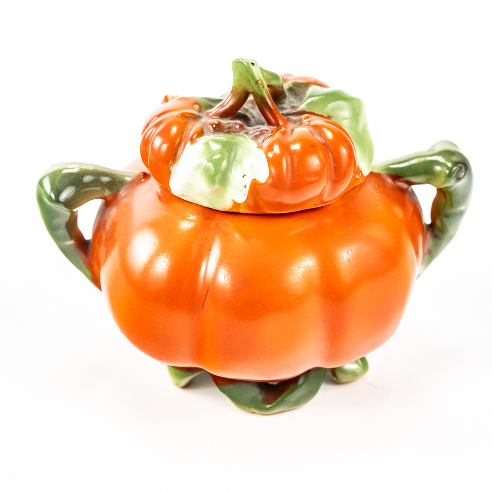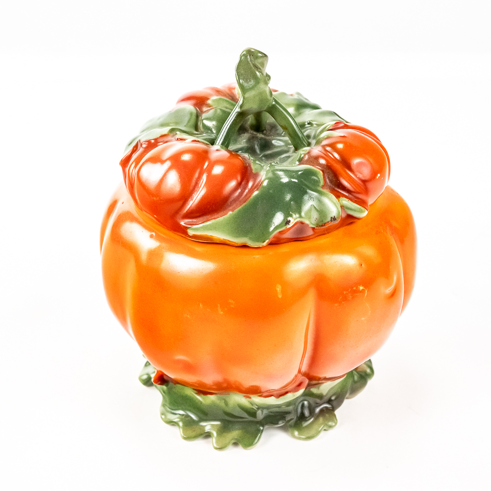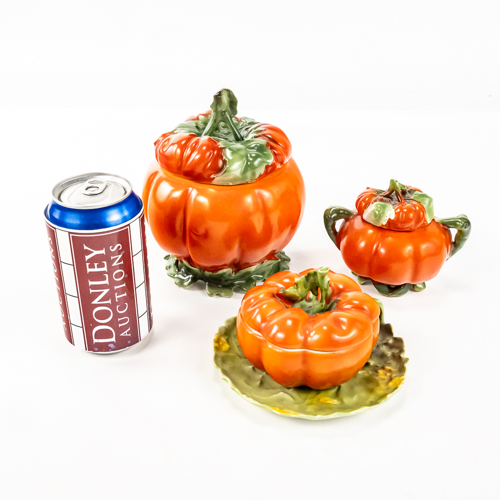Includes a 6.5″ covered tomato cracker jar in VG condition with 1 small edge chip on inside rim of the jar, a 3..25″ covered sugar in VG condition, and a 3.75″ tall covered tomato on plate.