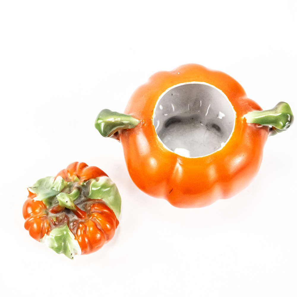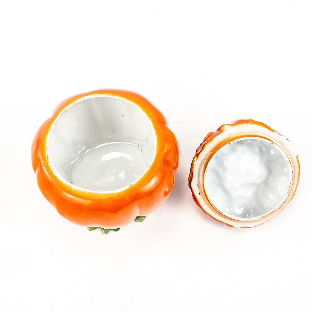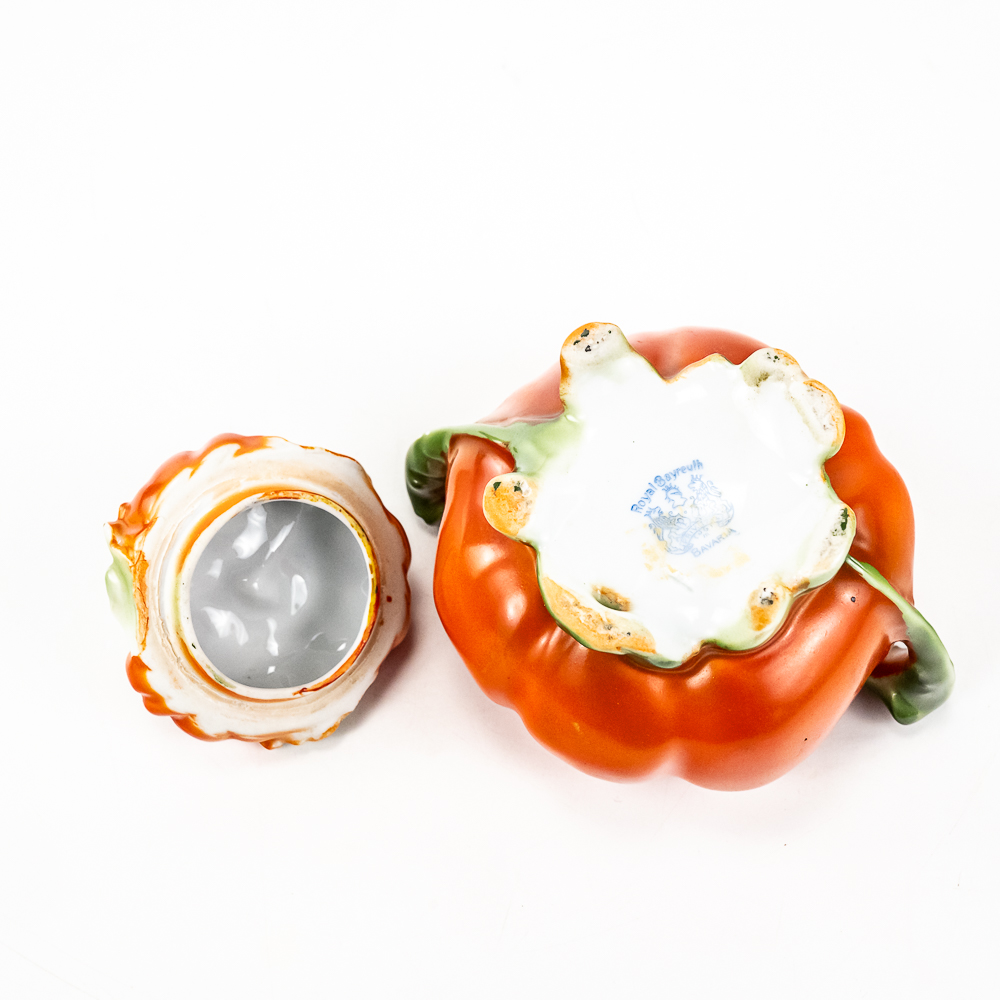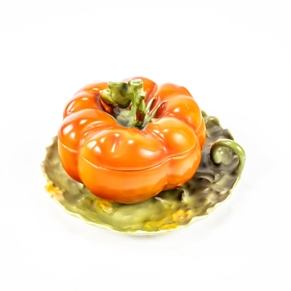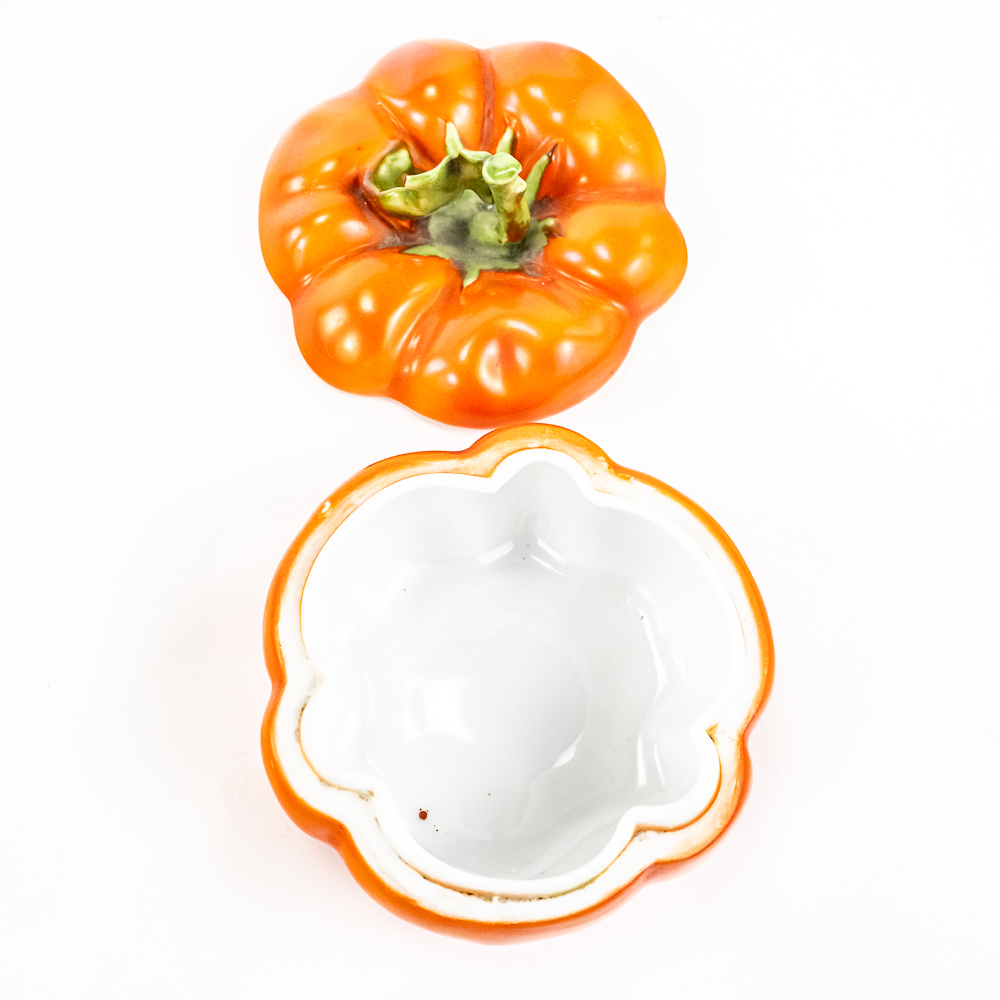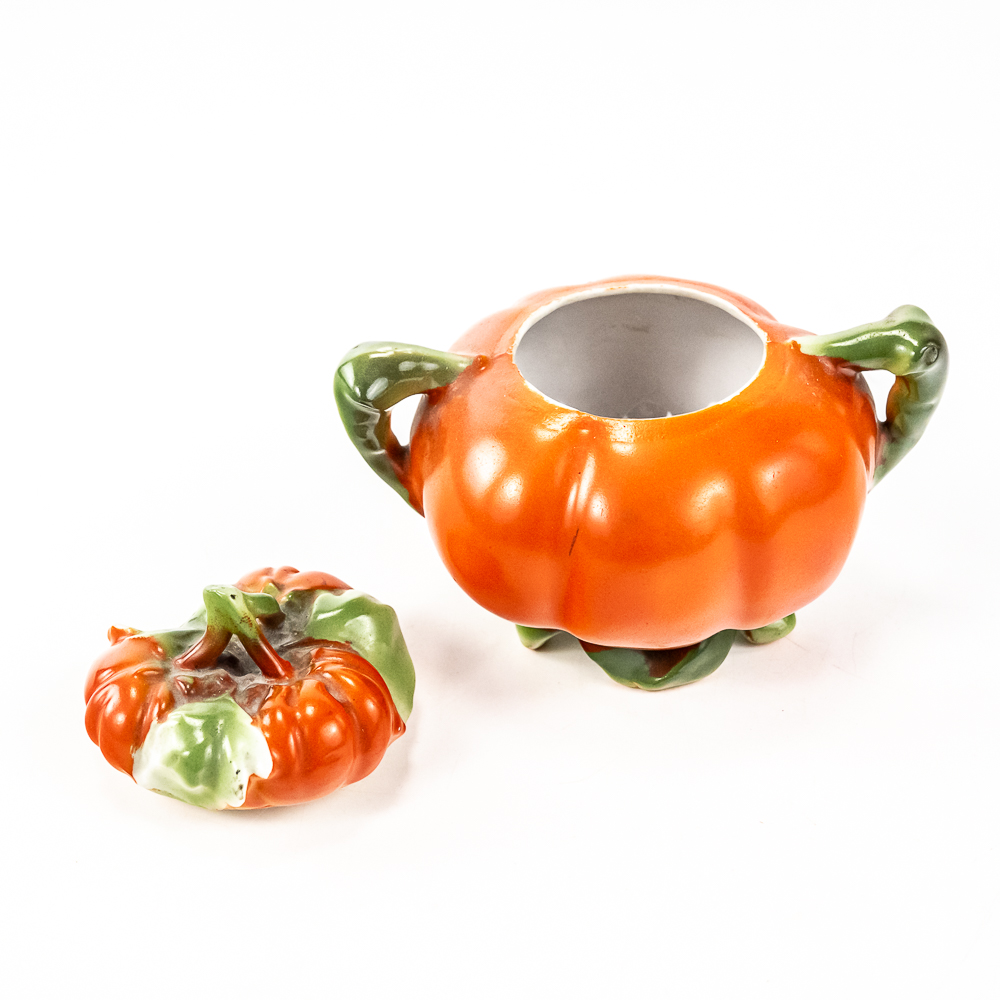 Includes a 6.5″ covered tomato cracker jar in VG condition with 1 small edge chip on inside rim of the jar, a 3..25″ covered sugar in VG condition, and a 3.75″ tall covered tomato on plate.