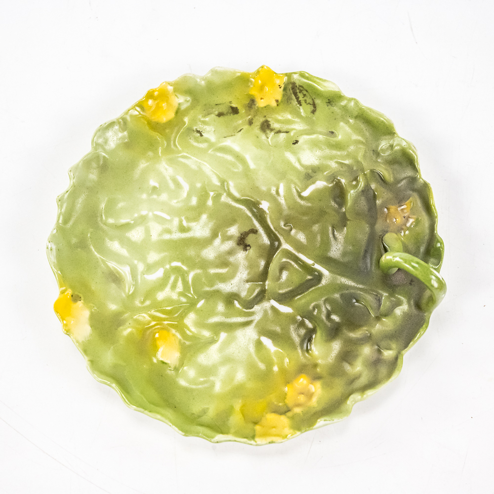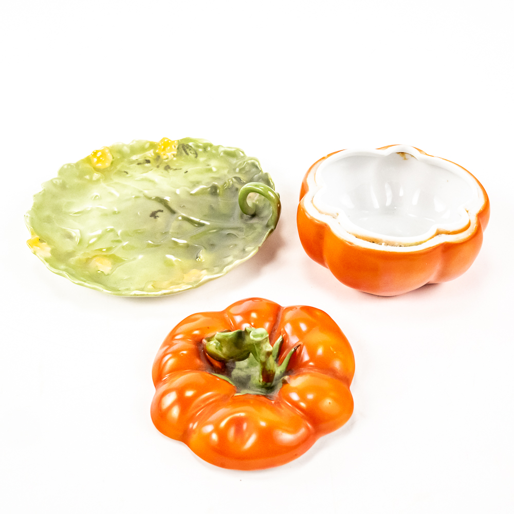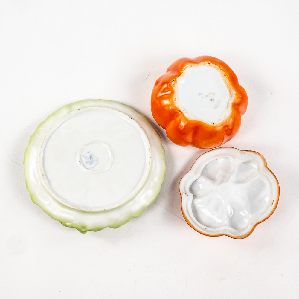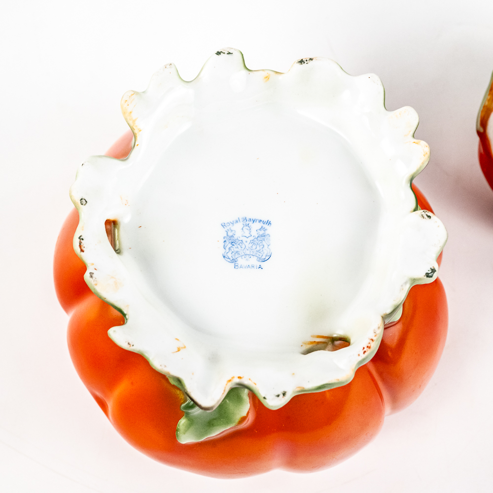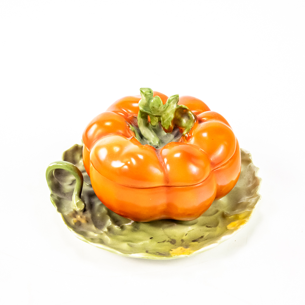 Includes a 6.5″ covered tomato cracker jar in VG condition with 1 small edge chip on inside rim of the jar, a 3..25″ covered sugar in VG condition, and a 3.75″ tall covered tomato on plate.