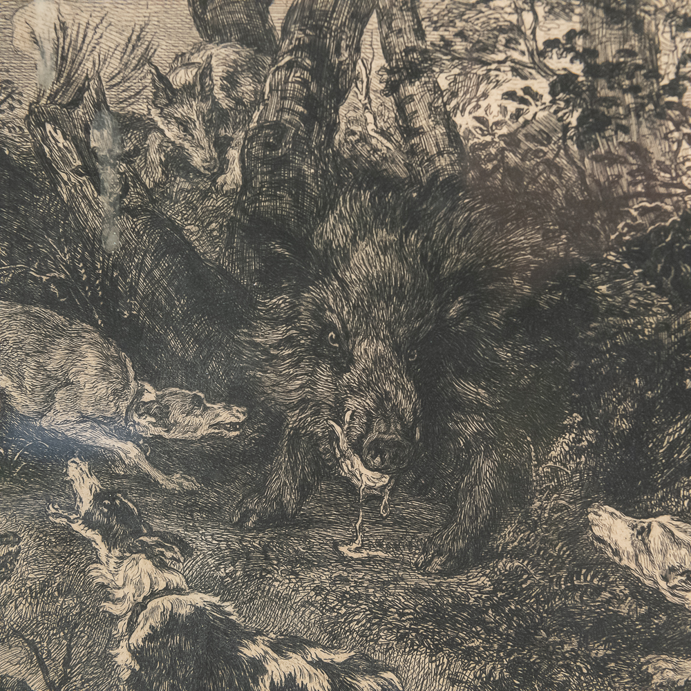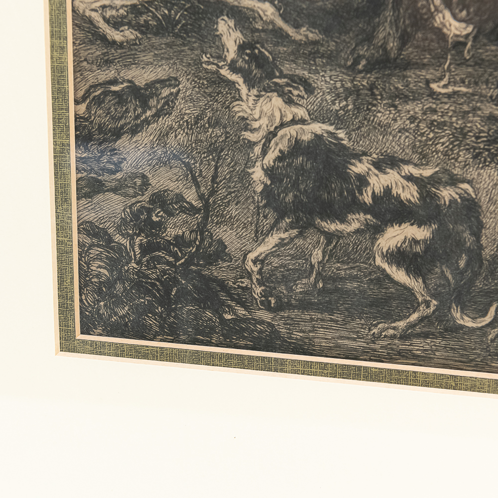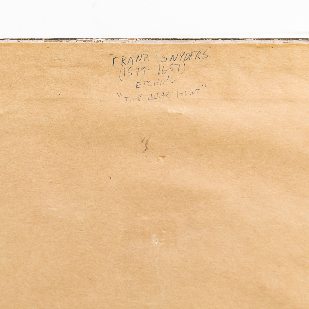 Antique quality framed etching by William Unger after “The Boar Hunt” by Frans Snyders (1519-1657). Believed to be by William Unger however unable to locate signature. Professionally framed and matted and approximately 18.5″t x 1″x 22.5″l. Frame does show some imperfections such as rub marks with light discoloration. Please use photos to judge condition and bid accordingly.