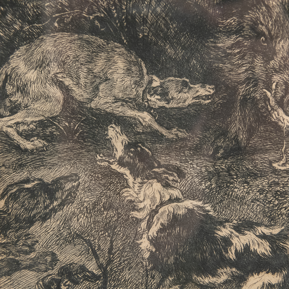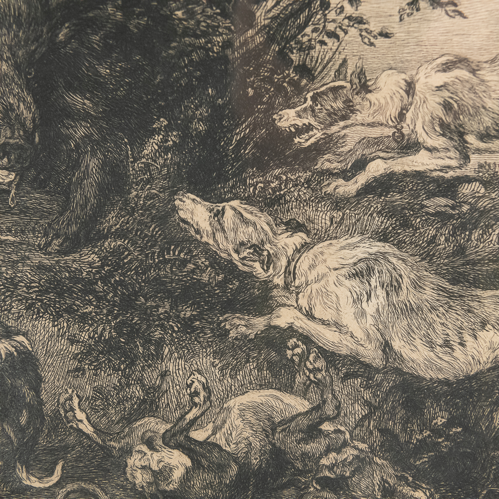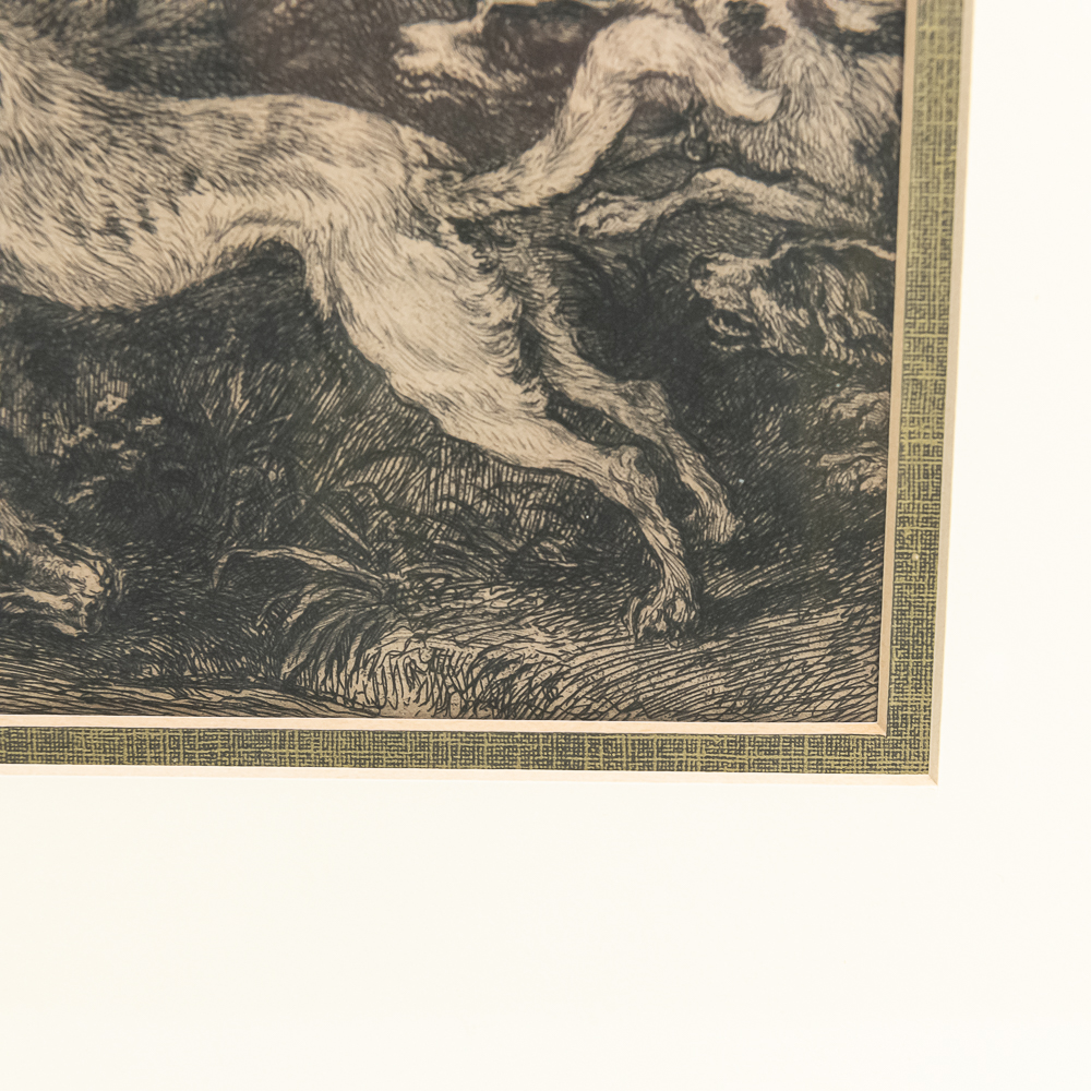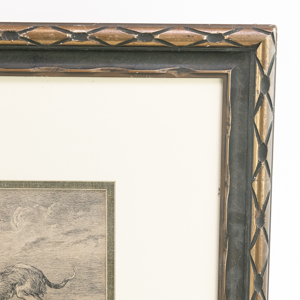 Antique quality framed etching by William Unger after “The Boar Hunt” by Frans Snyders (1519-1657). Believed to be by William Unger however unable to locate signature. Professionally framed and matted and approximately 18.5″t x 1″x 22.5″l. Frame does show some imperfections such as rub marks with light discoloration. Please use photos to judge condition and bid accordingly.