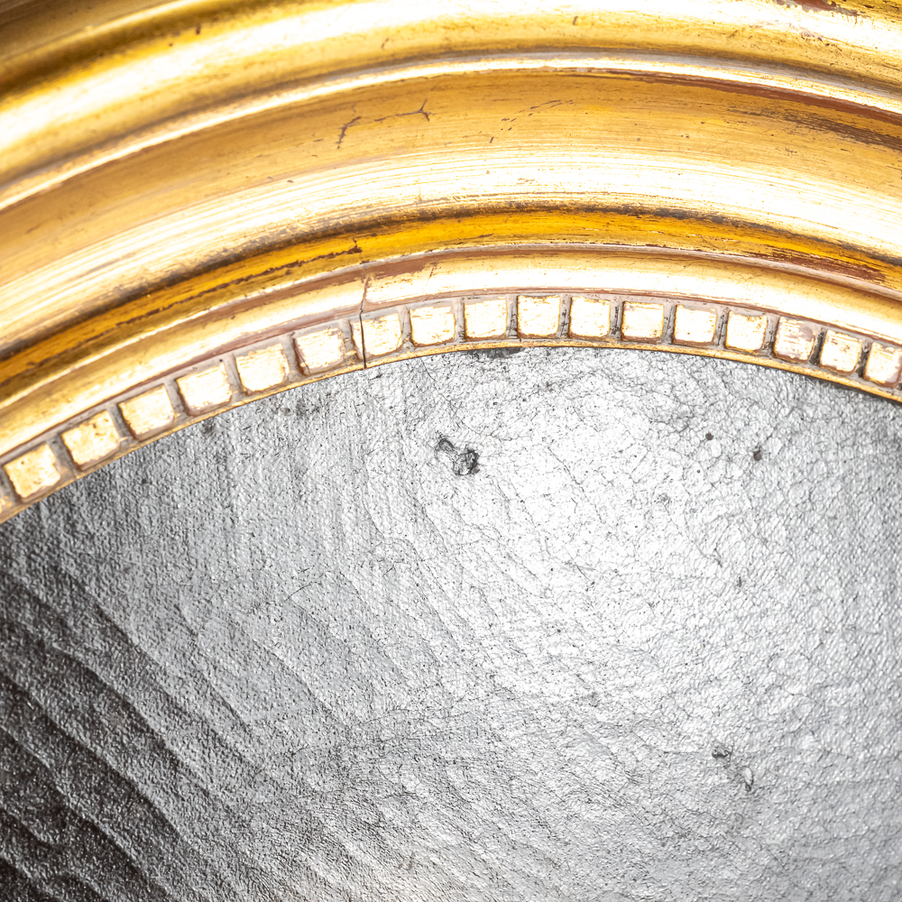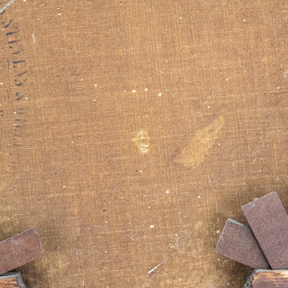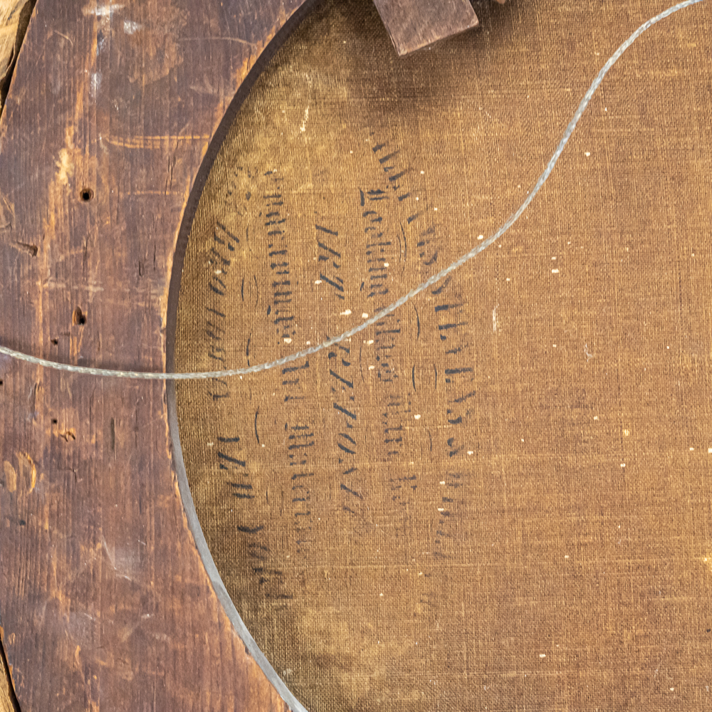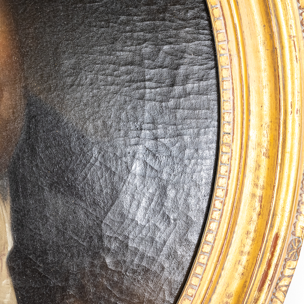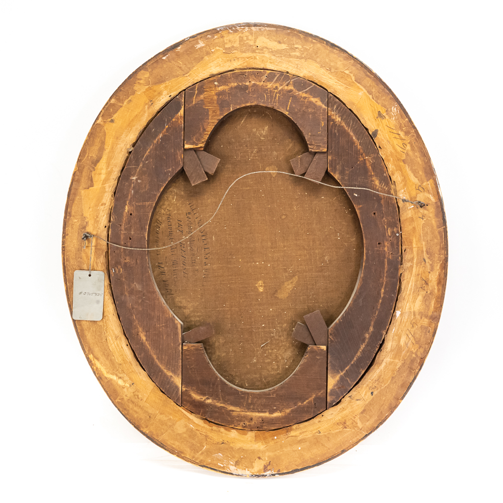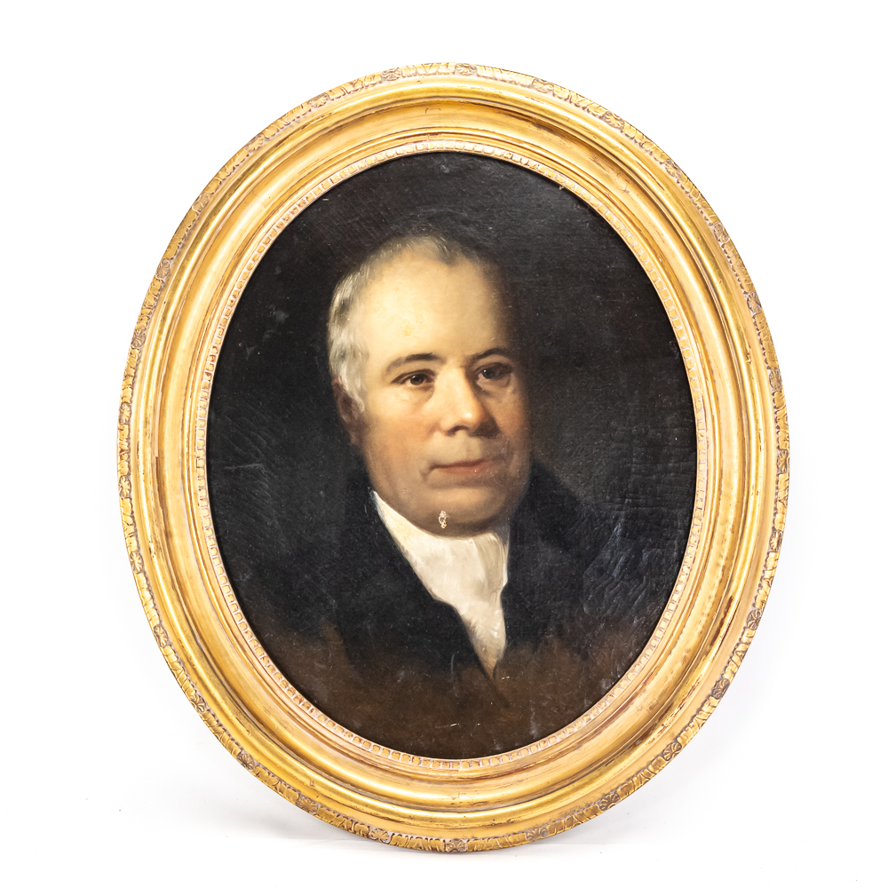 This is a fine example of early 19th-century portraiture, an oil on canvas depicting a stout, middle-aged gentleman with receding grey hair and a high white stock. The portrait is housed in its original oval gilt-wood frame, which features a detailed egg-and-dart style border. The reverse of the canvas reveals a stencil for the canvas maker: “THOS STEVENS, Looking Glass & Picture… Art Reposit… Brooklyn, New York”. The frame’s stretcher has corner braces and a cross brace for stability. The portrait exhibits a dark, chiaroscuro-like background, drawing focus to the sitter’s face and white attire. Condition is good for its age; the canvas shows craquelure consistent with oil paint aging, and there are some minor surface scratches on the paint. The gilt frame has typical wear, including small losses to the gesso and gilding. The wooden support on the reverse shows wear and age. H 27″, W 23″, D 2”.
