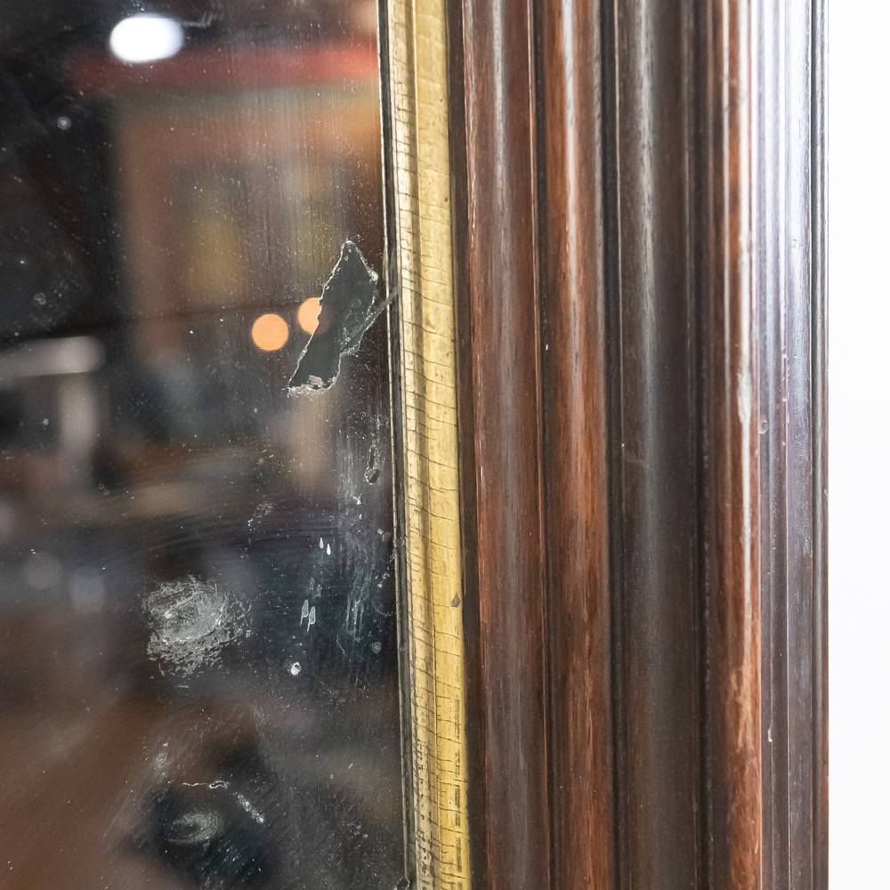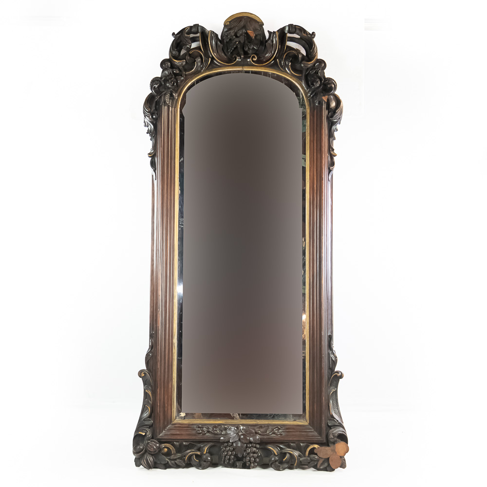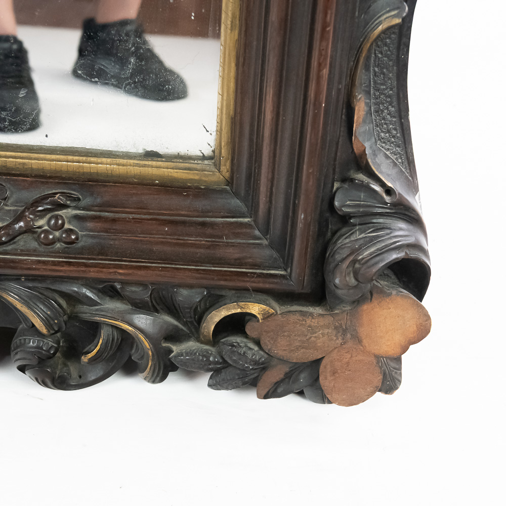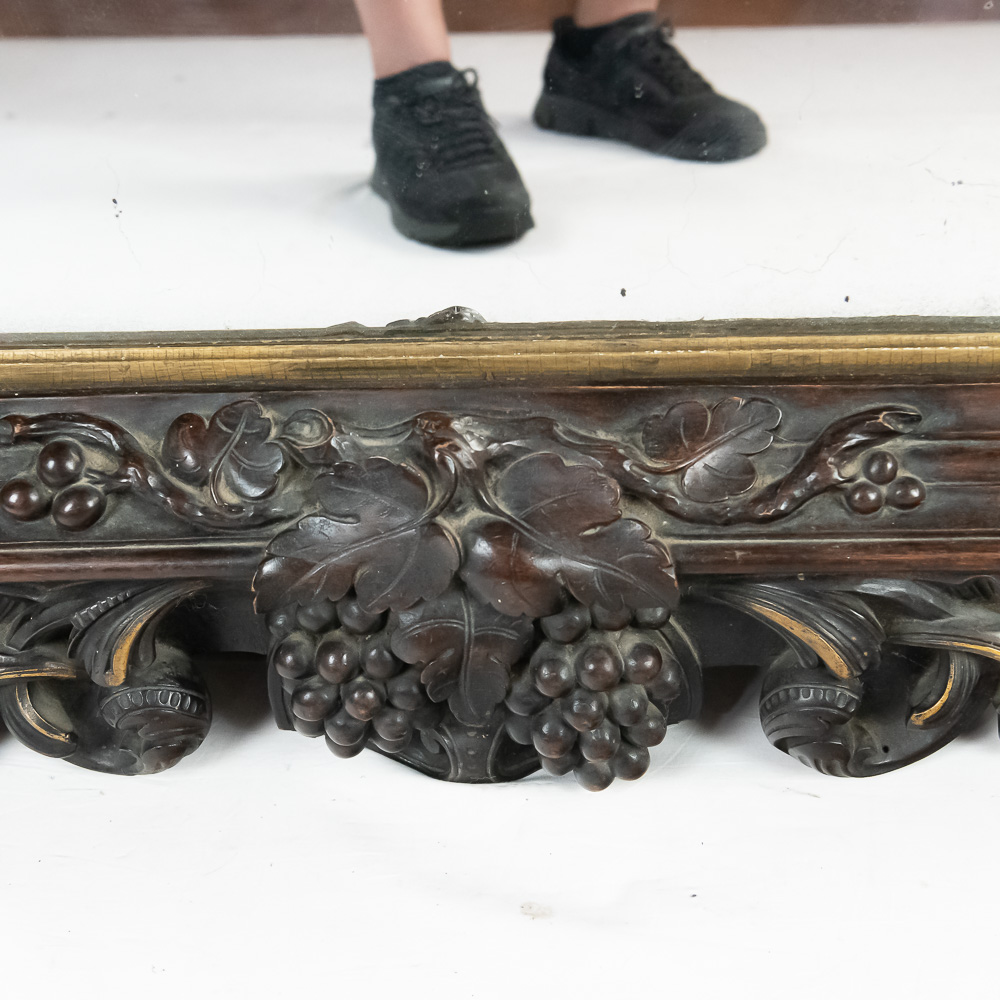 An exceptionally bold and masterfully carved mirror, likely of European origin from the mid-to-late 19th century. This piece has a commanding presence, executed in the Rococo Revival style with deep, intricate carving throughout. Note the fantastic clusters of grapes at the base, the floral and C-scroll motifs, and the impressive pierced crest. The dark-stained hardwood, possibly walnut, provides a rich contrast to the simple gilt liner. This is a true statement piece. The frame has several areas of condition issues, including noticeable chips and losses to the carved elements on the crest, side, and base, exposing the lighter wood underneath. The mirror plate is likely original and shows significant age with de silvering and spotting. Measures 90″ tall, 40″ wide, 4″ deep.