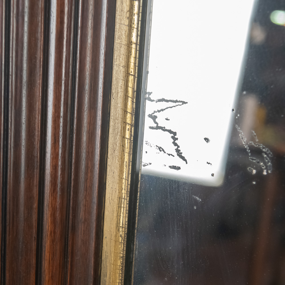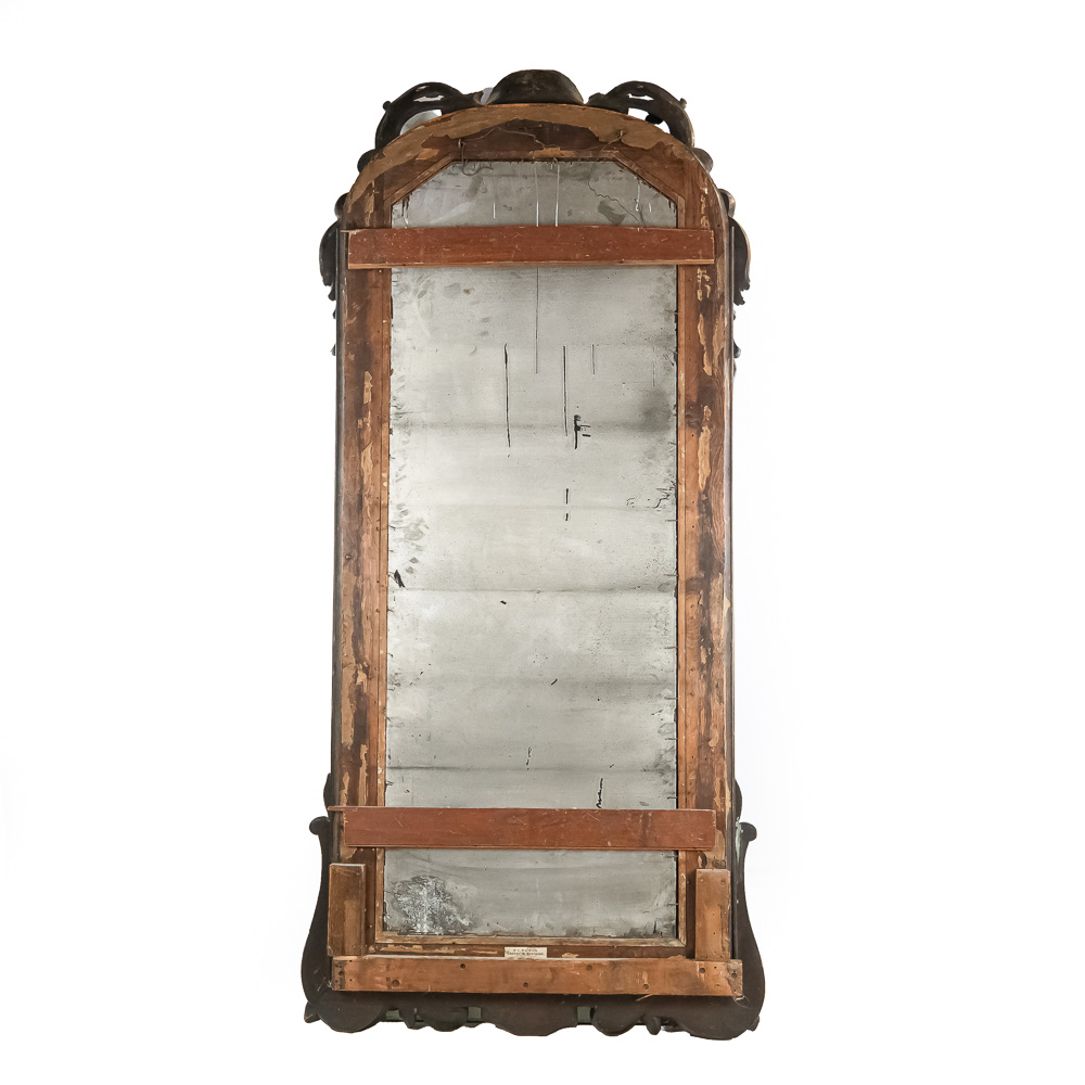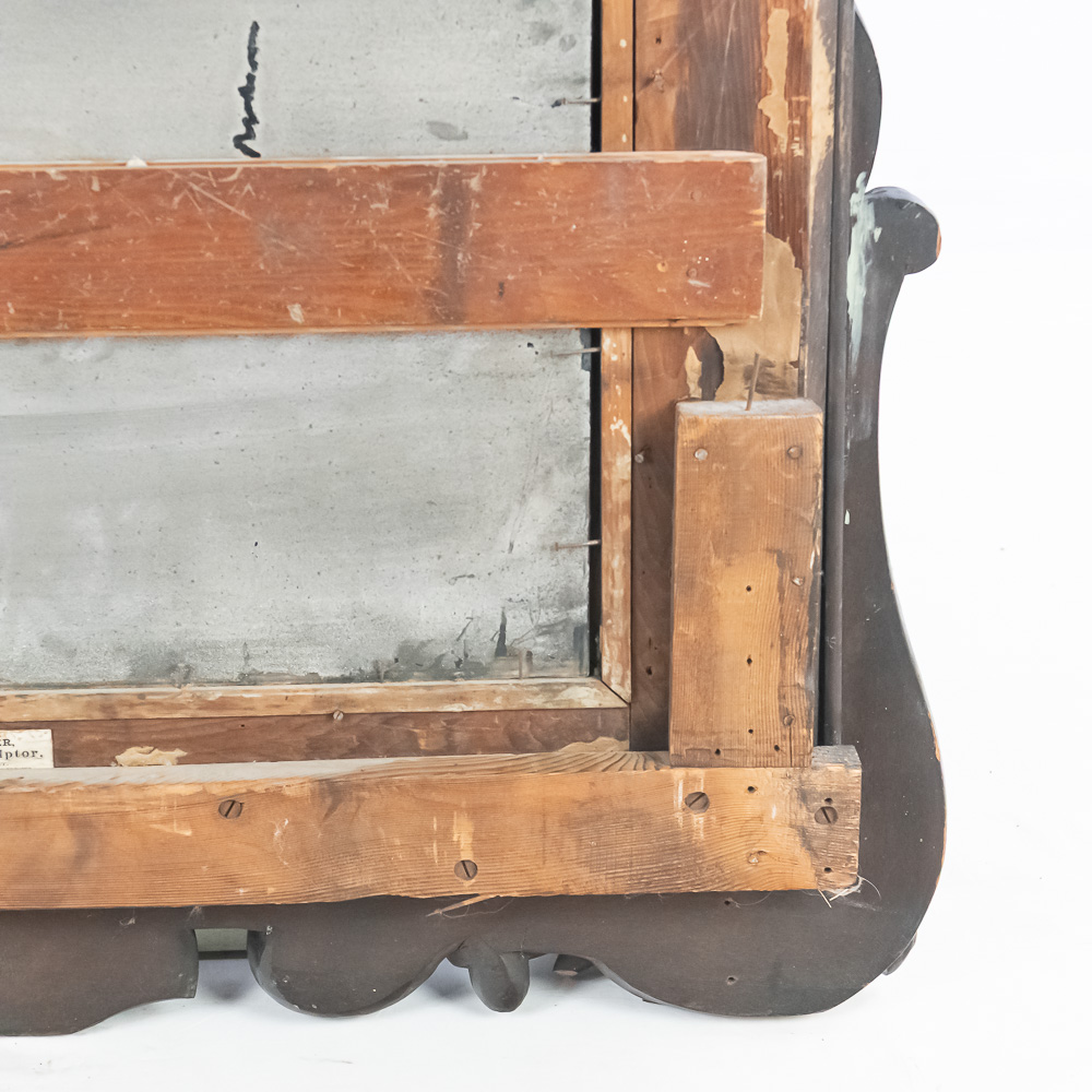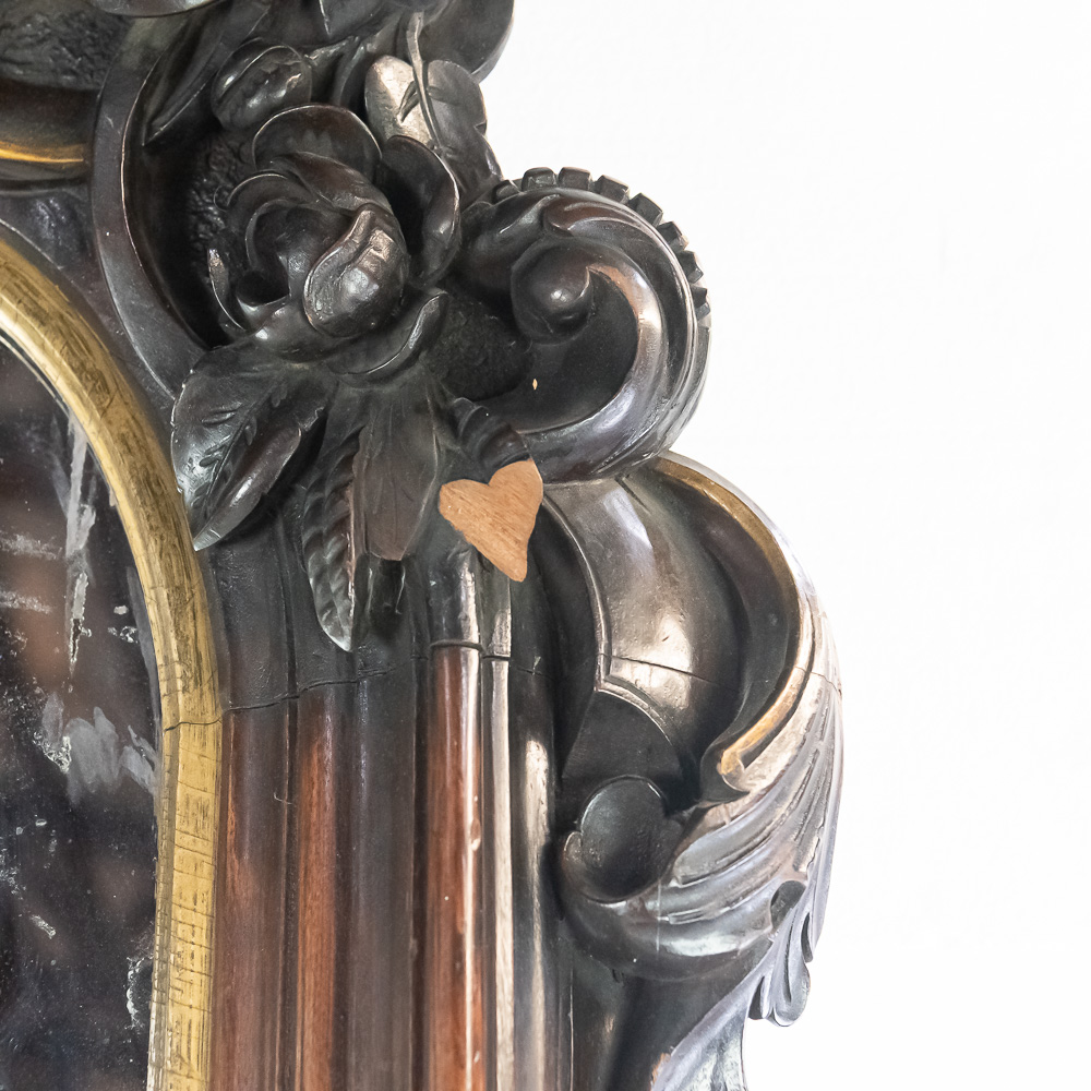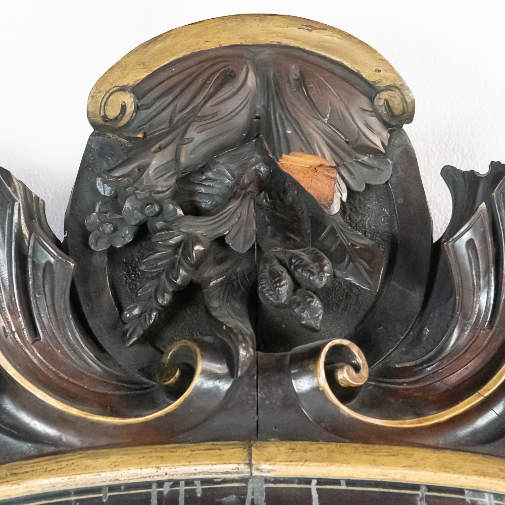 An exceptionally bold and masterfully carved mirror, likely of European origin from the mid-to-late 19th century. This piece has a commanding presence, executed in the Rococo Revival style with deep, intricate carving throughout. Note the fantastic clusters of grapes at the base, the floral and C-scroll motifs, and the impressive pierced crest. The dark-stained hardwood, possibly walnut, provides a rich contrast to the simple gilt liner. This is a true statement piece. The frame has several areas of condition issues, including noticeable chips and losses to the carved elements on the crest, side, and base, exposing the lighter wood underneath. The mirror plate is likely original and shows significant age with de silvering and spotting. Measures 90″ tall, 40″ wide, 4″ deep.