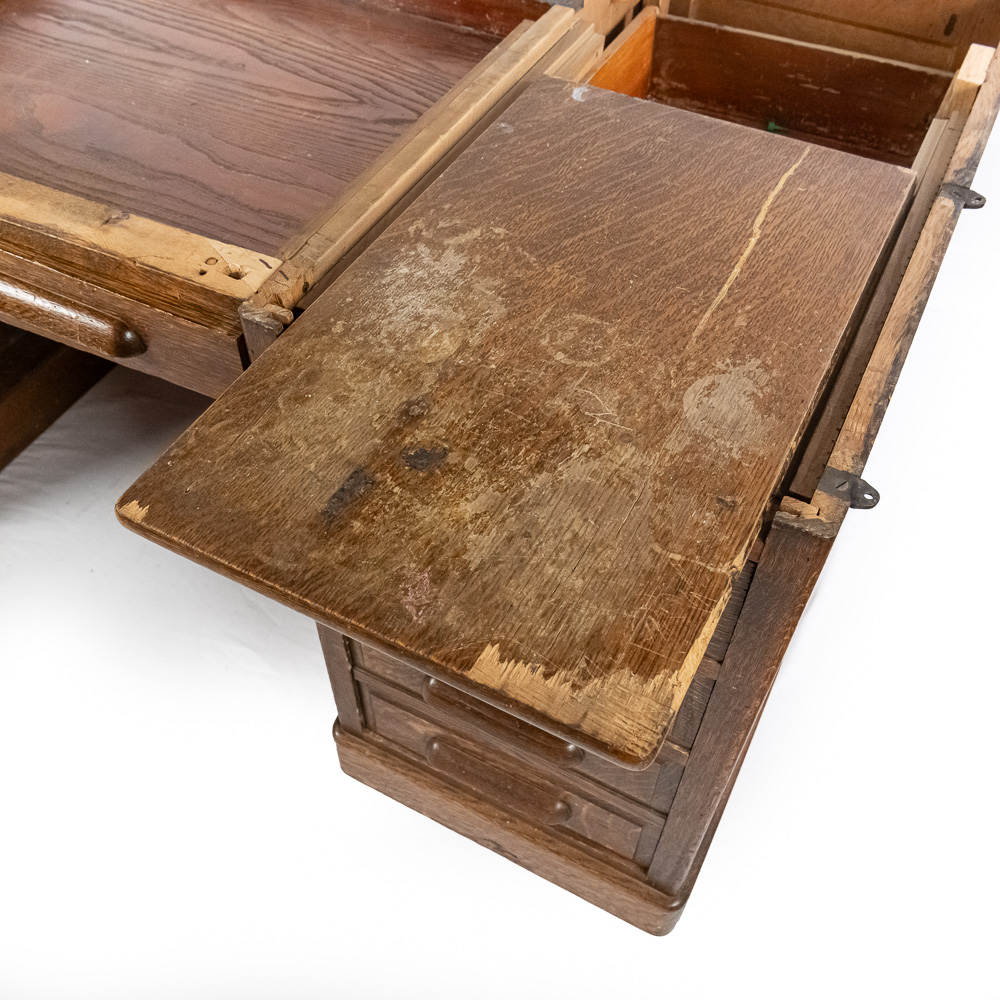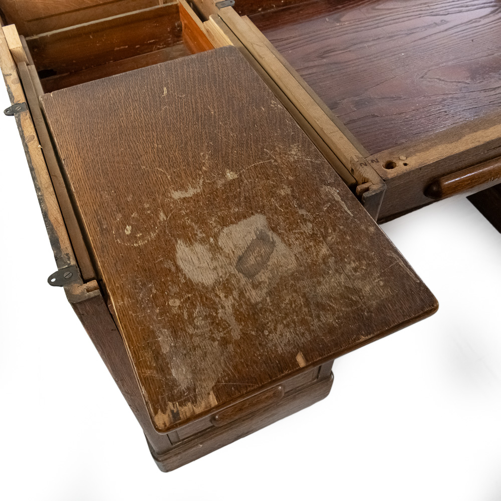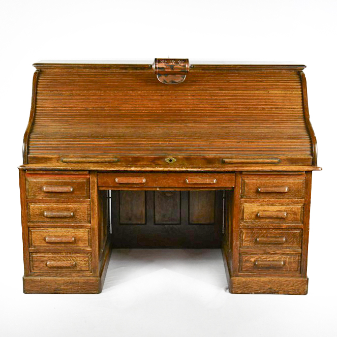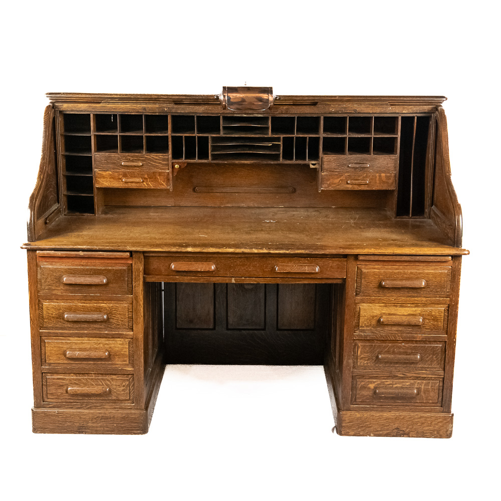 This early 20th-century American oak roll-top desk features a classic “S-curve” tambour roll that retracts to reveal a fitted interior with pigeonholes, drawers, and document slots. The desk stands on twin pedestals, each containing a bank of four graduated drawers with carved wooden pulls, flanking a central kneehole with a single wide drawer. The sides and back are finished with recessed panels. A decorative metal escutcheon is mounted on the roll. Condition notes include significant surface wear, scratches, and finish loss to the writing surface and pull-out writing slides. There is visible wear to the finish on the tambour slats and pedestal edges. Est. 50″ H x 60″ W x 34″ D. Note: Pickup/Transport required. Contacts available post auction.