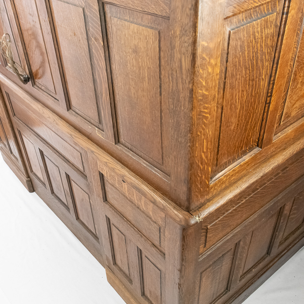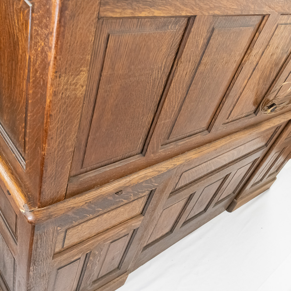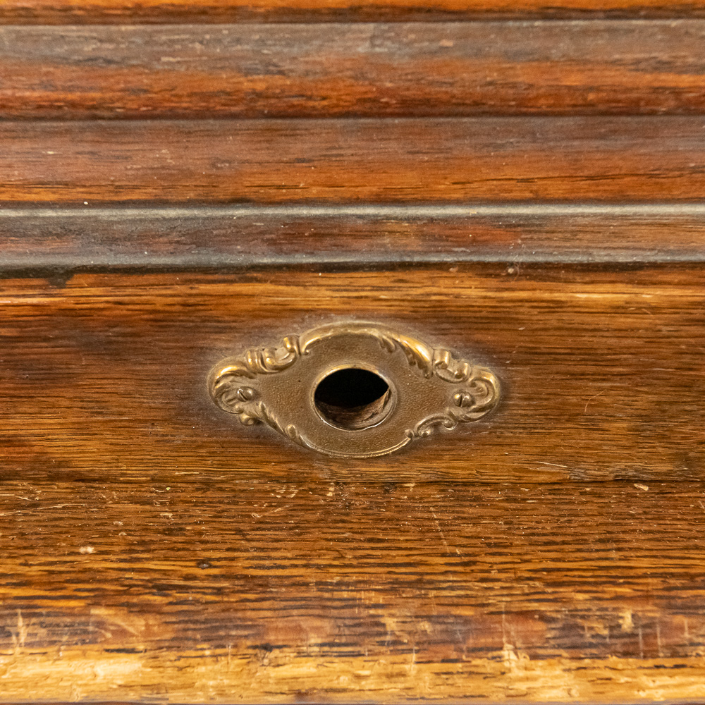This early 20th-century American oak roll-top desk features a classic “S-curve” tambour roll that retracts to reveal a fitted interior with pigeonholes, drawers, and document slots. The desk stands on twin pedestals, each containing a bank of four graduated drawers with carved wooden pulls, flanking a central kneehole with a single wide drawer. The sides and back are finished with recessed panels. A decorative metal escutcheon is mounted on the roll. Condition notes include significant surface wear, scratches, and finish loss to the writing surface and pull-out writing slides. There is visible wear to the finish on the tambour slats and pedestal edges. Est. 50″ H x 60″ W x 34″ D. Note: Pickup/Transport required. Contacts available post auction.