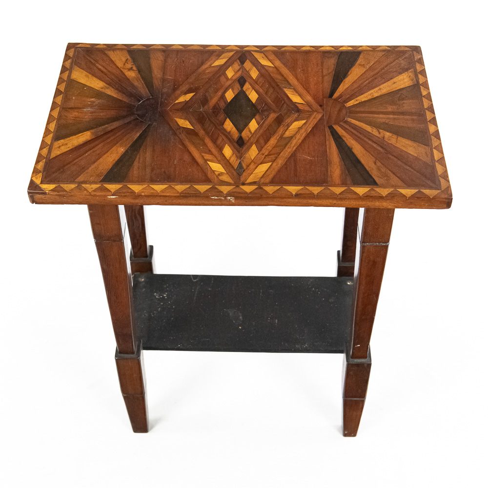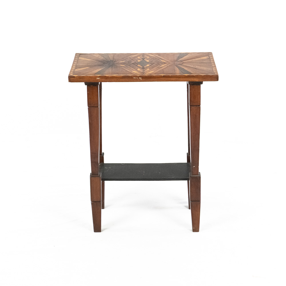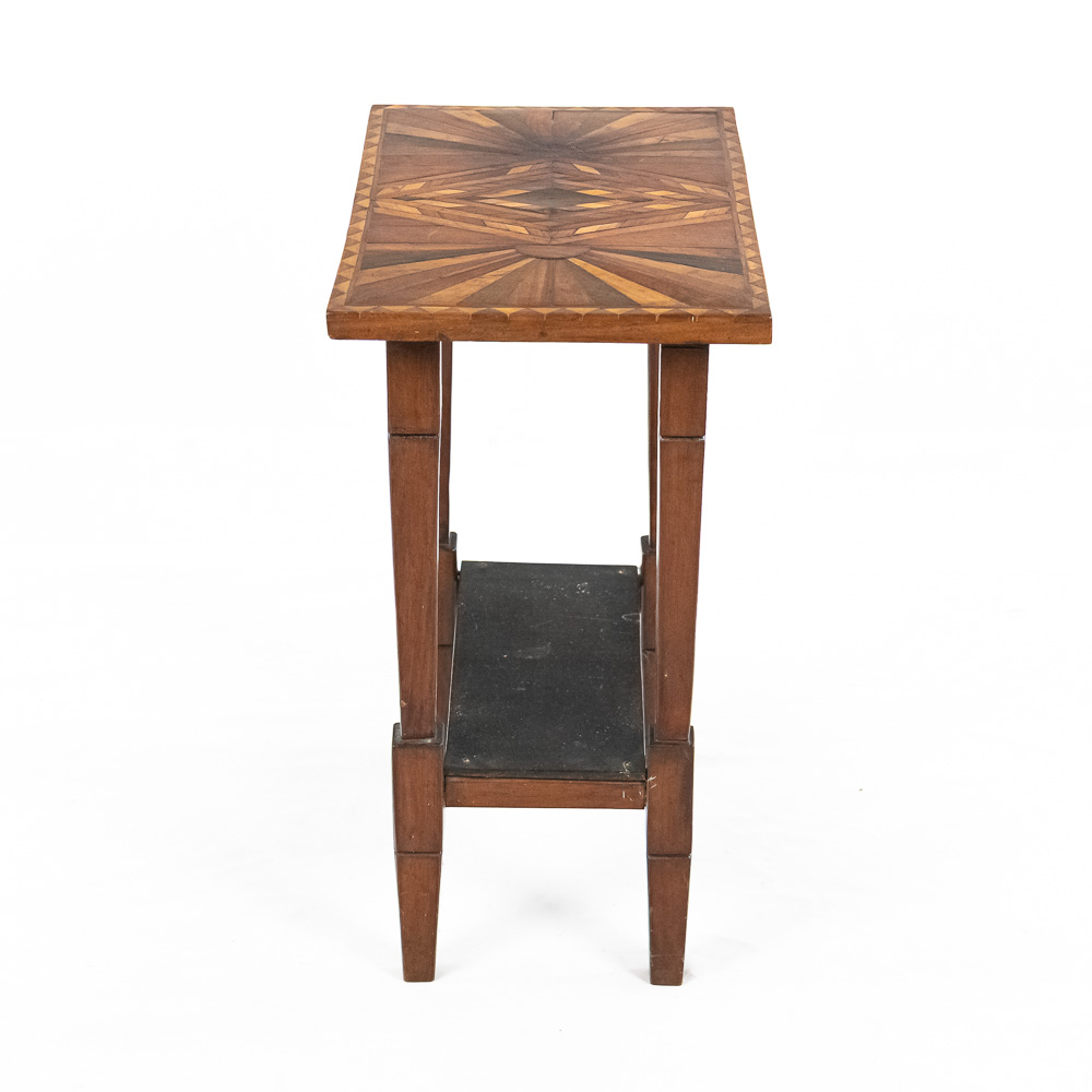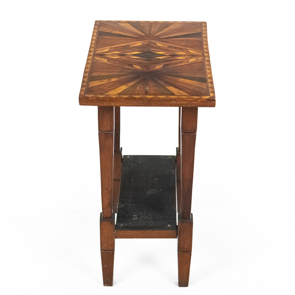Handsome accent table featuring attractive “Sunburst” marquetry tabletop. Very good overall condition with minimal signs of age and wear; 24″t x 12.5″d x 20″. Please use photos to judge condition and bid accordingly.