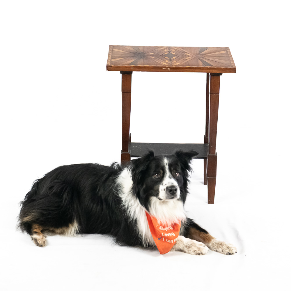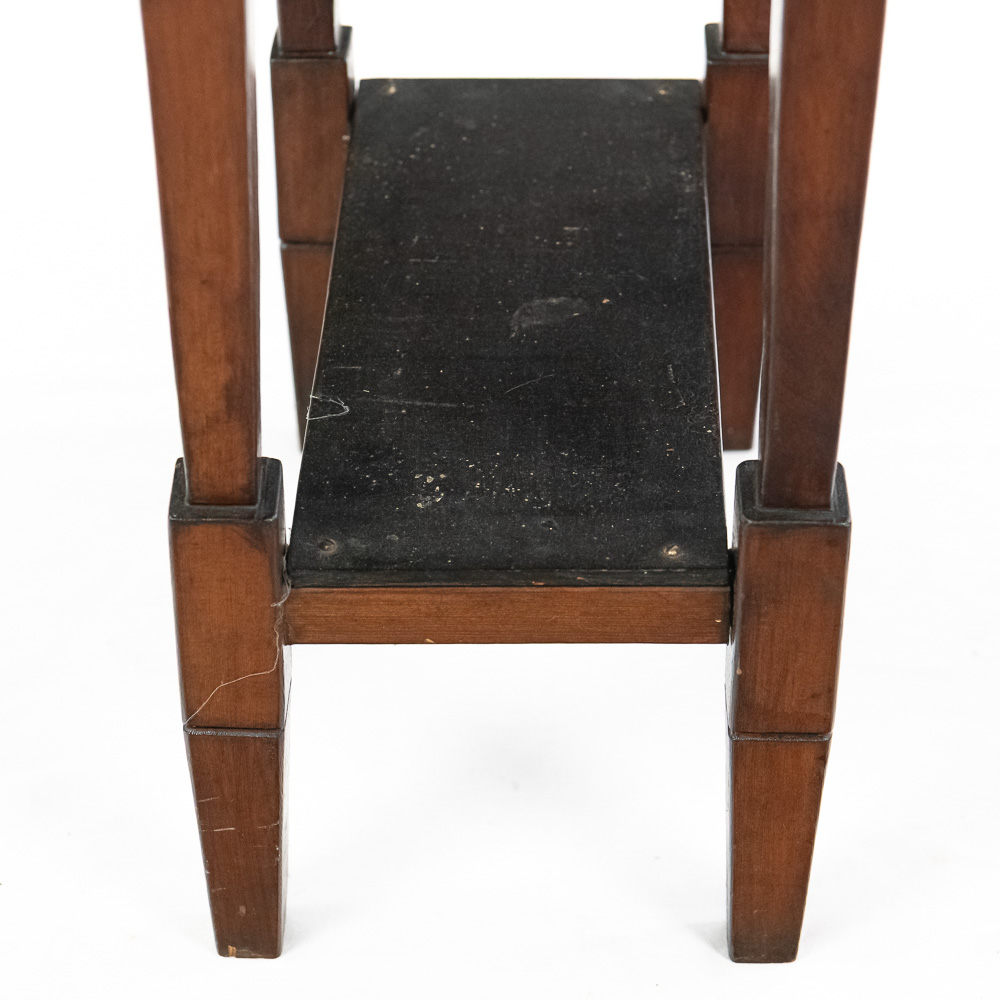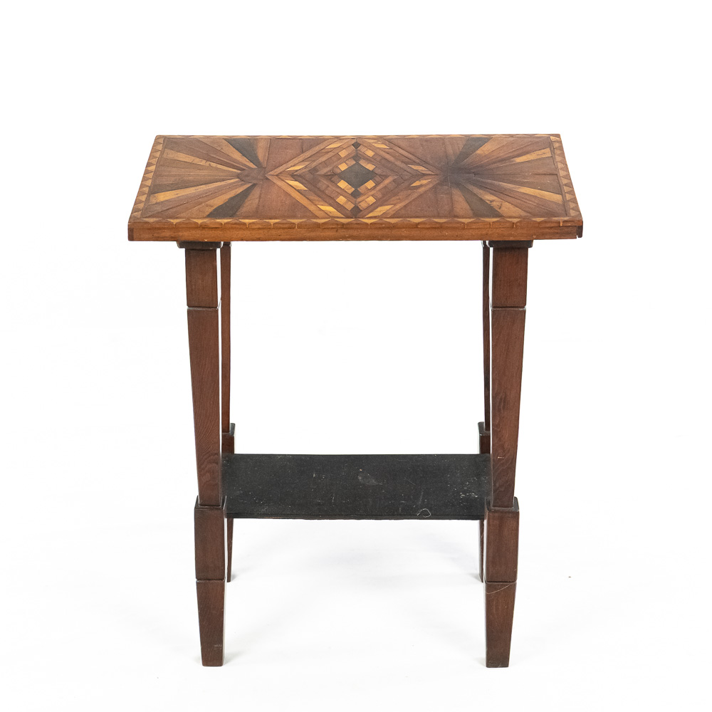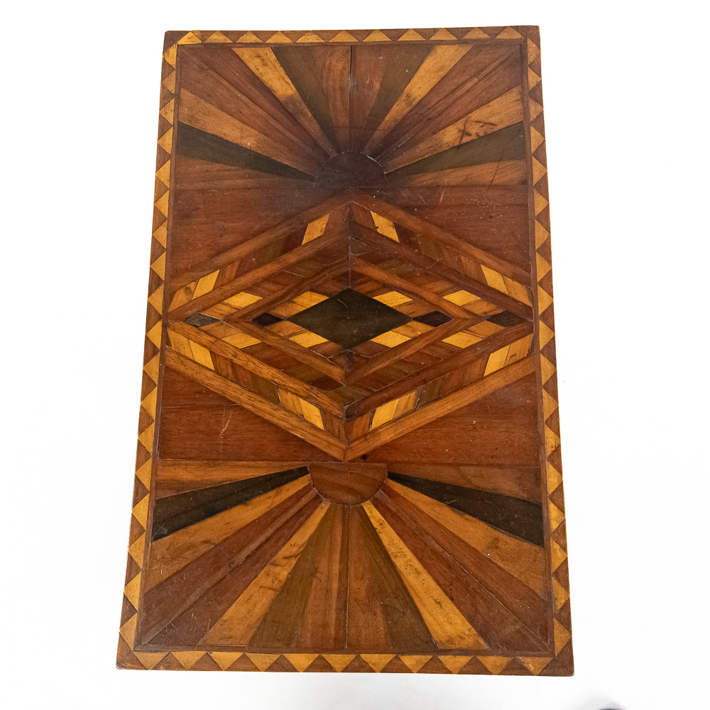 Handsome accent table featuring attractive “Sunburst” marquetry tabletop. Very good overall condition with minimal signs of age and wear; 24″t x 12.5″d x 20″. Please use photos to judge condition and bid accordingly.