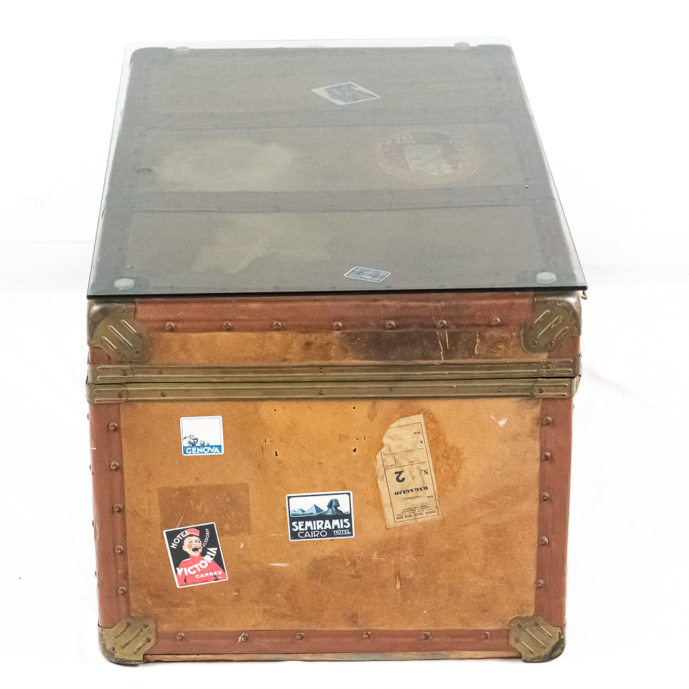 A great cocktail or end table using a vintage leather travel trunk with old travel stickers on it topped by a custom cut glass top. In VG condition. Measures 32″ wide, 16″ tall, 19″ deep.