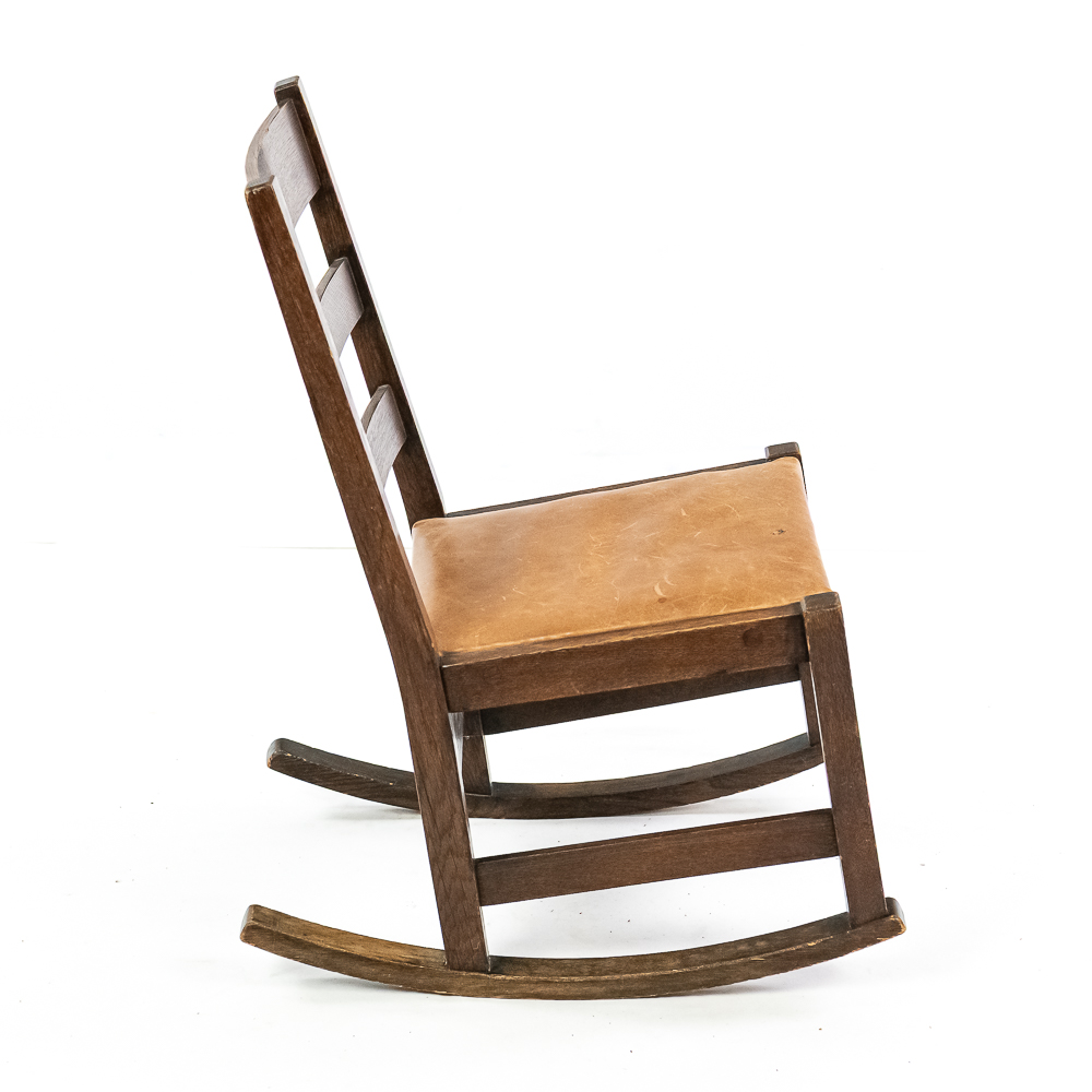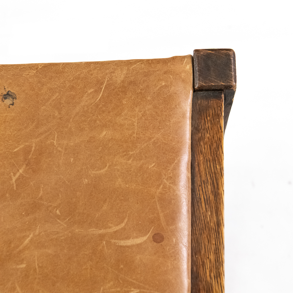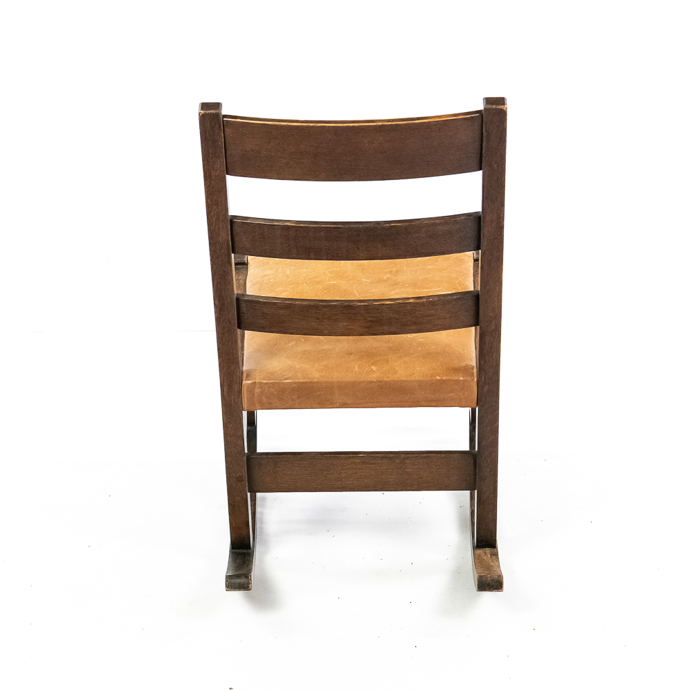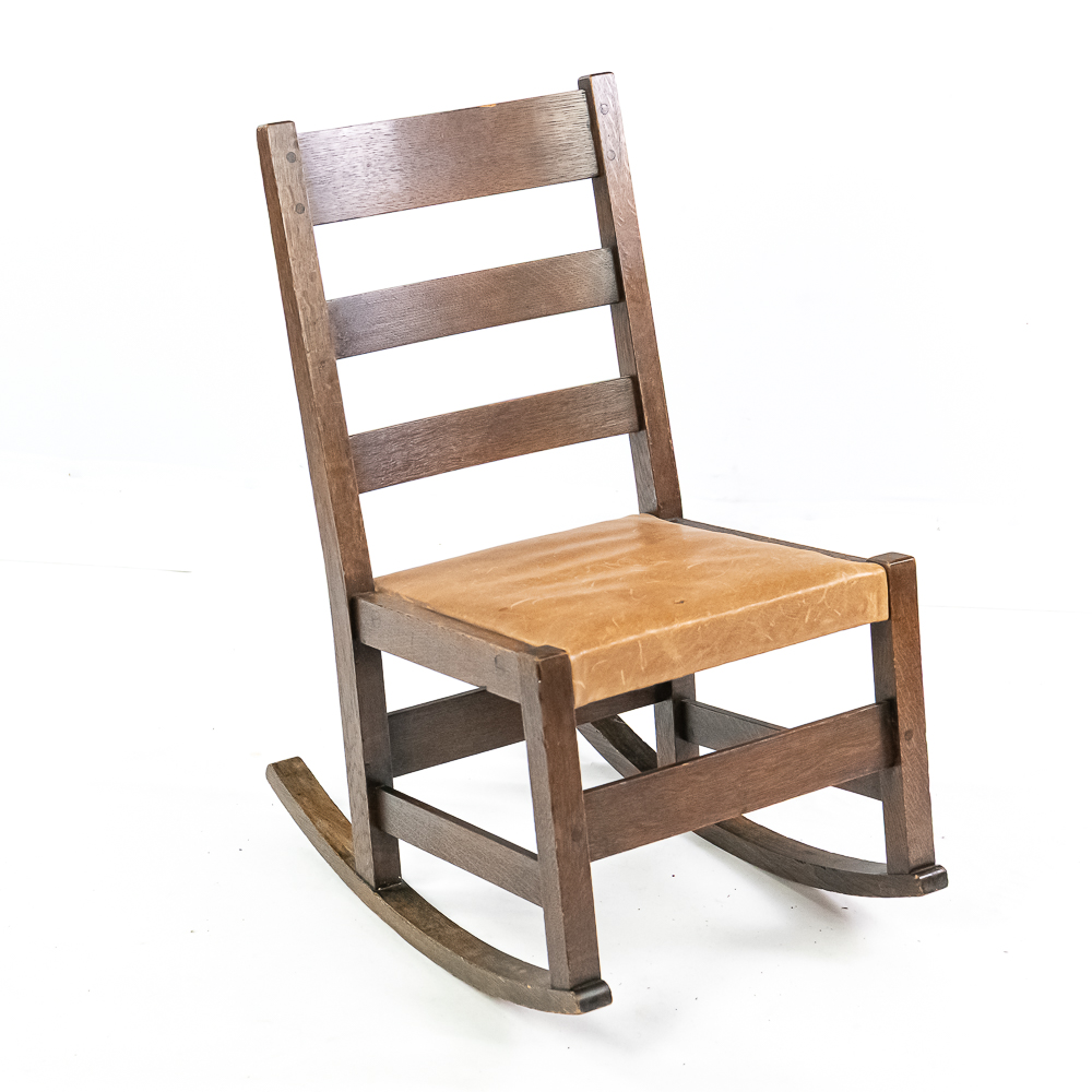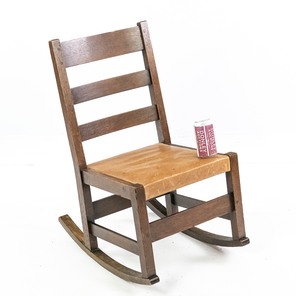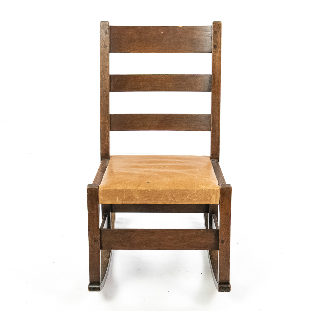 This is an exceptional example of Arts and Crafts furniture, a slat-back rocking chair by the renowned L. & J.G. Stickley company, confirming its manufacture in Fayetteville, New York, circa 1905-1920. The form is quintessential Mission style, featuring robust, rectilinear quartersawn oak construction with the exposed tenons and pegged joints that define the aesthetic championed by the Stickley brothers. This rocker features a straight back with three horizontal slats and a comfortable, square, drop-in seat. The seat is currently fitted with a distressed tanned leather over-upholstery, secured with decorative tacks. The wood exhibits a beautiful, dark-fumed patina, suggesting a well-maintained, original finish, though there is typical age-related wear, including minor scuffing to the rockers and edges. The leather is heavily patinated with cracking, fading, and some small tears, especially around the edges, but the overall structure is solid and sound. H 30″, W 17″, D 23″.