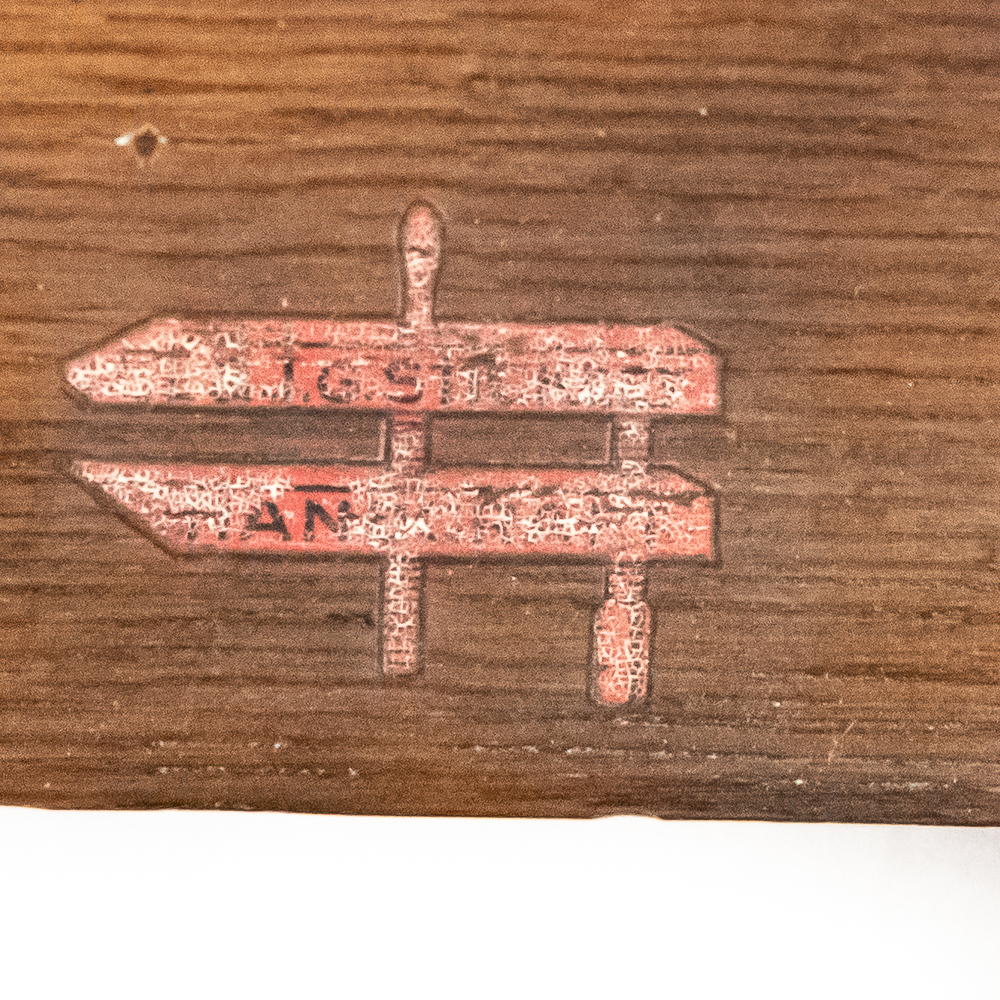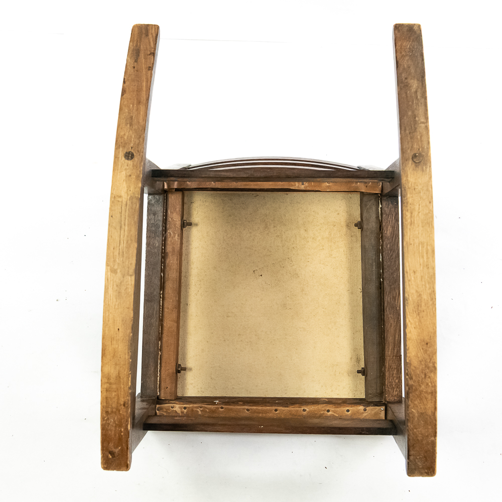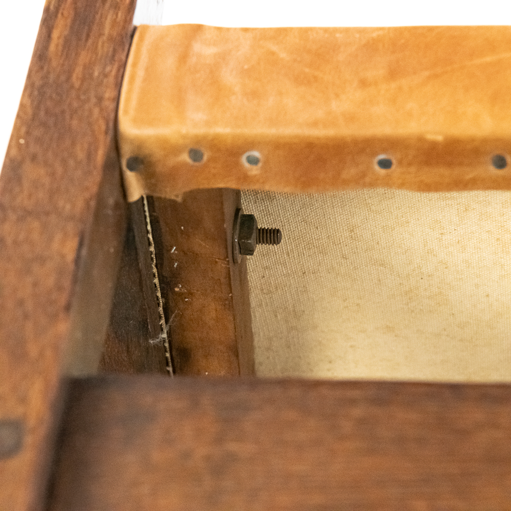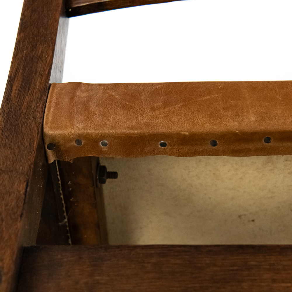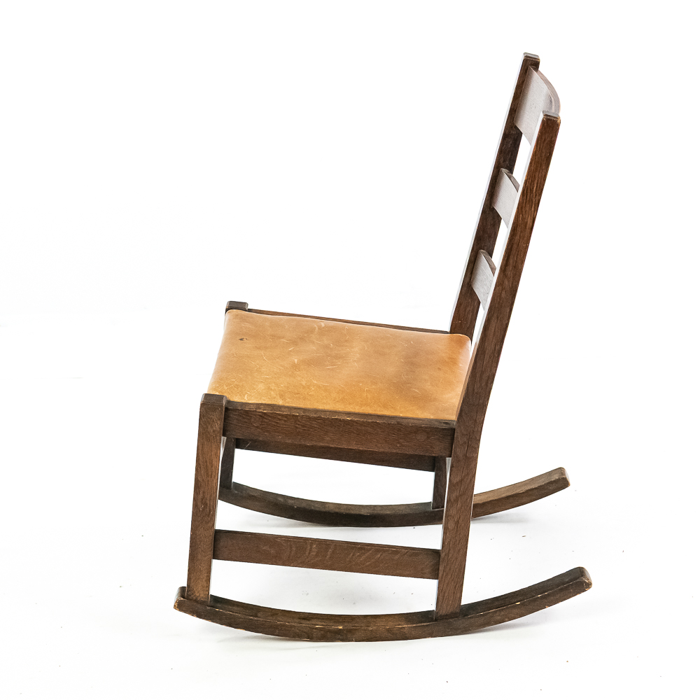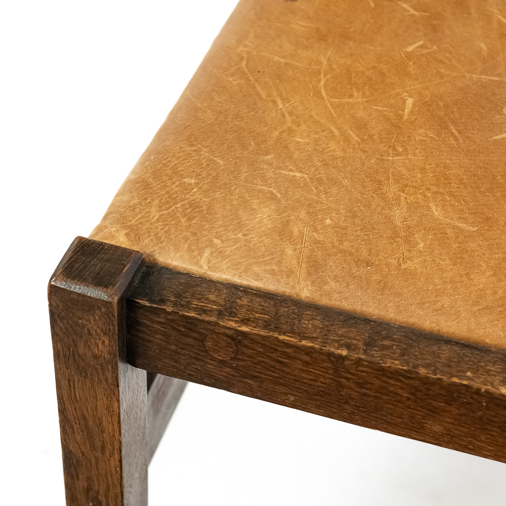 This is an exceptional example of Arts and Crafts furniture, a slat-back rocking chair by the renowned L. & J.G. Stickley company, confirming its manufacture in Fayetteville, New York, circa 1905-1920. The form is quintessential Mission style, featuring robust, rectilinear quartersawn oak construction with the exposed tenons and pegged joints that define the aesthetic championed by the Stickley brothers. This rocker features a straight back with three horizontal slats and a comfortable, square, drop-in seat. The seat is currently fitted with a distressed tanned leather over-upholstery, secured with decorative tacks. The wood exhibits a beautiful, dark-fumed patina, suggesting a well-maintained, original finish, though there is typical age-related wear, including minor scuffing to the rockers and edges. The leather is heavily patinated with cracking, fading, and some small tears, especially around the edges, but the overall structure is solid and sound. H 30″, W 17″, D 23″.