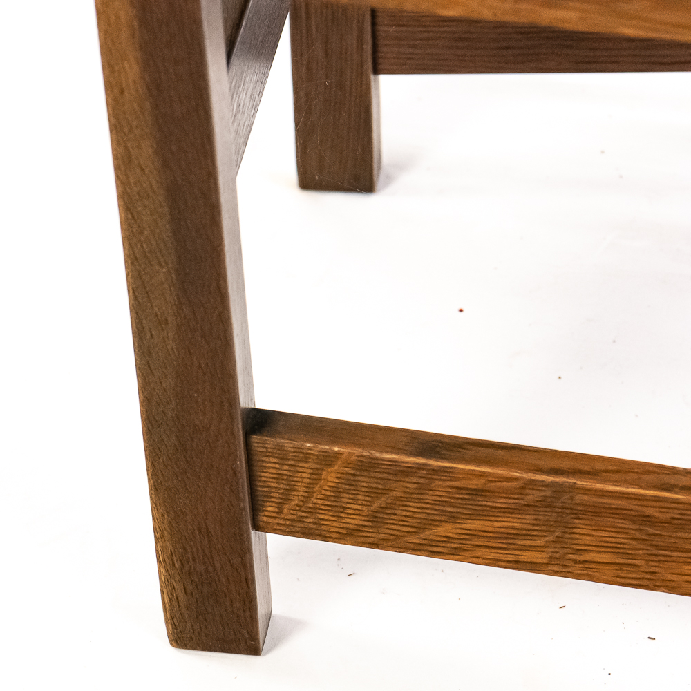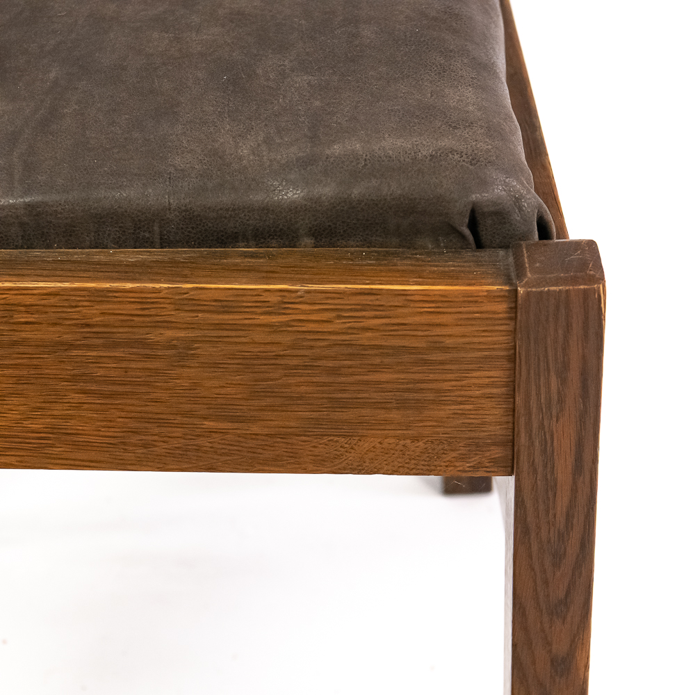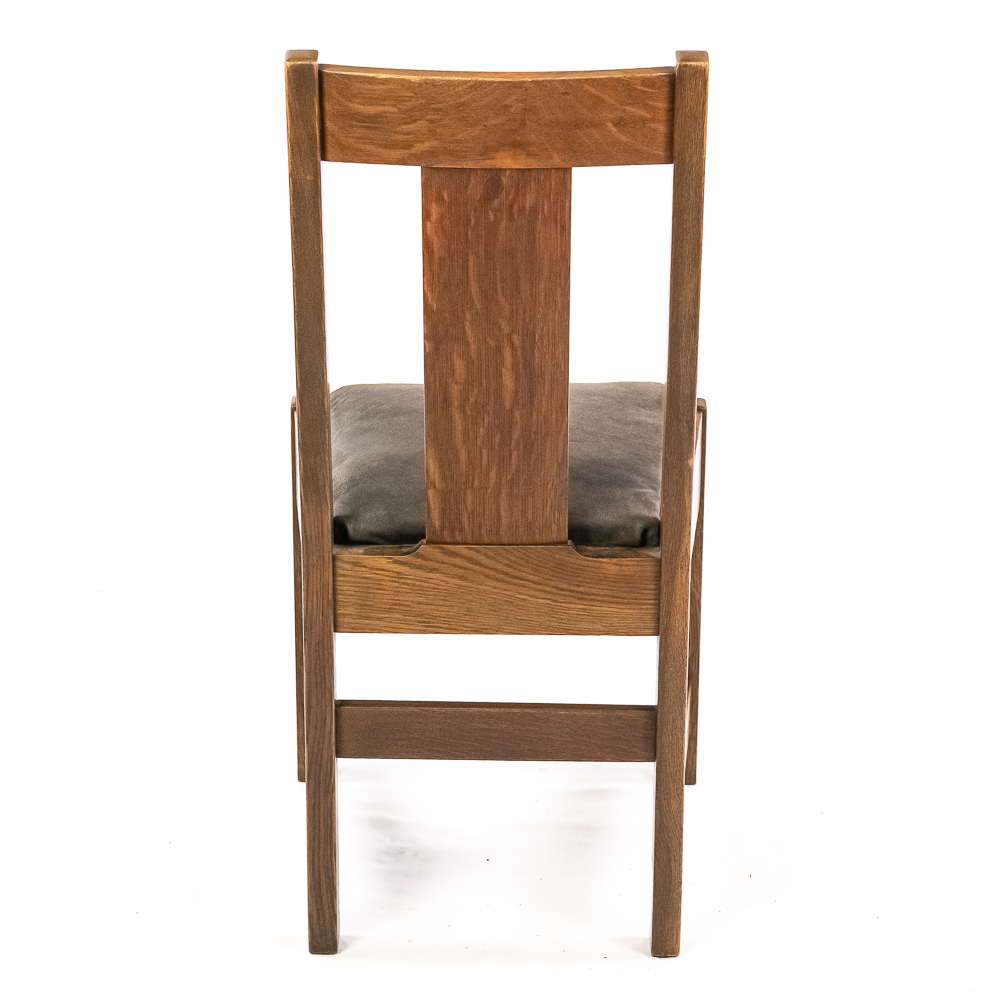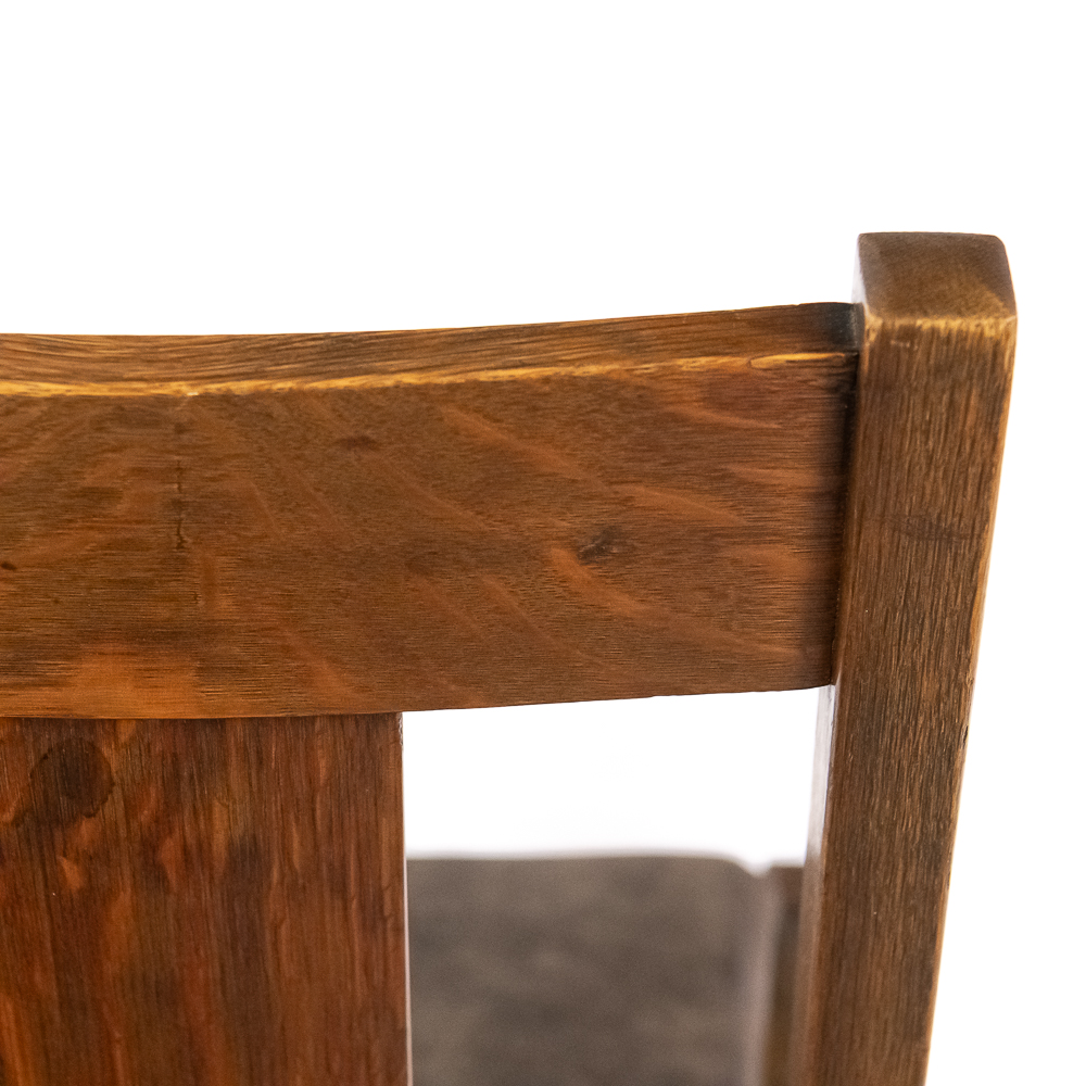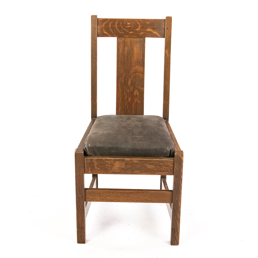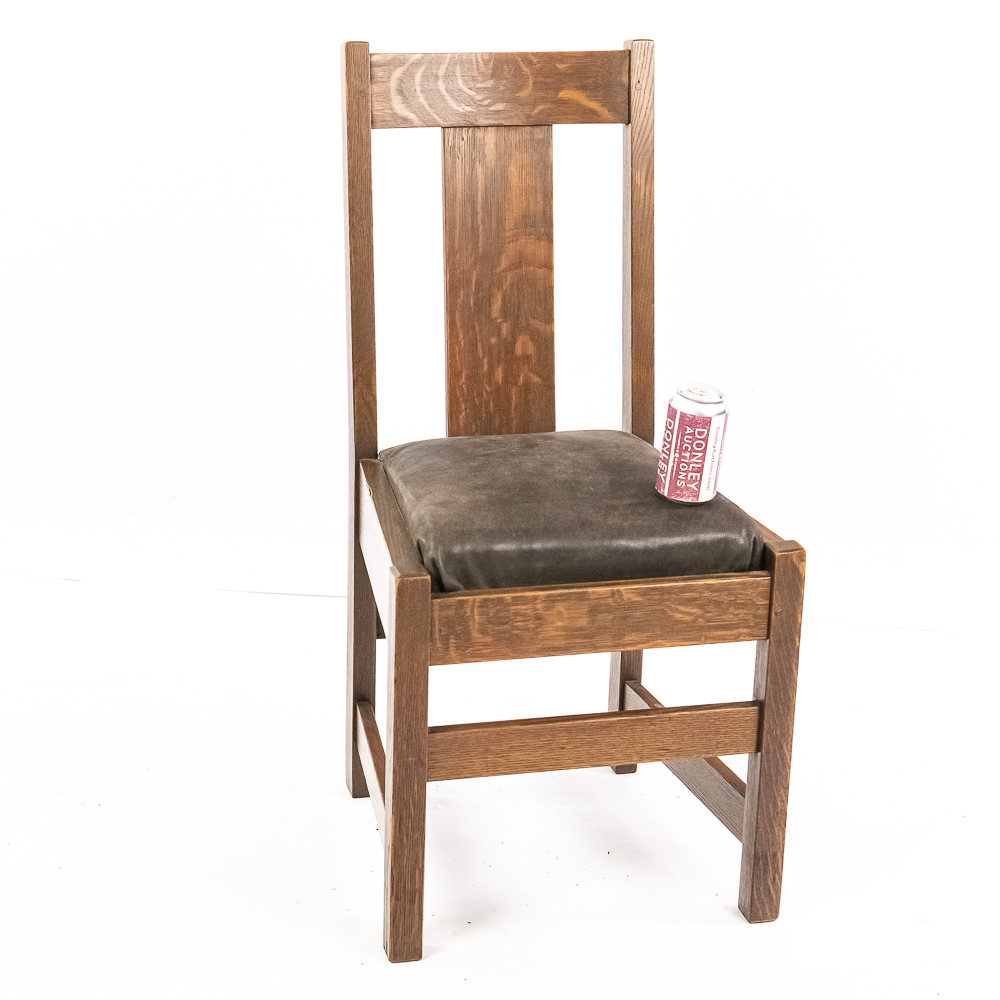 This is a superb example of a classic Arts and Crafts period dining chair, manufactured by the Grand Rapids Bookcase & Chair Co. of Hastings, Michigan, under their coveted Lifetime Furniture brand, as confirmed by the original paper label. The chair’s form is archetypal Mission style, featuring quarter sawn oak with a rich, dark patina that highlights the beautiful grain. It boasts a sturdy, rectilinear frame with thick posts and a broad, slightly trapezoidal splat back. The seat appears to be an original or early brown leather, characteristic of the era’s preference for natural, durable materials. The chair is in excellent antique condition for its age, showing minor wear consistent with use, such as light scuffs and marks to the wood, and some faint creasing or surface wear on the upholstered seat. The structure appears sound and tight. The chair number “130” is hand-written on the label. H 37″, W 18″, D 17.5″