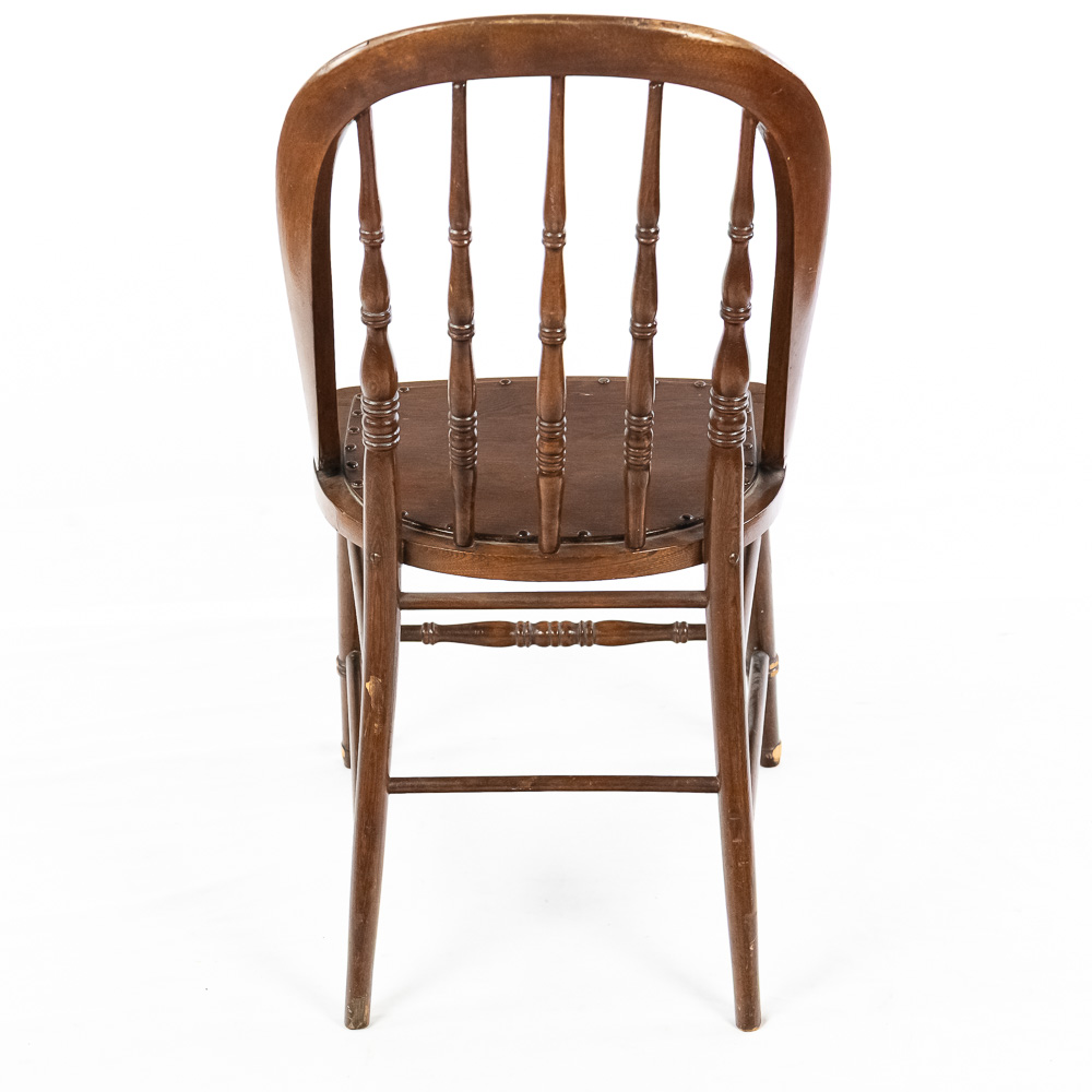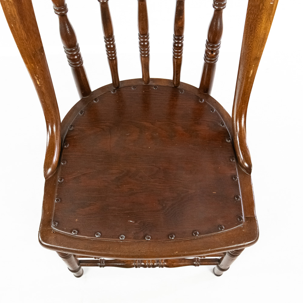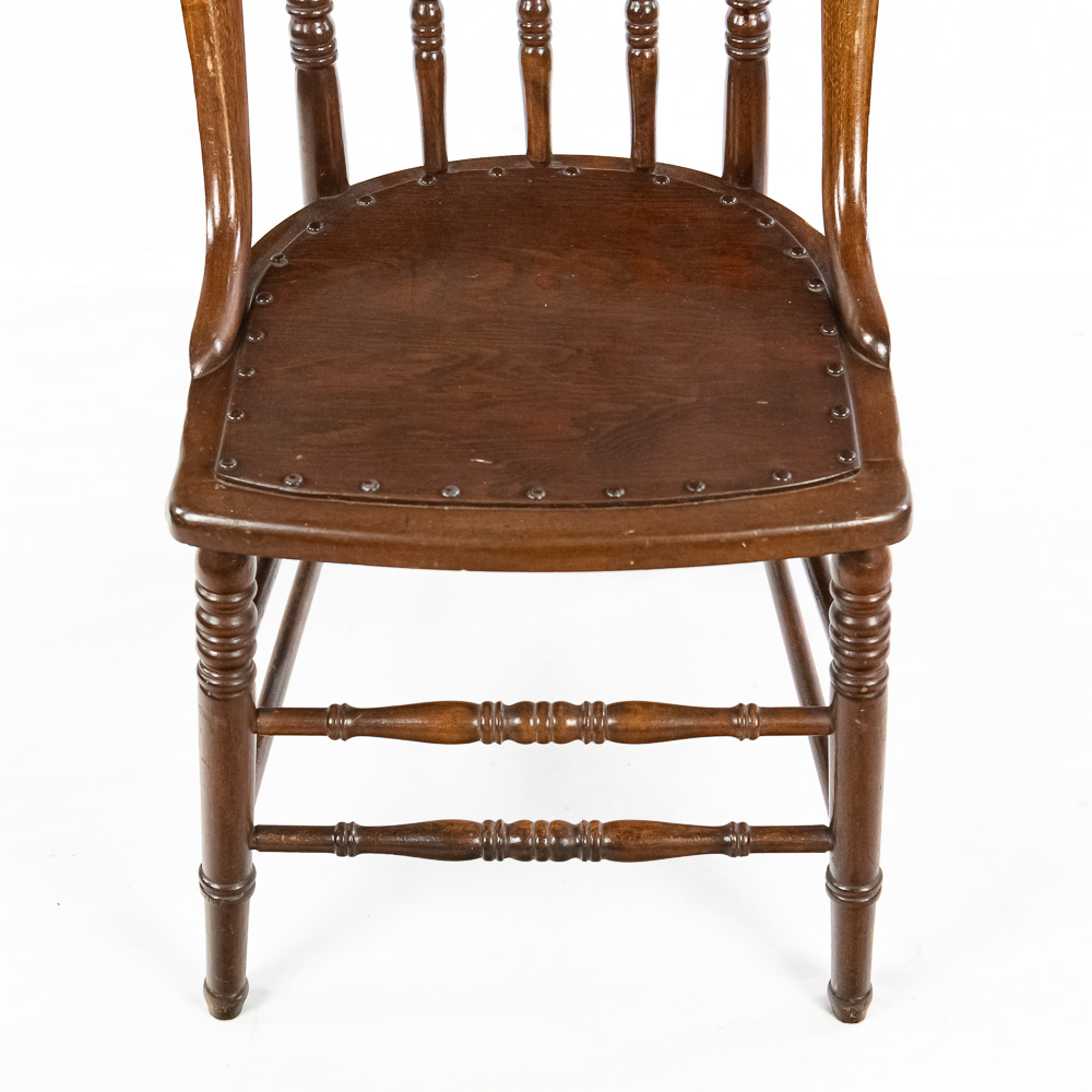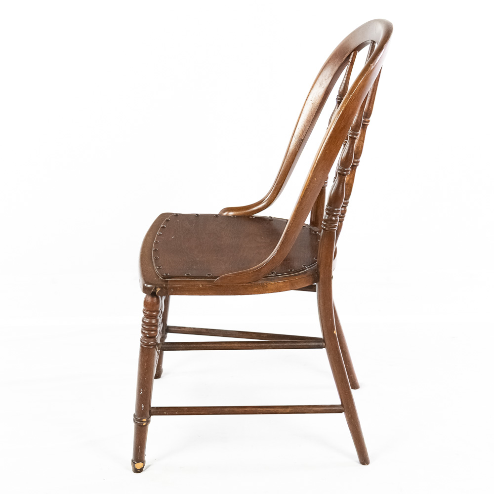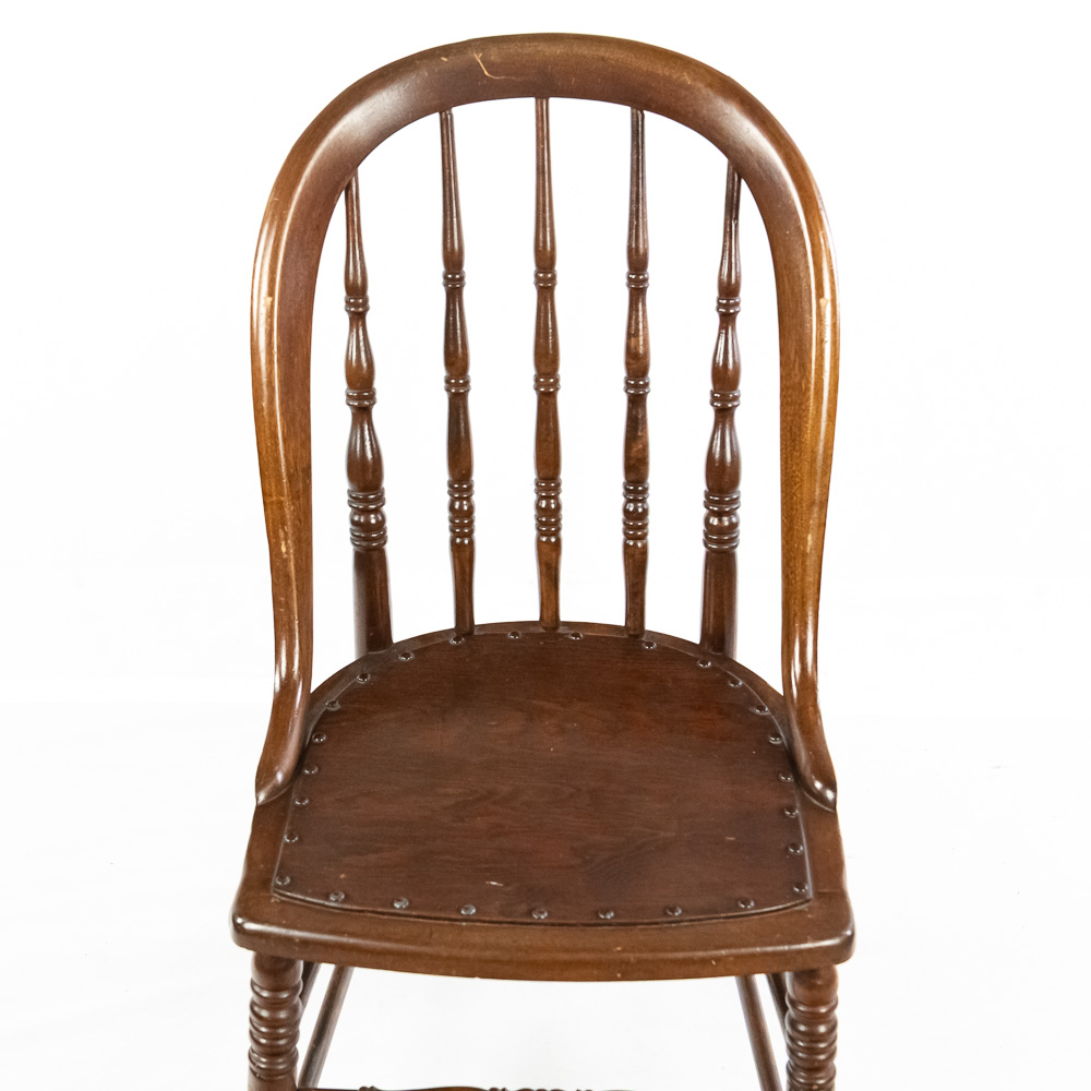 Lovely antique farmhouse Windsor hoop back spindle back dining chair featuring saddle shaped seat with nail head accents. Very good overall condition with some minor scratches noted. Approximately 36.5″t x 16.5″d x 17.5″l. Perfect addition to your household, please use photos to judge condition and bid accordingly.