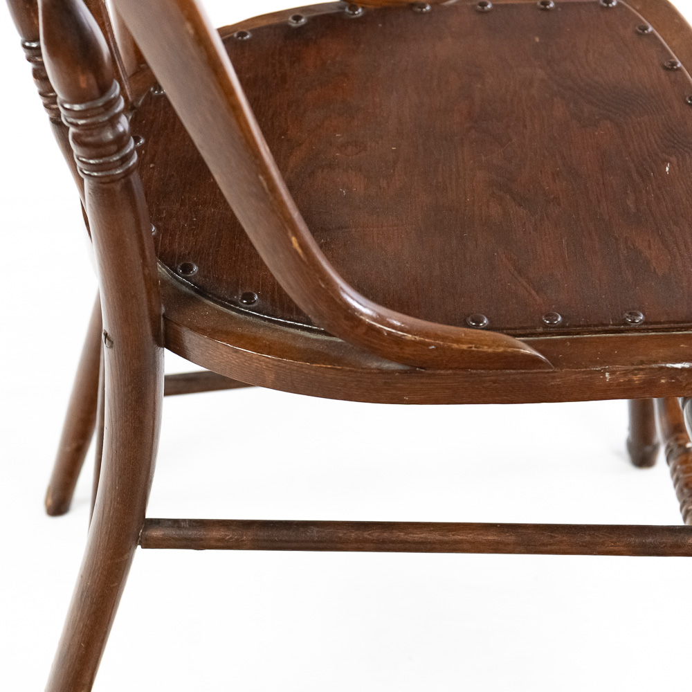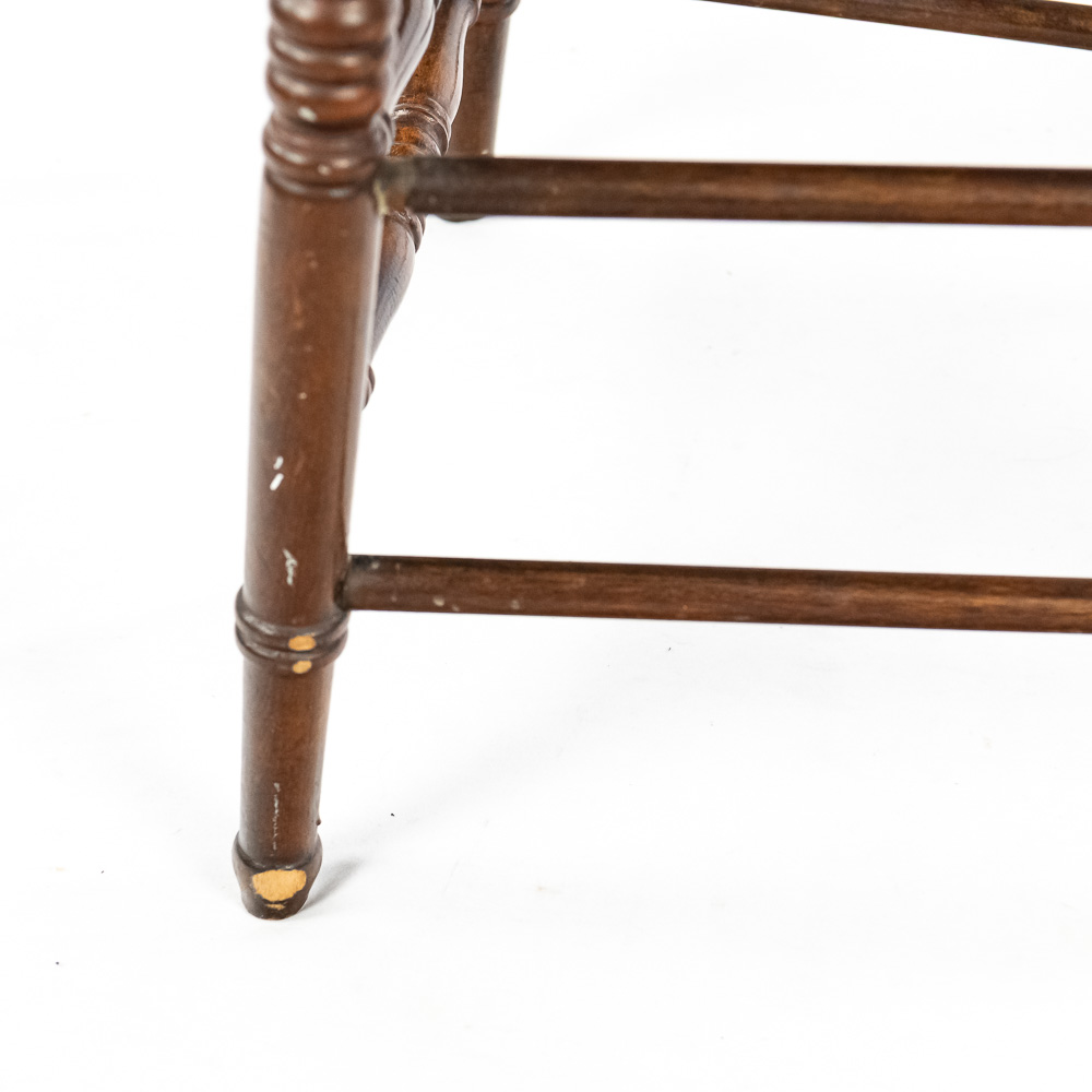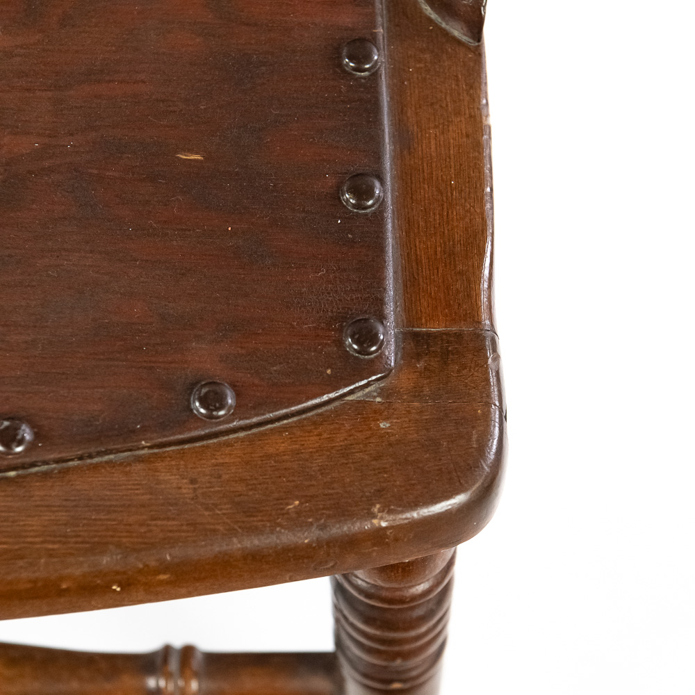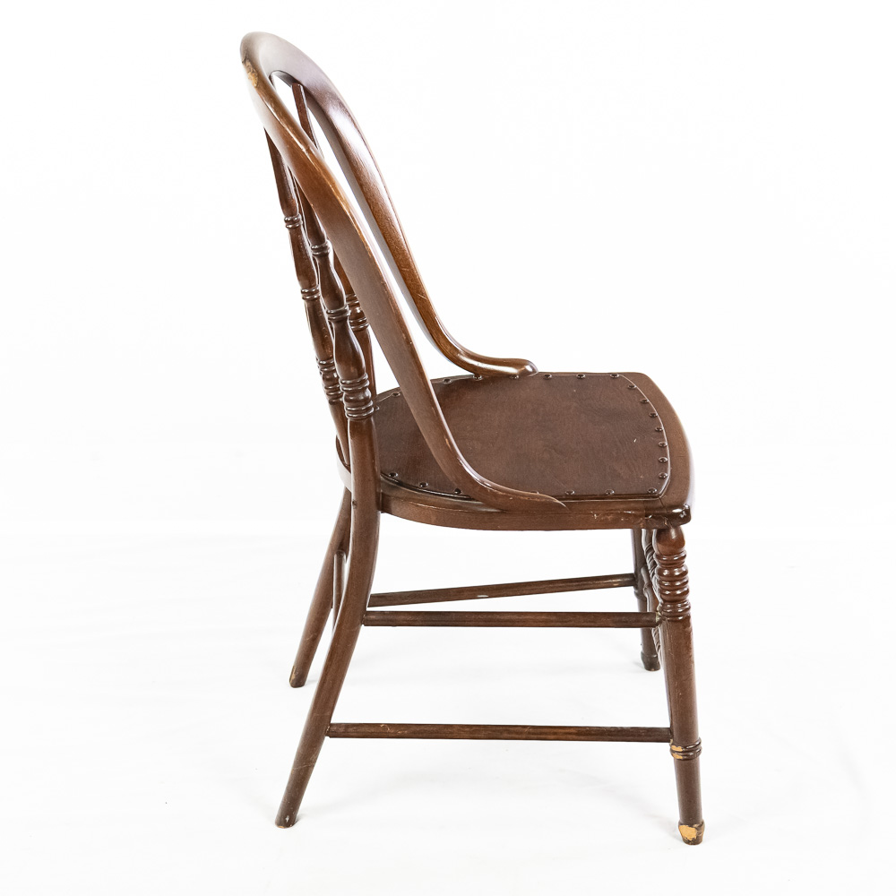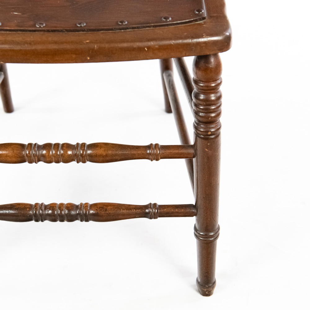 Lovely antique farmhouse Windsor hoop back spindle back dining chair featuring saddle shaped seat with nail head accents. Very good overall condition with some minor scratches noted. Approximately 36.5″t x 16.5″d x 17.5″l. Perfect addition to your household, please use photos to judge condition and bid accordingly.