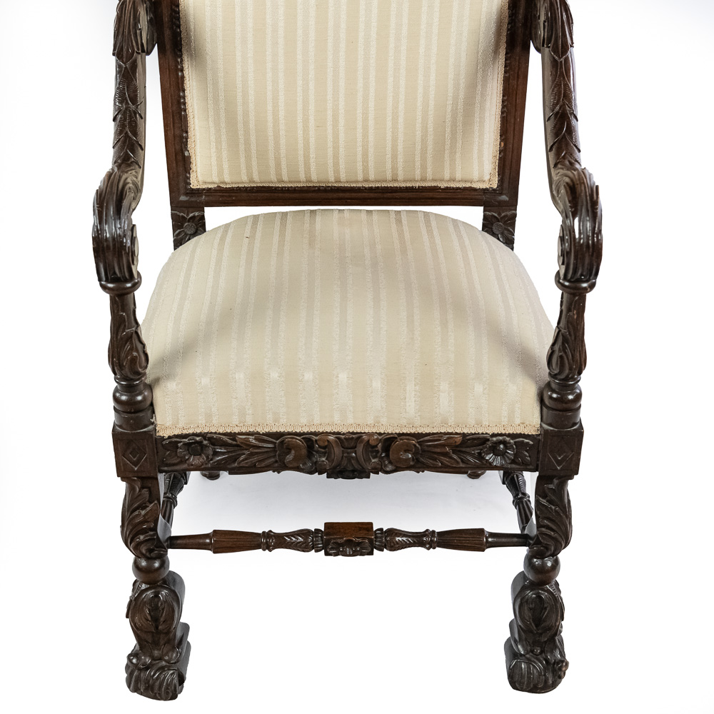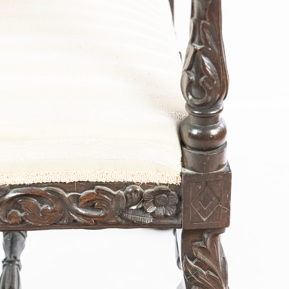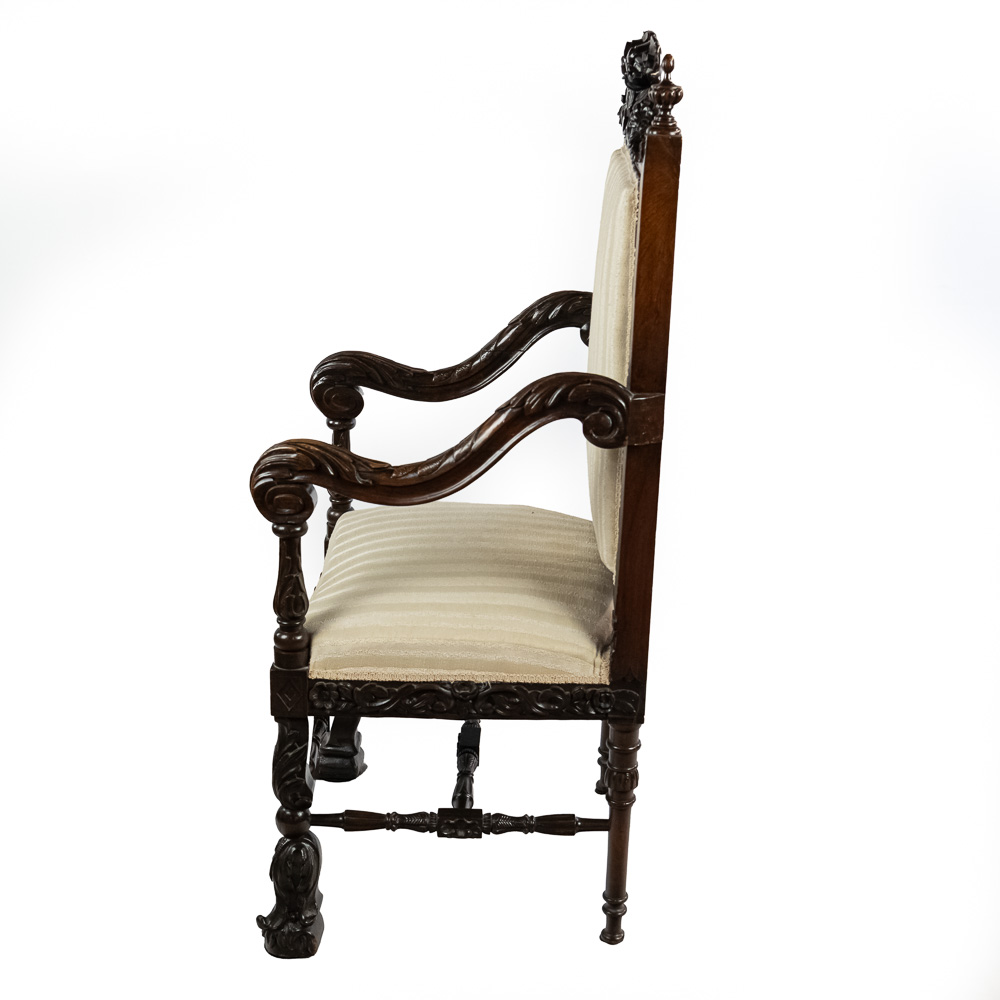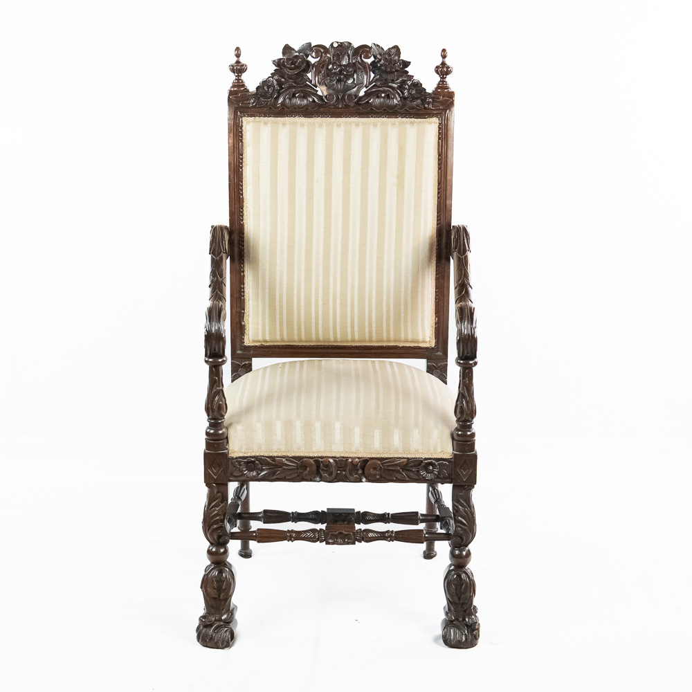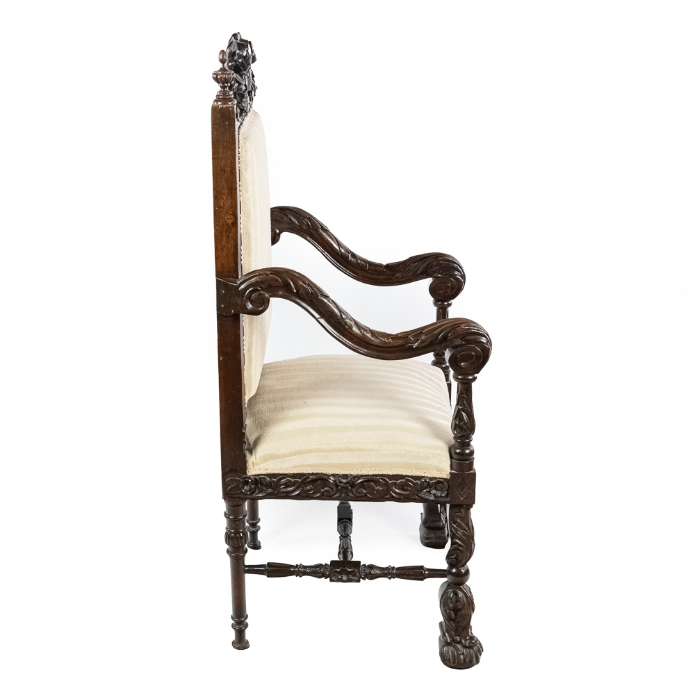 Handsome antique Louis XIII inspired upholstered Kings armchair. Attractive Baroque arm chair featuring solid oak construction with remarkable carved acnathus leaf details. Very good overall condition with minimal signs of age and wear; presents extremely well. Approximately 51″t x 22″d x 24″l, perfect addition to your household. Please use photos to judge condition and bid accordingly.