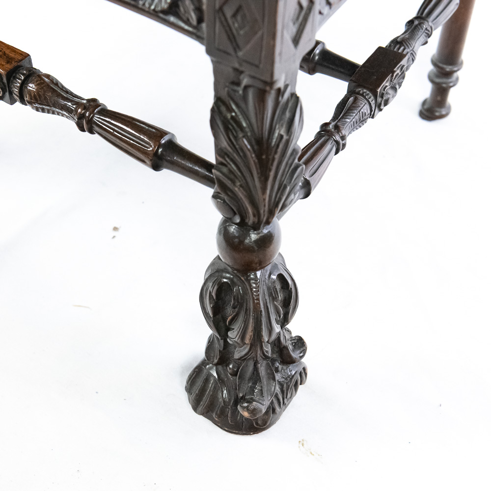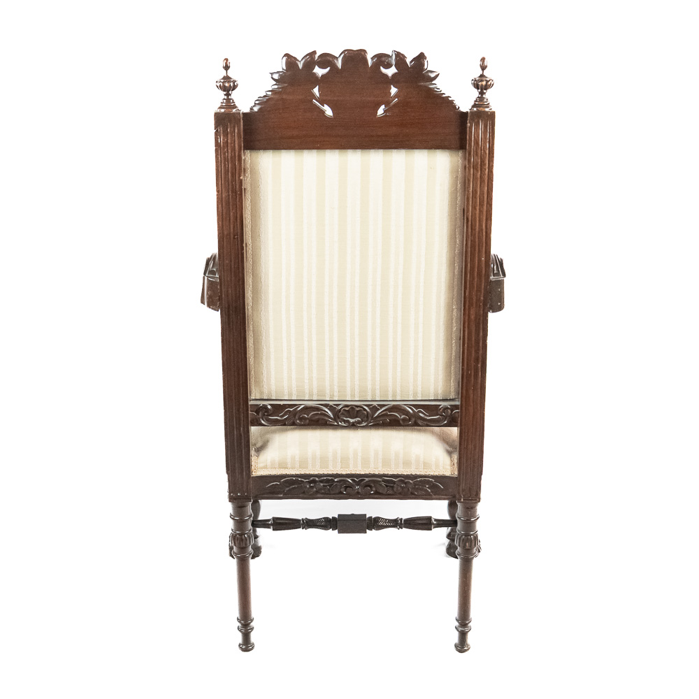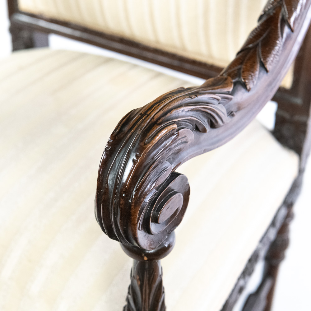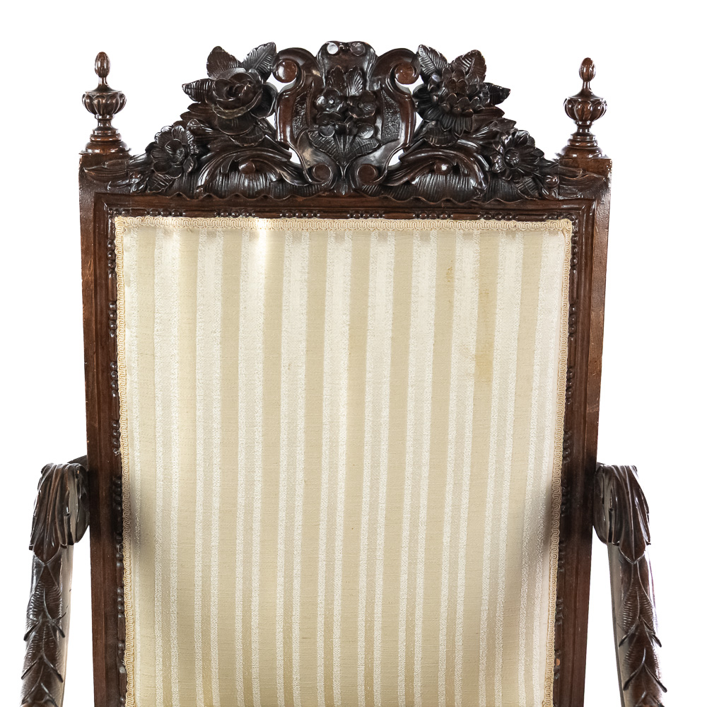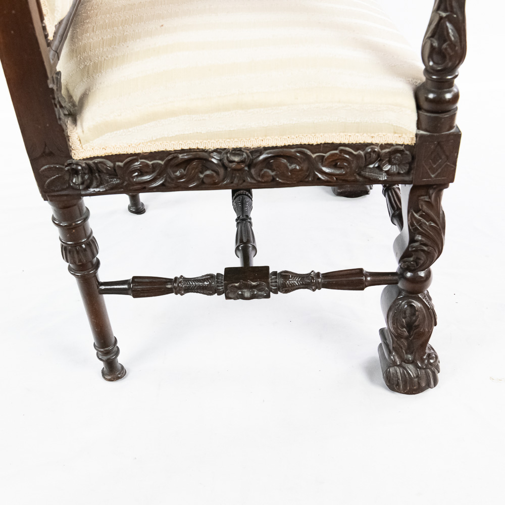 Handsome antique Louis XIII inspired upholstered Kings armchair. Attractive Baroque arm chair featuring solid oak construction with remarkable carved acnathus leaf details. Very good overall condition with minimal signs of age and wear; presents extremely well. Approximately 51″t x 22″d x 24″l, perfect addition to your household. Please use photos to judge condition and bid accordingly.