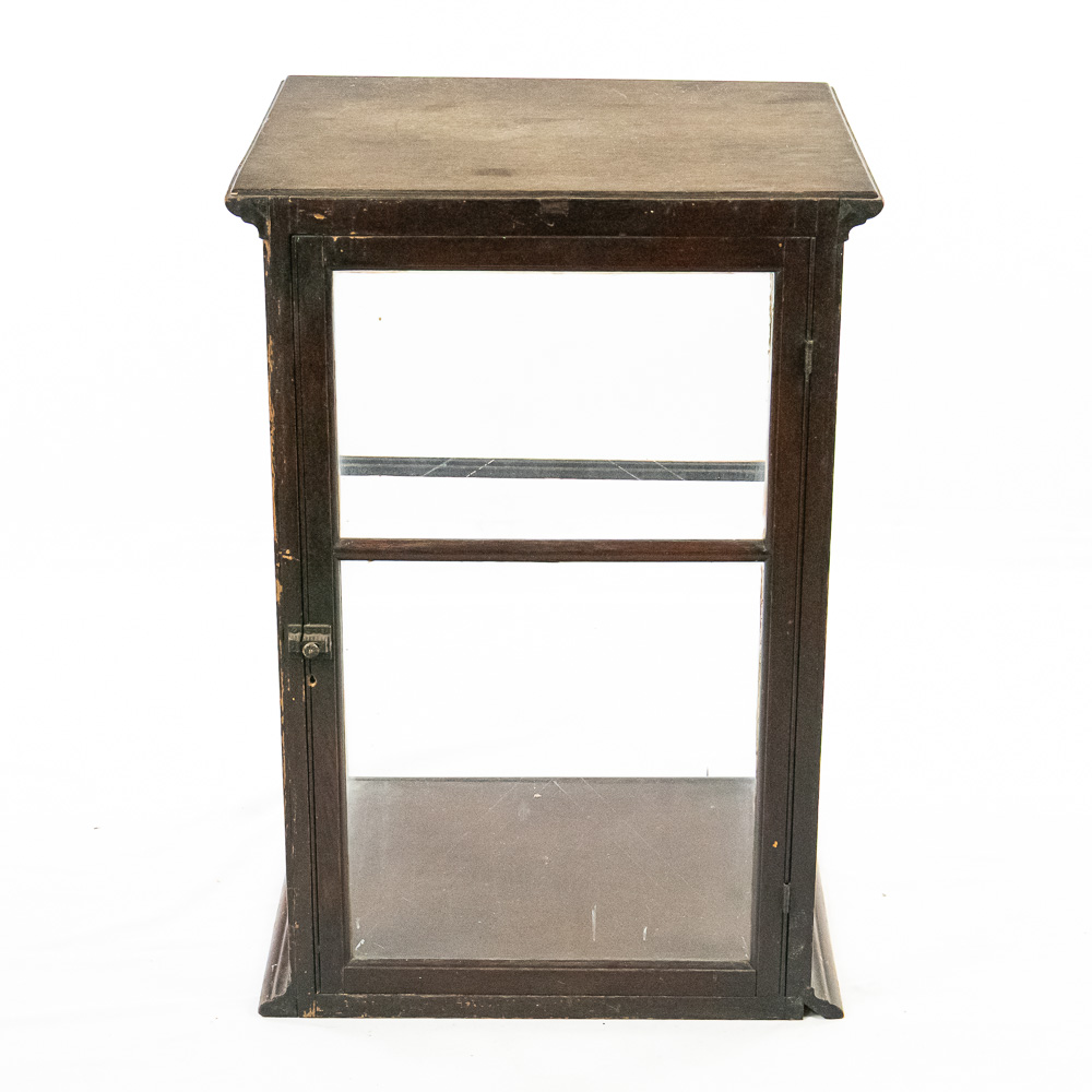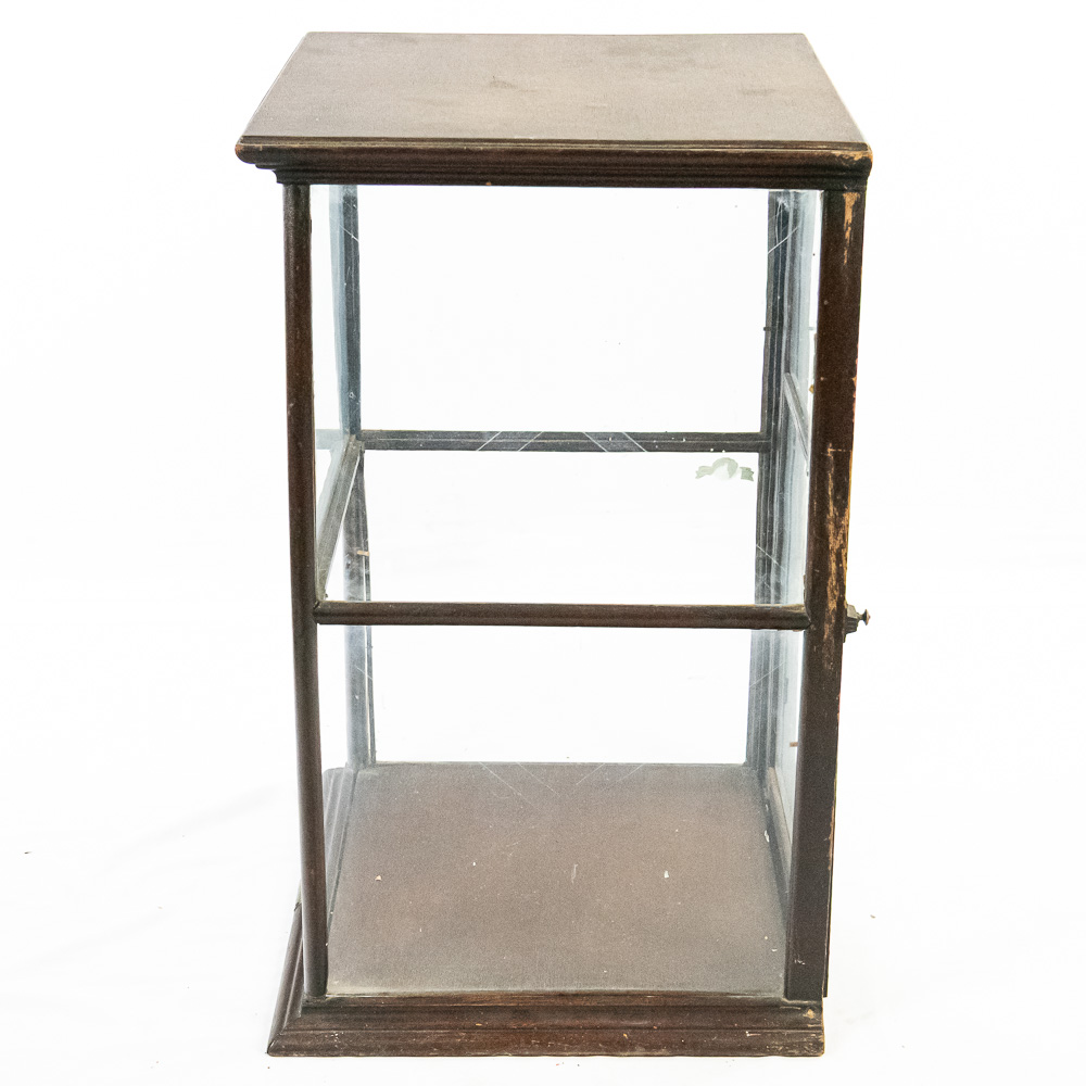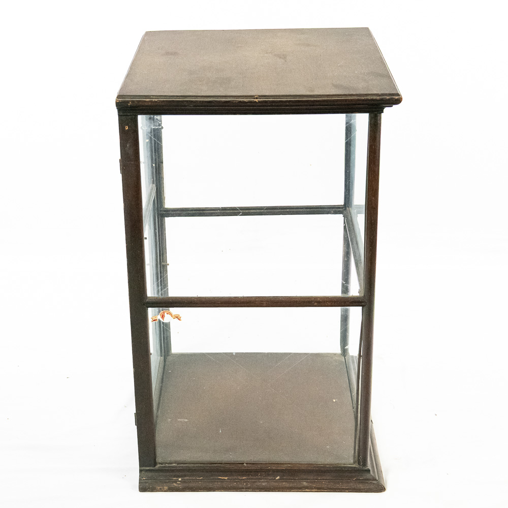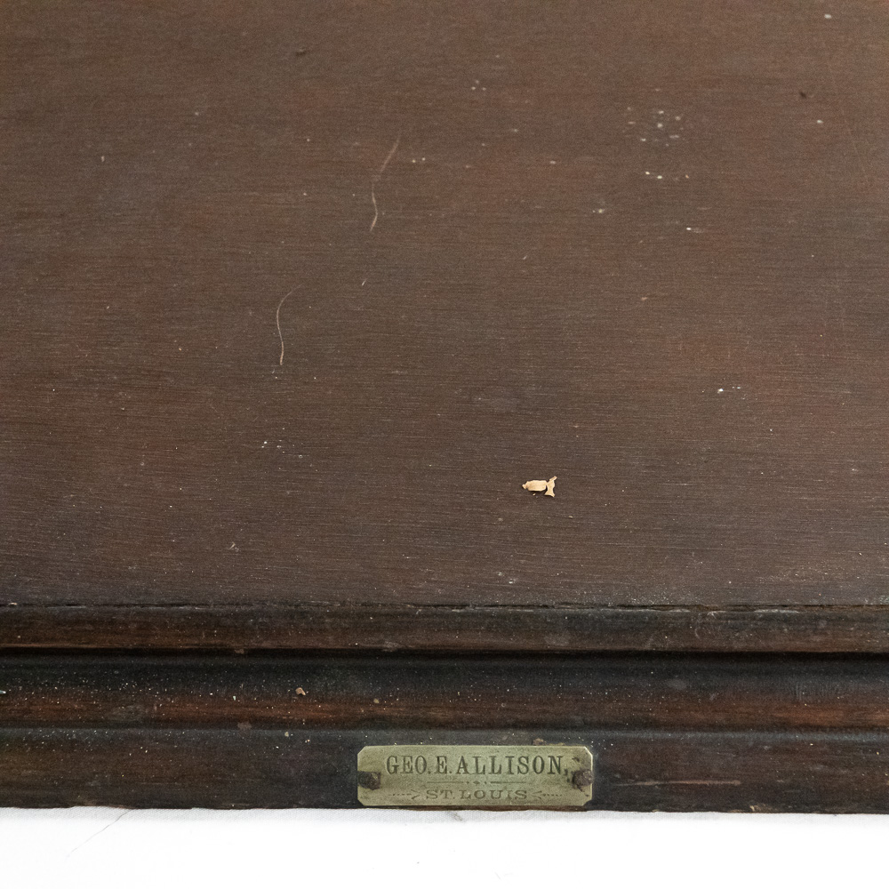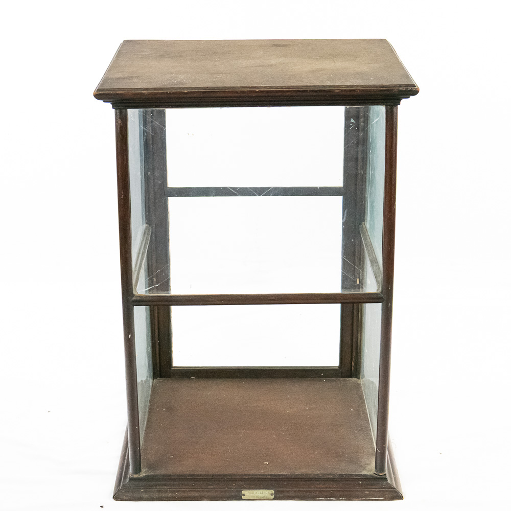 A fantastic piece of turn-of-the-century mercantile history, this countertop display case was crafted by Geo. E. Allison of St. Louis, as evidenced by the original brass tag on the base. Allison was a known purveyor of high-quality store fixtures in the late 19th and early 20th centuries. This square, vertical case features a dark hardwood frame with glass panels on all four sides, allowing for 360-degree viewing of the contents. It features a hinged door for access and support rails for a shelf (though the interior glass shelf is currently absent). The top is solid wood, making it a sturdy and functional piece. This would make an exceptional housing for taxidermy, collectibles, or tobacco ephemera.