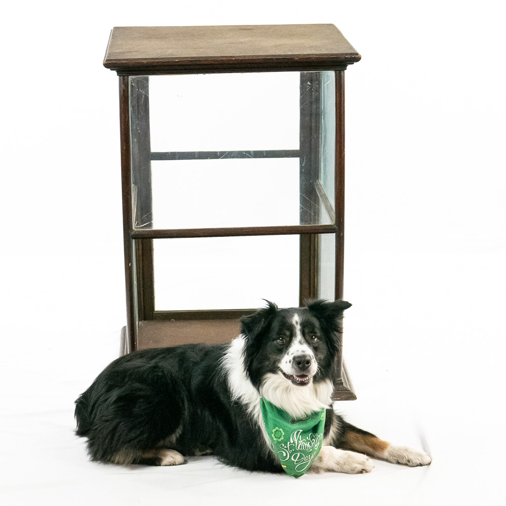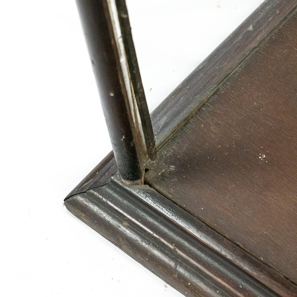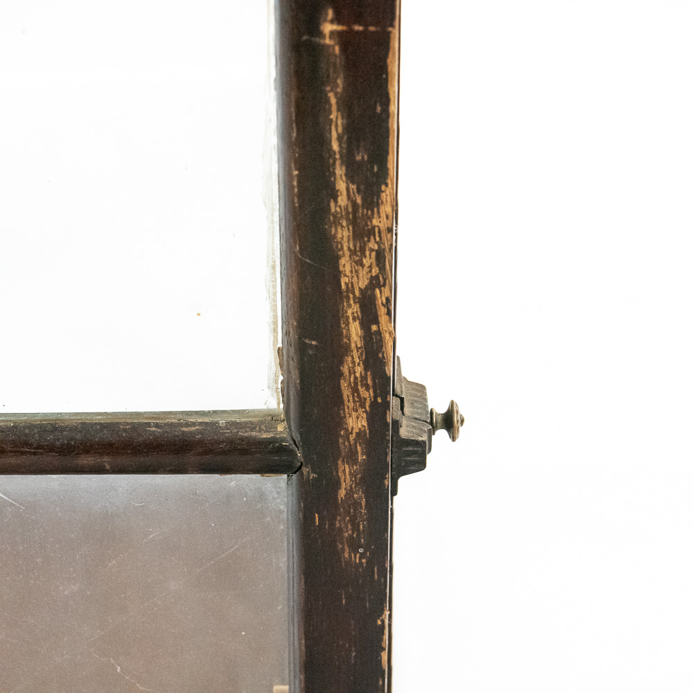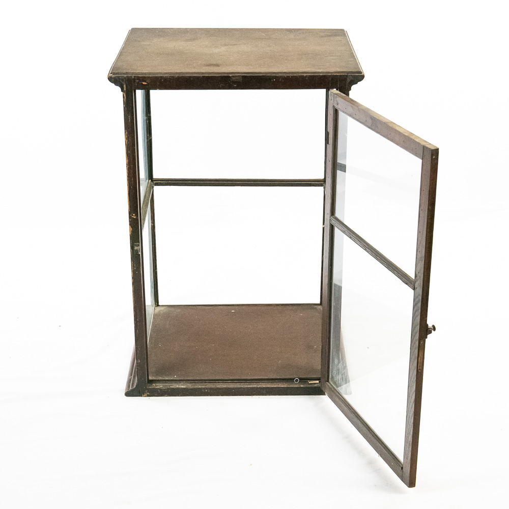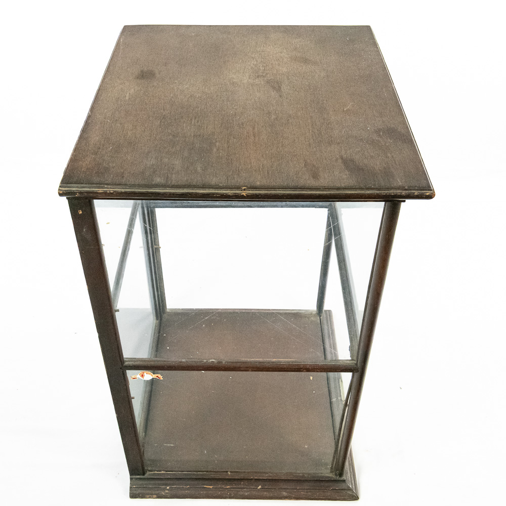 A fantastic piece of turn-of-the-century mercantile history, this countertop display case was crafted by Geo. E. Allison of St. Louis, as evidenced by the original brass tag on the base. Allison was a known purveyor of high-quality store fixtures in the late 19th and early 20th centuries. This square, vertical case features a dark hardwood frame with glass panels on all four sides, allowing for 360-degree viewing of the contents. It features a hinged door for access and support rails for a shelf (though the interior glass shelf is currently absent). The top is solid wood, making it a sturdy and functional piece. This would make an exceptional housing for taxidermy, collectibles, or tobacco ephemera.