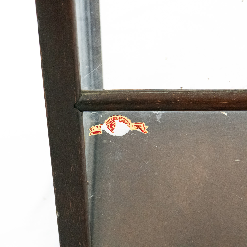 The piece shows honest wear commensurate with age, including surface scratches, scuffs, and finish wear on the wood, particularly the top. The glass panels appear intact, though one panel retains a partial “Jackpot Amusement” sticker. The interior glass shelf is missing. The structure remains sound and the door functions correctly.