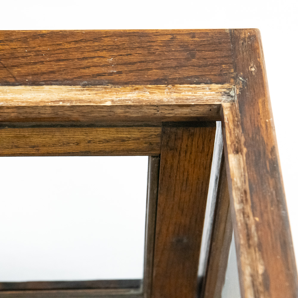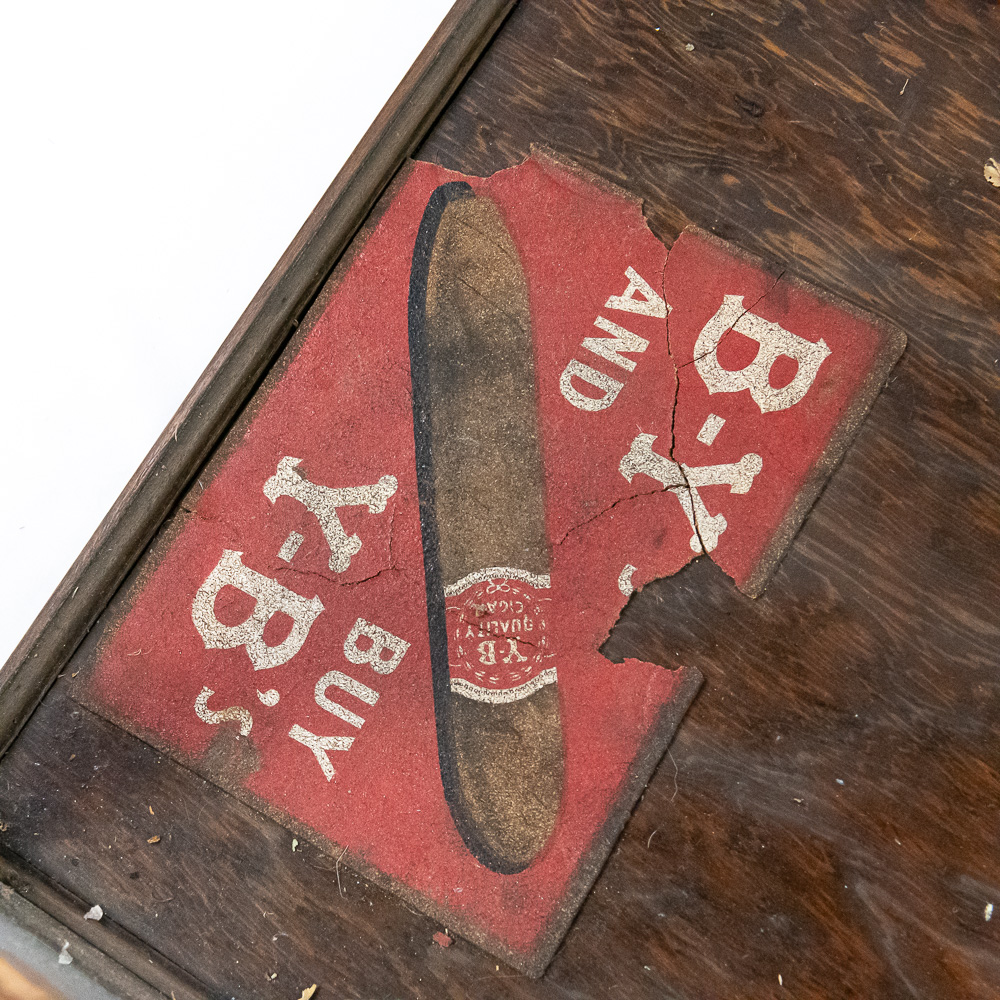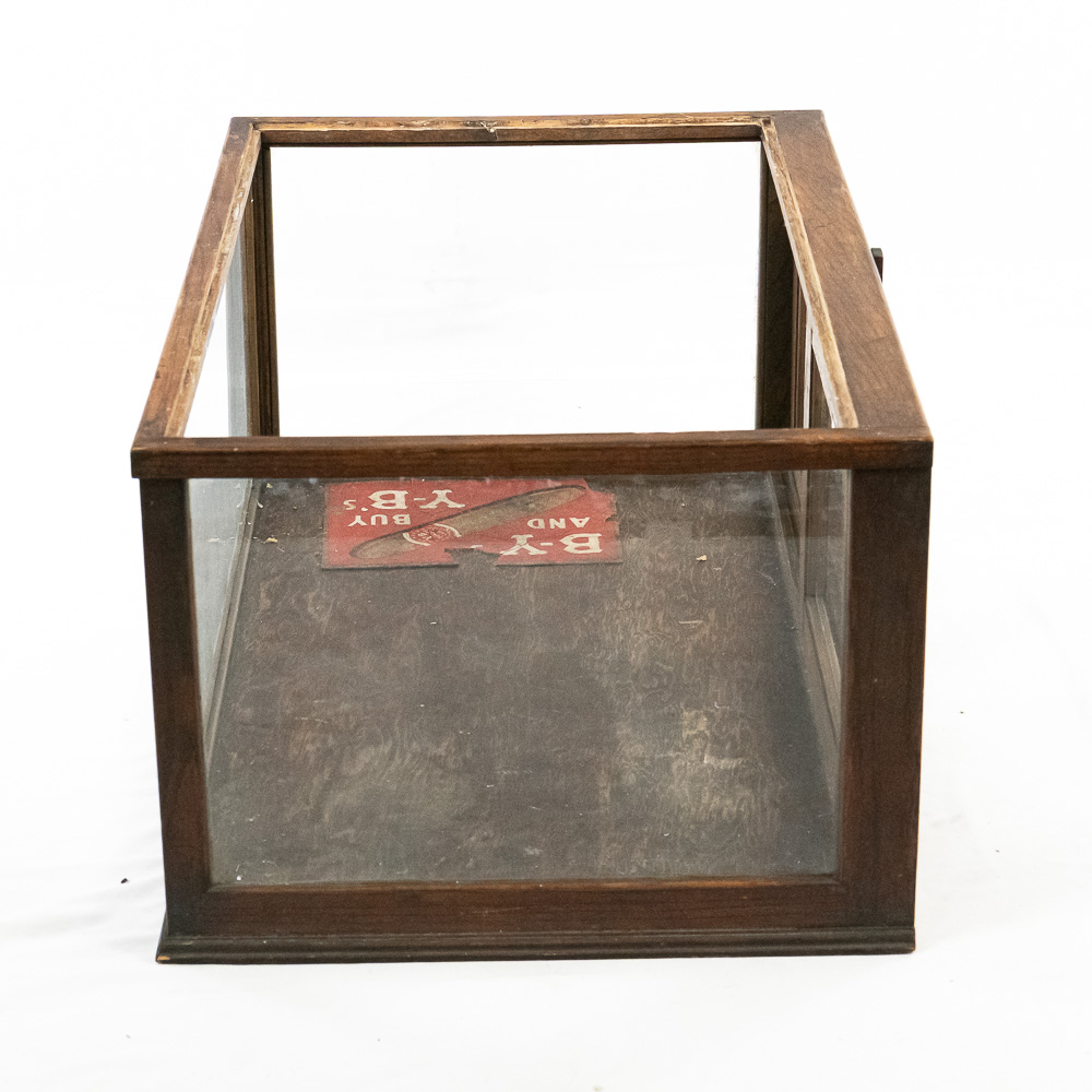 The case is in fair to good antique condition. The wood finish shows expected wear, including scuffs, scratches, and finish loss, particularly along the top edges and corners consistent with age and use. The glass panels appear intact but would benefit from a thorough cleaning. The interior decal is heavily distressed, with significant portions torn away, though the central cigar graphic and branding remain legible. Structurally, the frame appears stable. H 12″, W 23″, D 14″