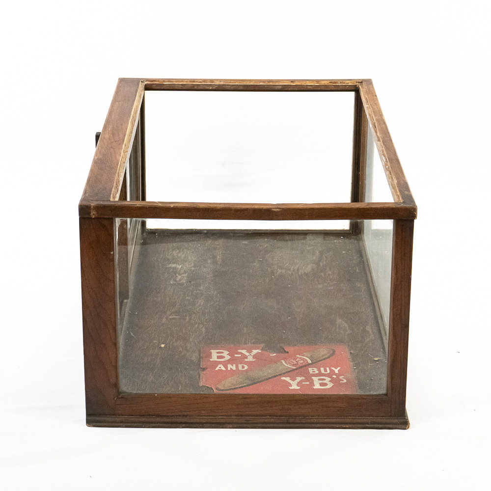 This is a charming piece of turn-of-the-century Tobacciana—a countertop display case advertising “Y-B’s,” the signature brand of the Yocum Brothers cigar manufacturers out of Reading, Pennsylvania. Constructed with a sturdy wooden frame, likely oak or stained hardwood, the case features glass panels on the front, top, and sides to offer a clear view of the merchandise within. Access is provided by two sliding wooden doors at the rear. The interior floor retains a partial, original paper decal featuring a cigar graphic and the slogan “Buy Y-B’s and Buy Y-B’s,” a nostalgic nod to early 20th-century advertising. This case would have originally sat on a general store or smoke shop counter, enticing customers with “Quality Cigars.”