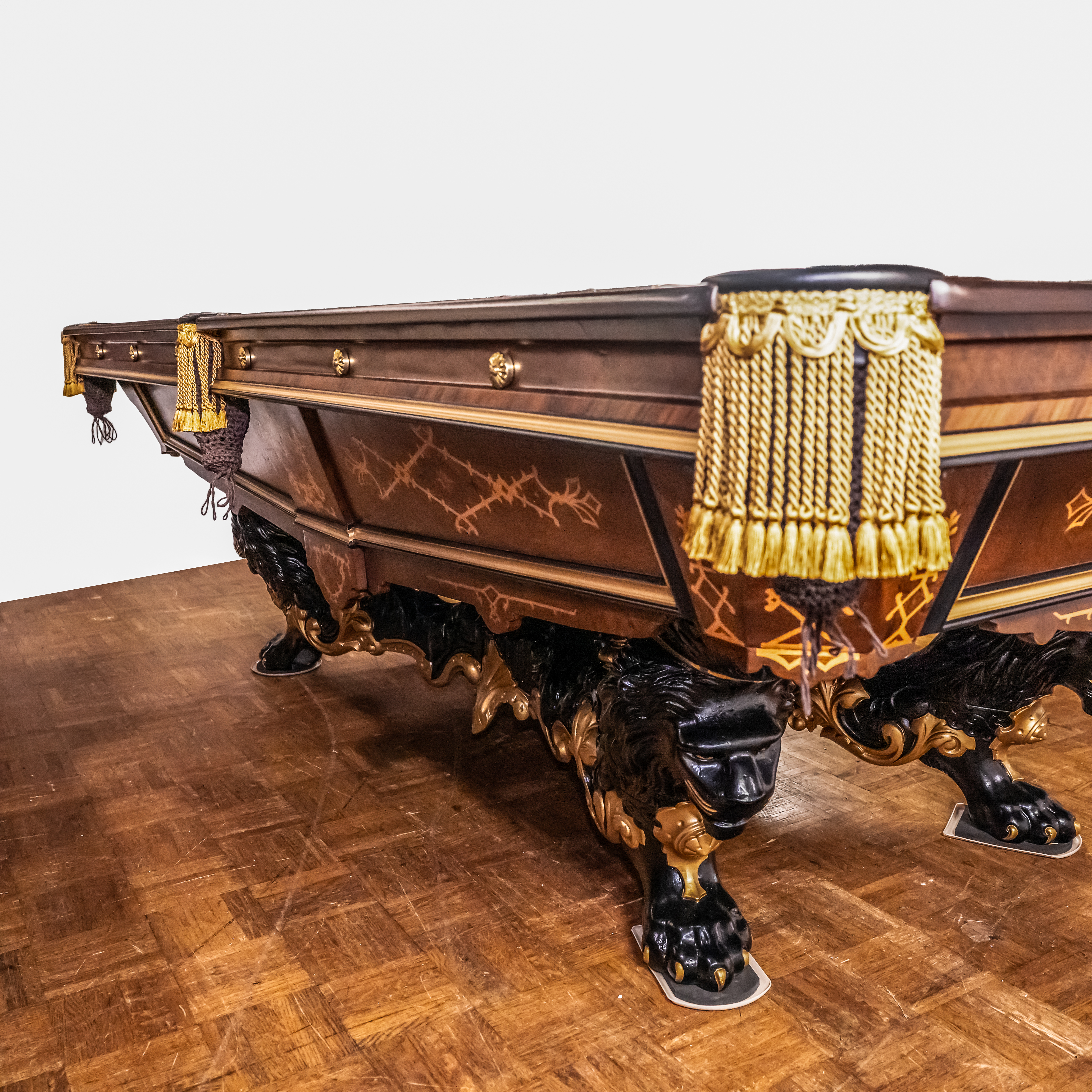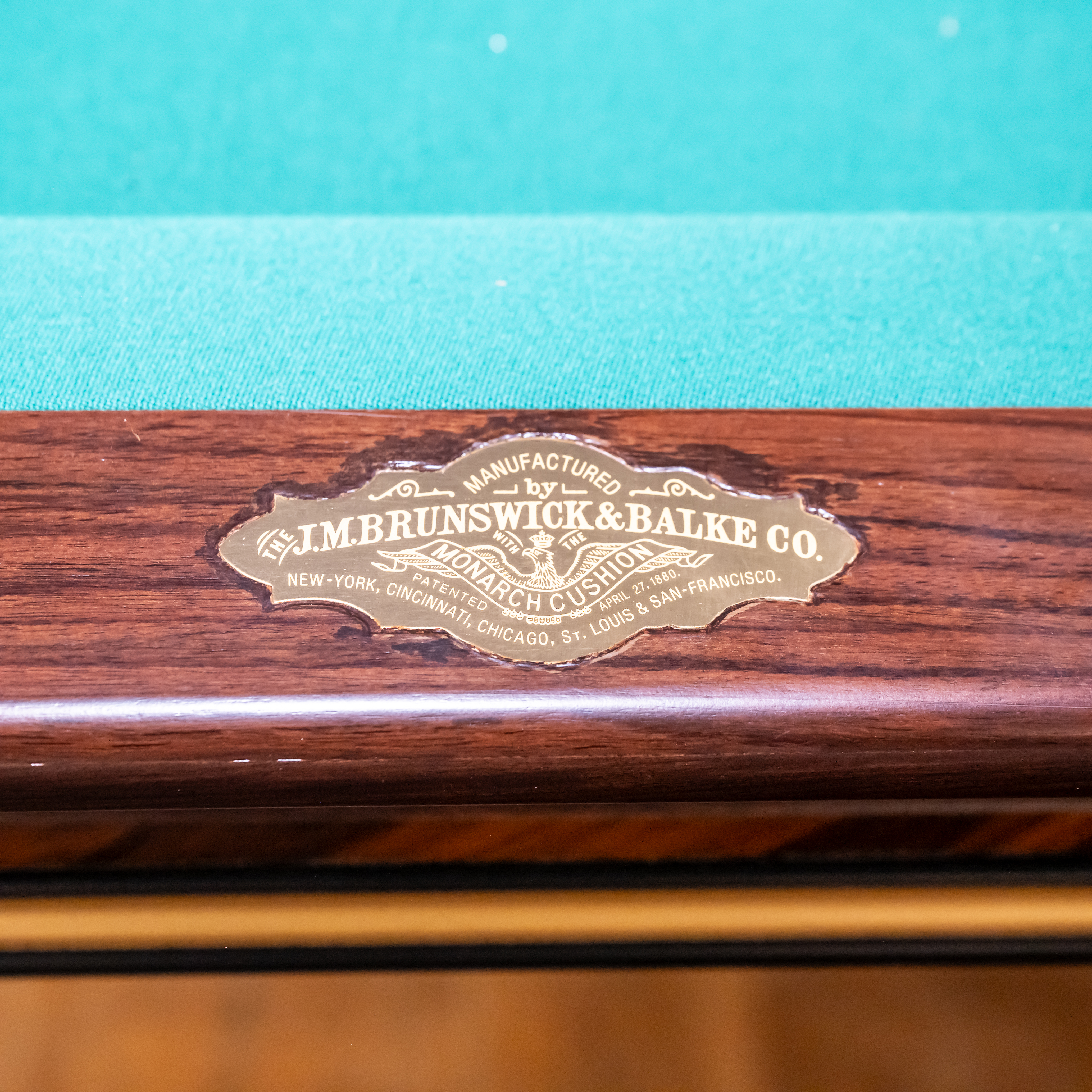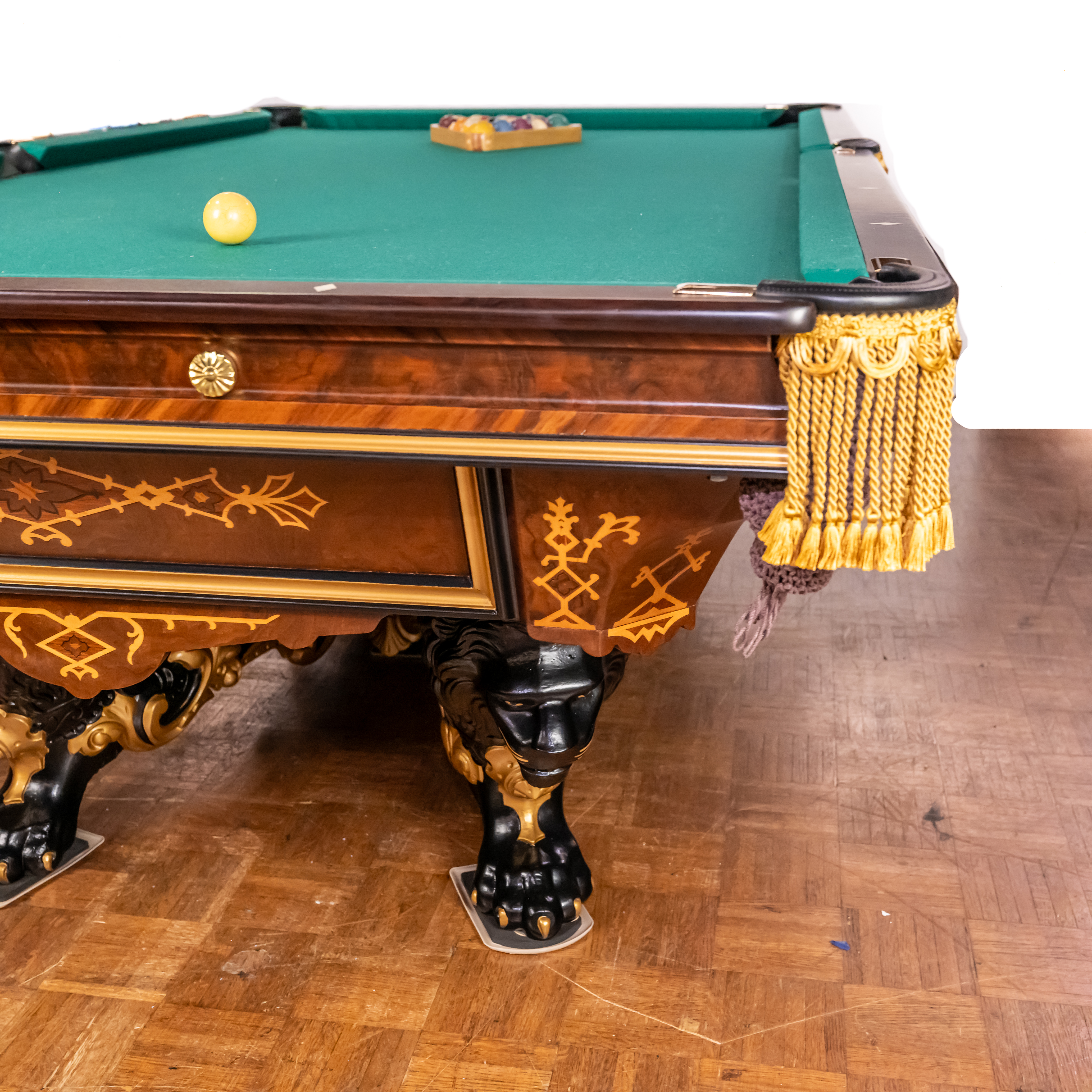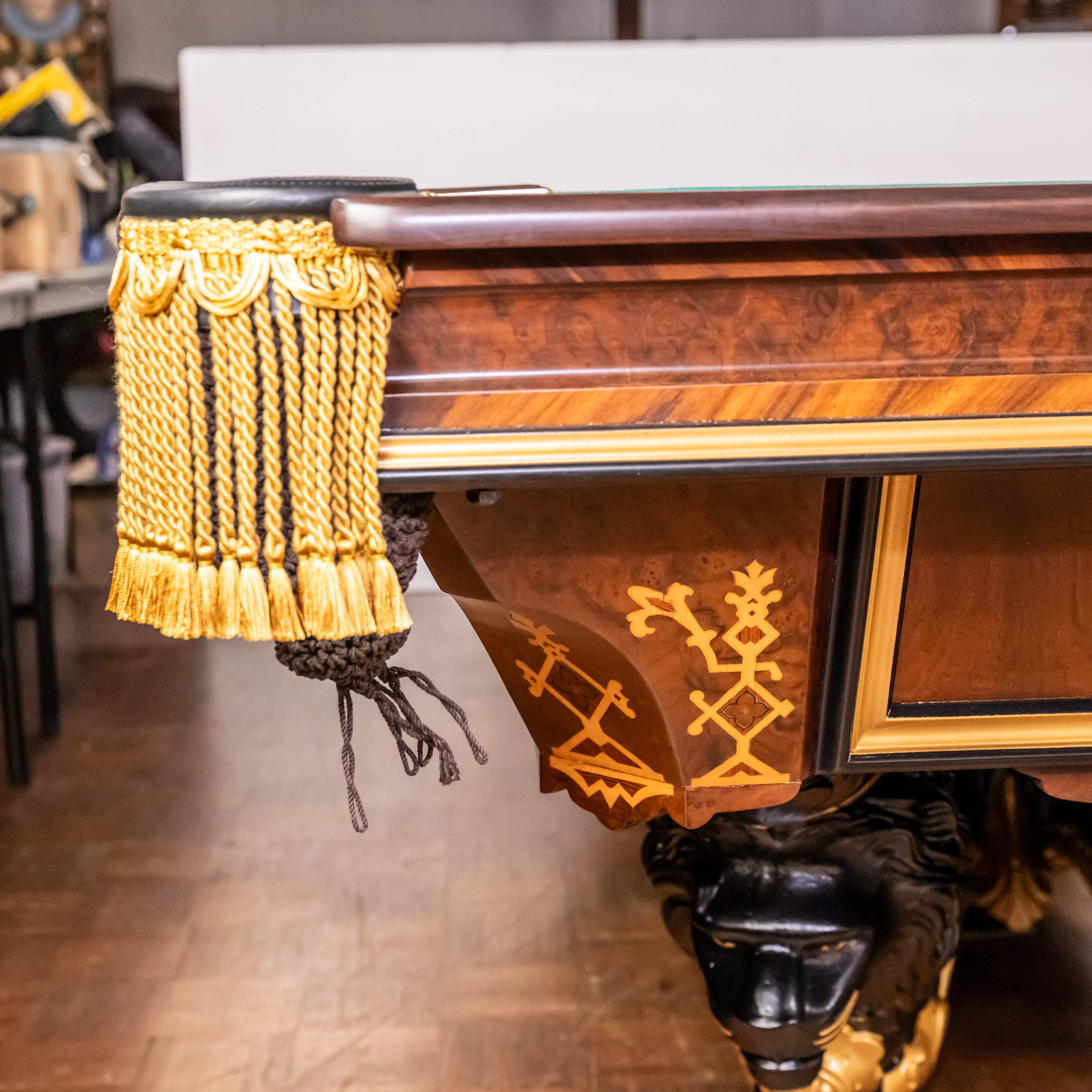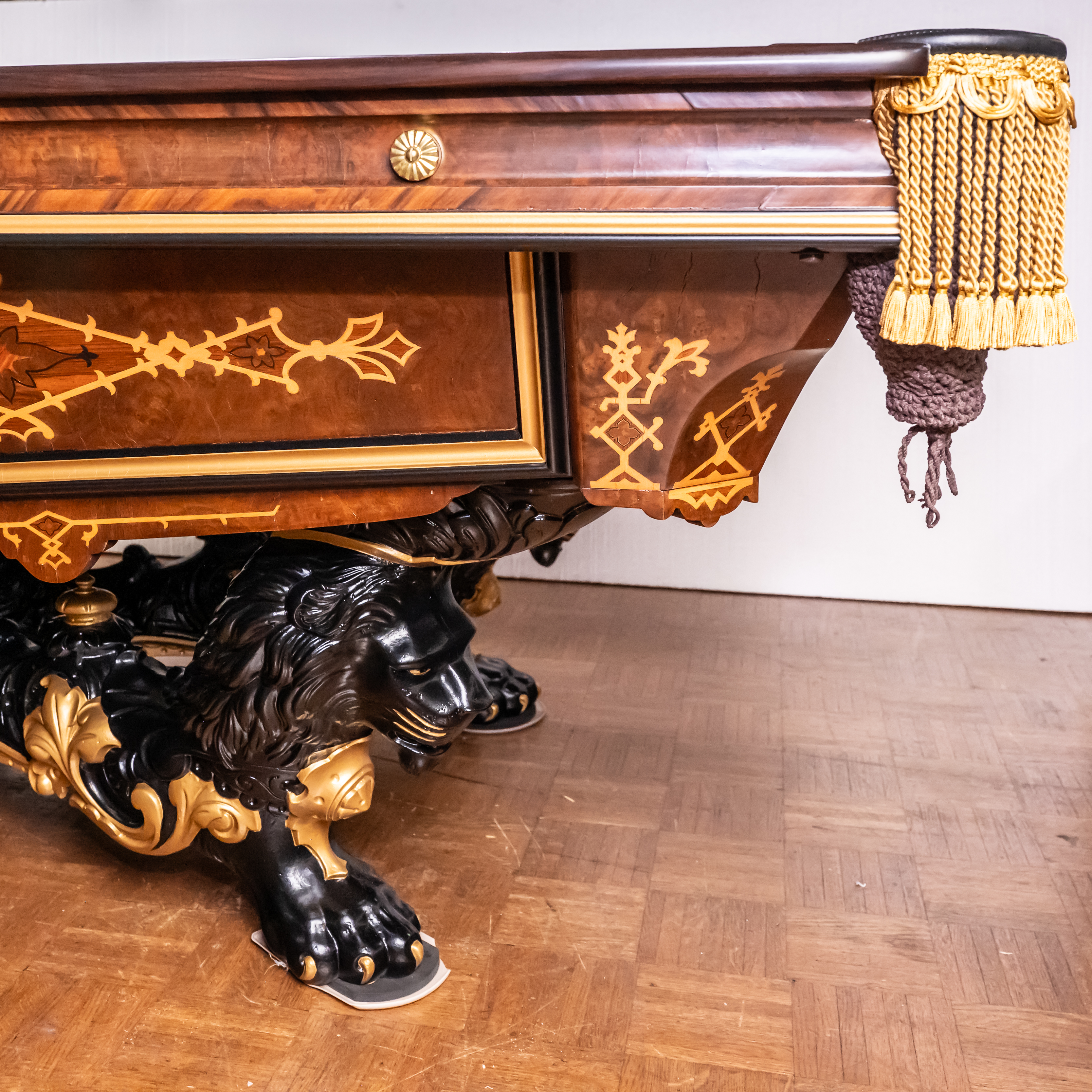 A very early example of the Brunswick Monarch table produced in the 1870s. Walnut background with extensive inlay of exotic woods on all surfaces. Genuine 18-karat gold accents. Highly desirable nine-foot X 4.5’W size. Four-piece slate playing surface.