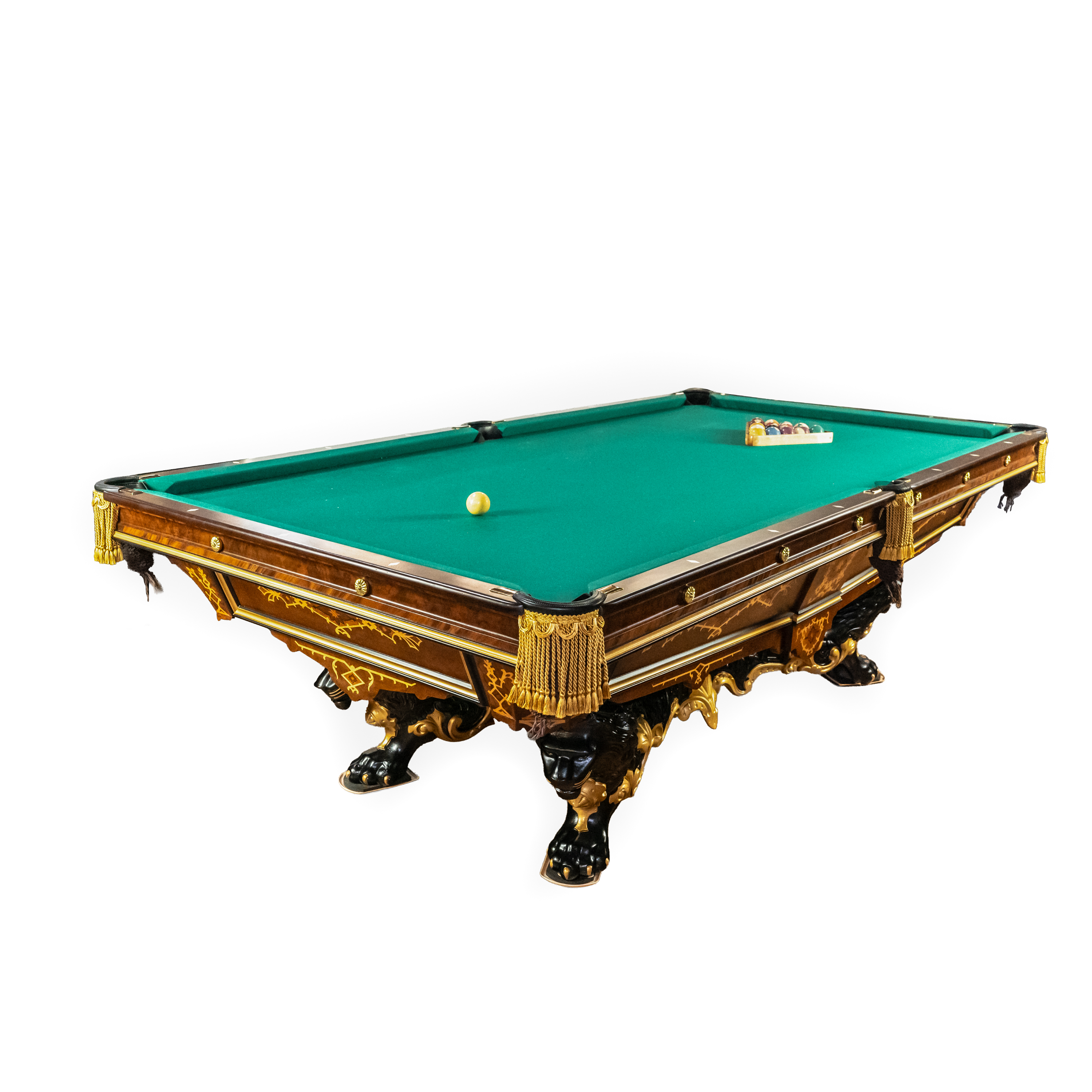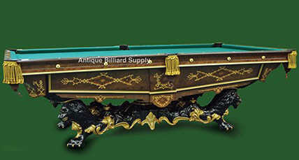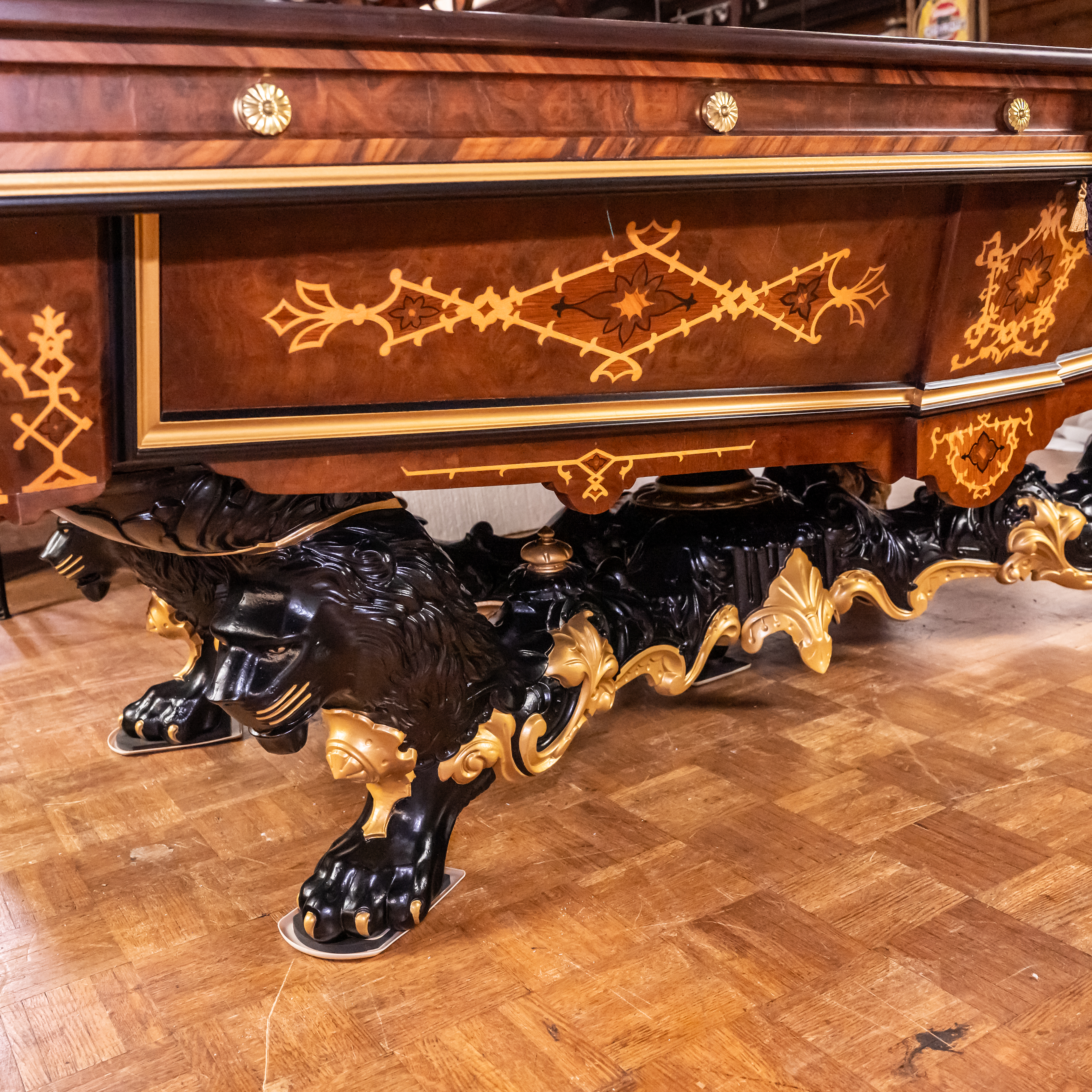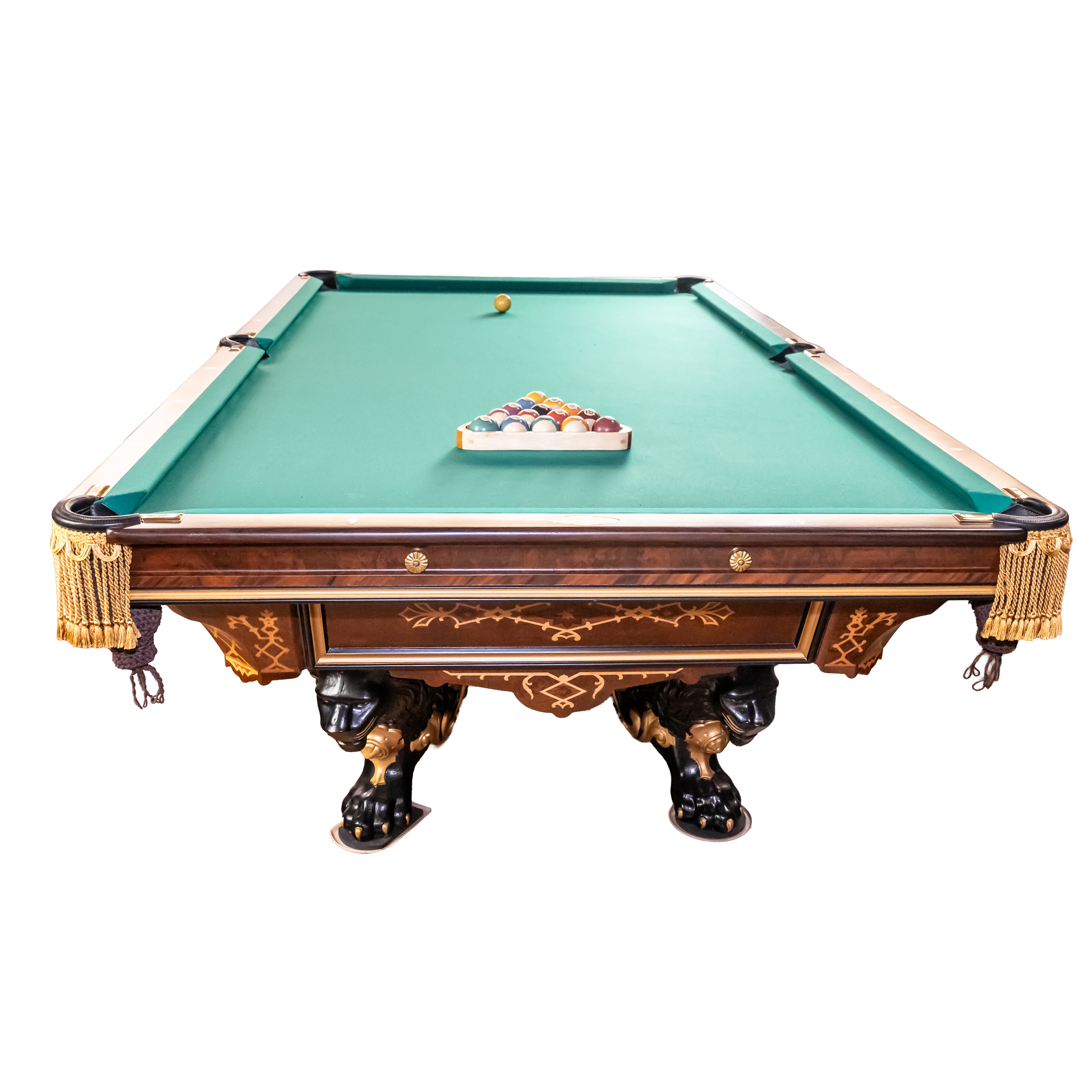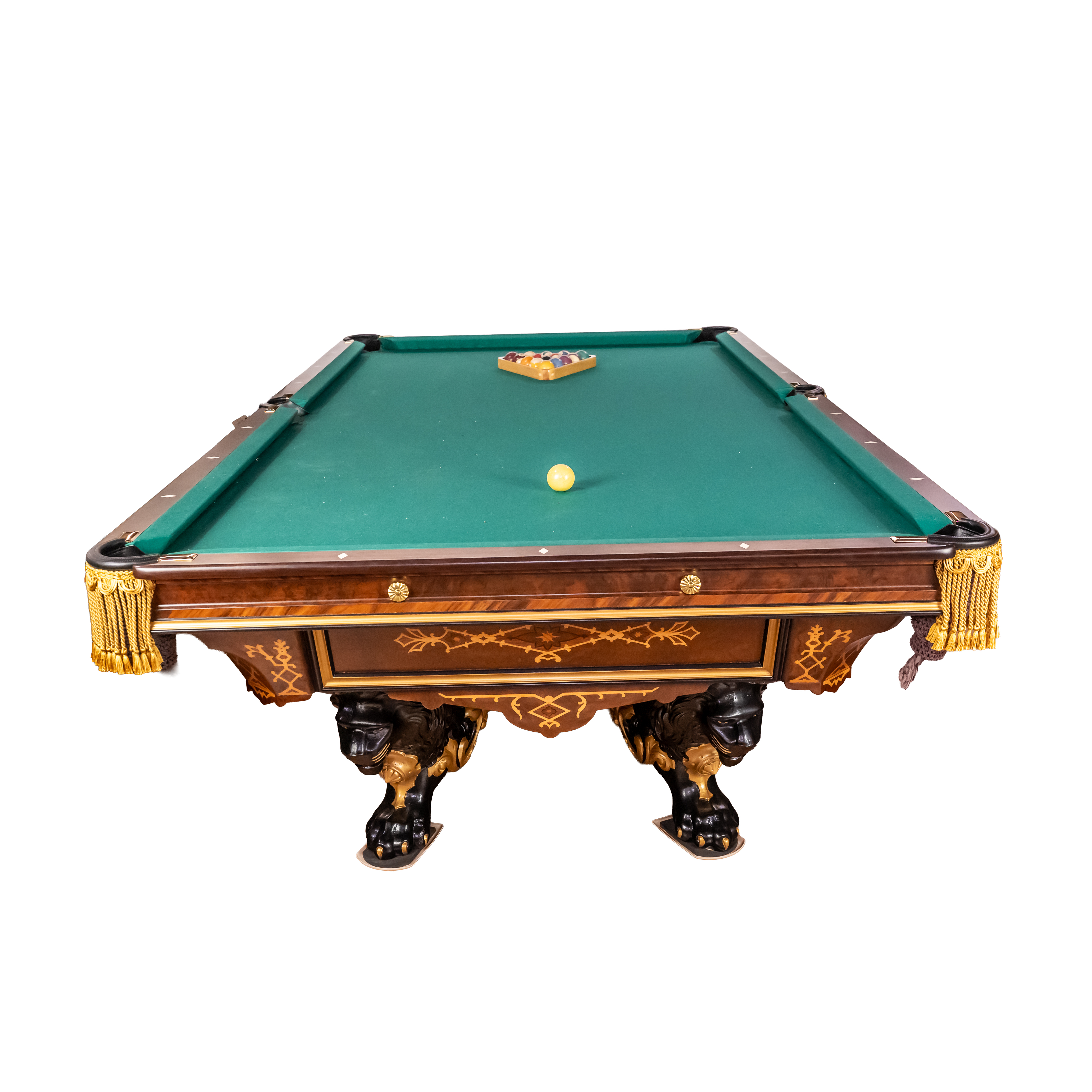 A very early example of the Brunswick Monarch table produced in the 1870s. Walnut background with extensive inlay of exotic woods on all surfaces. Genuine 18-karat gold accents. Highly desirable nine-foot X 4.5’W size. Four-piece slate playing surface.