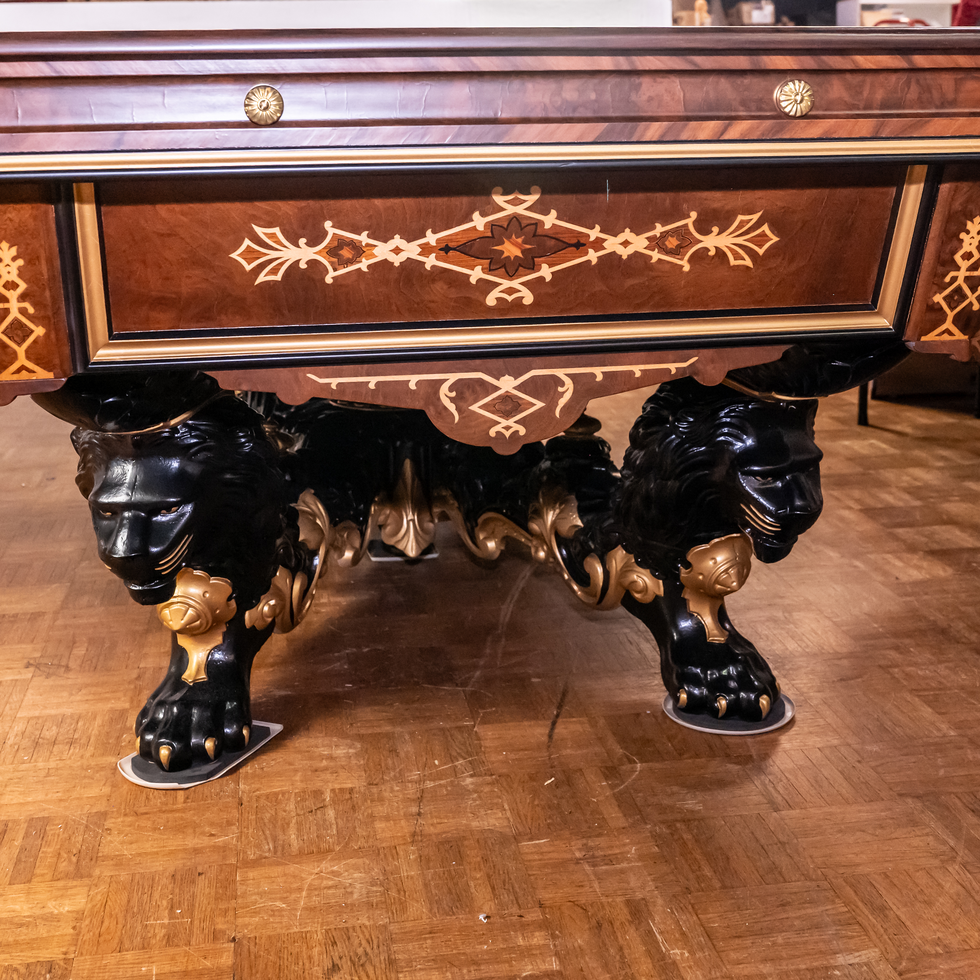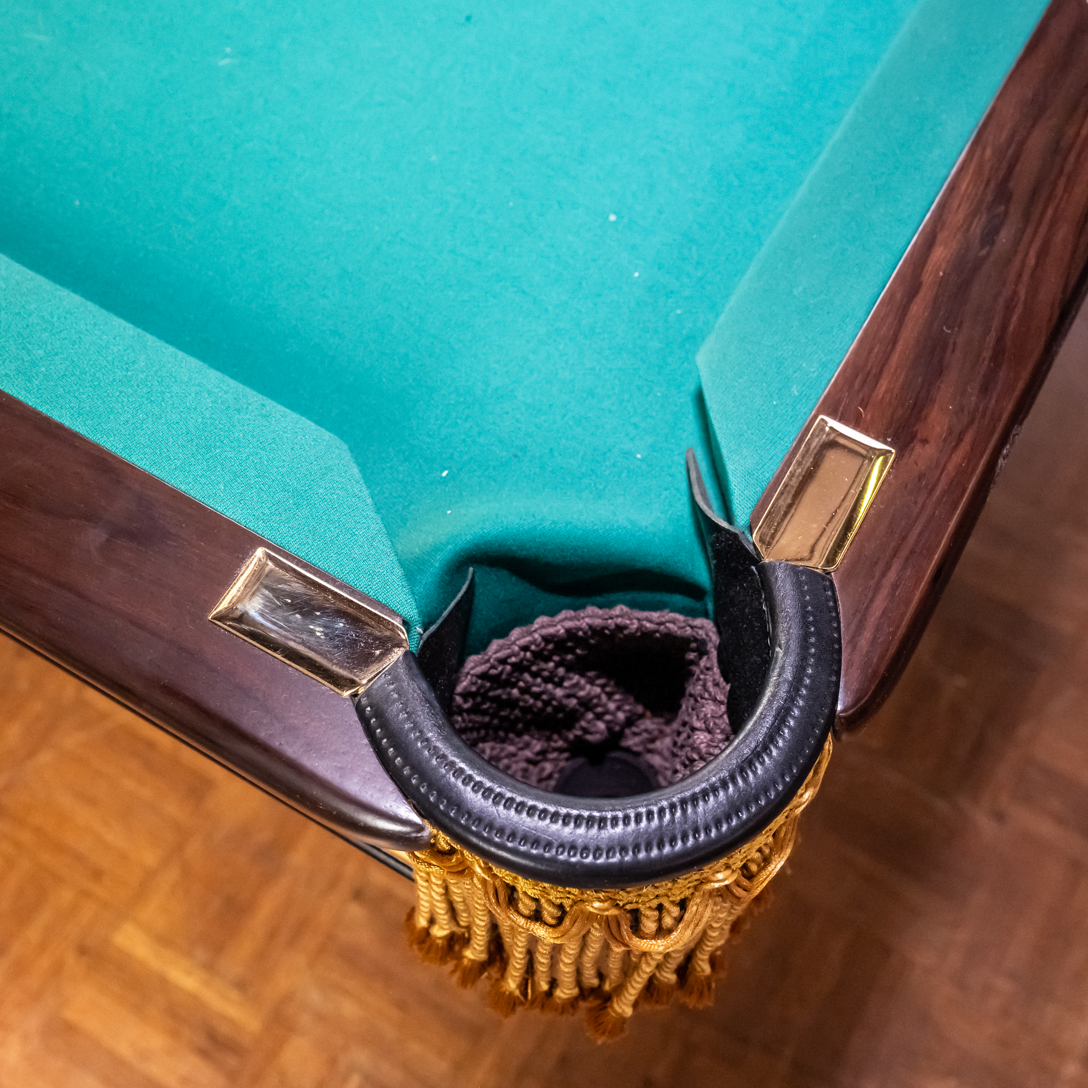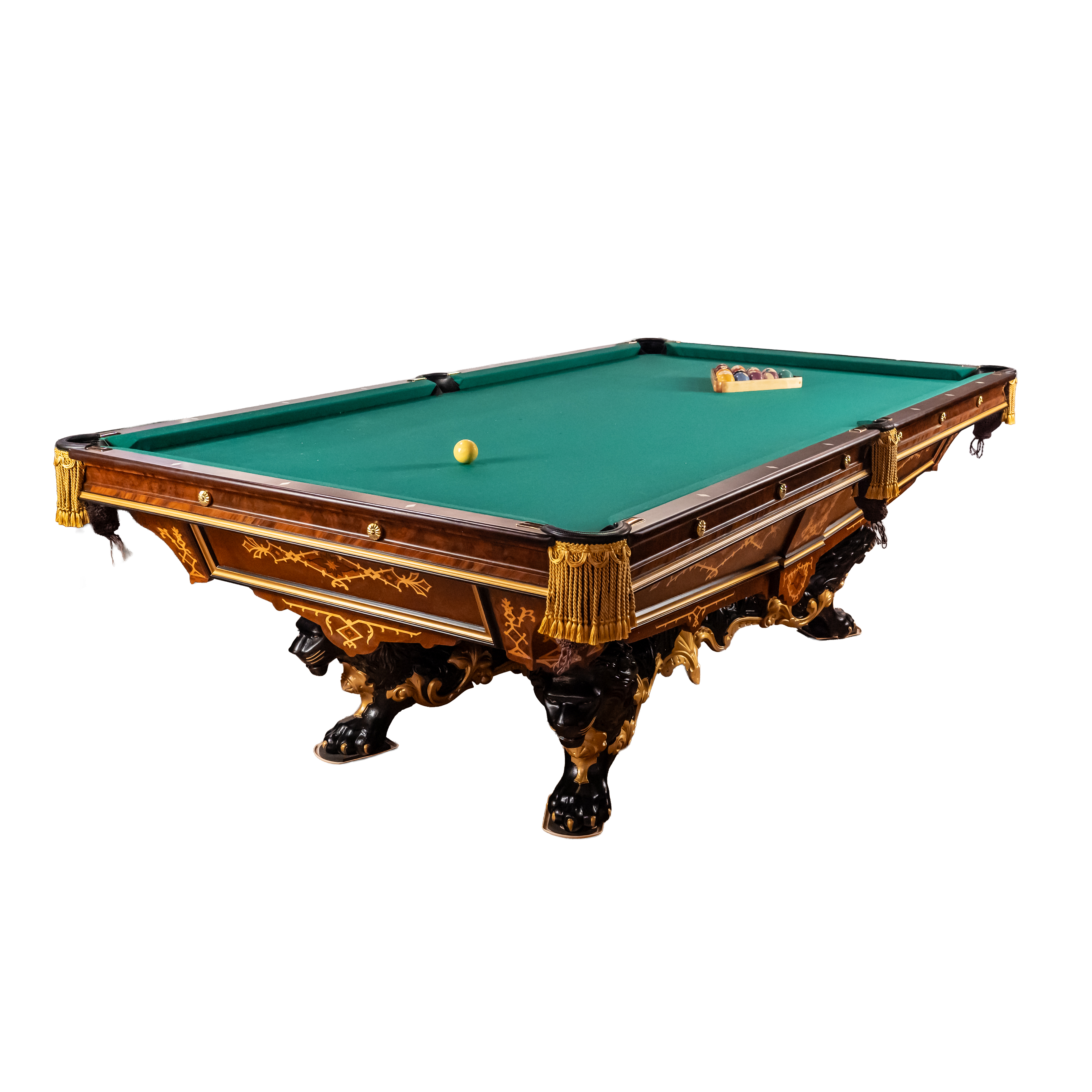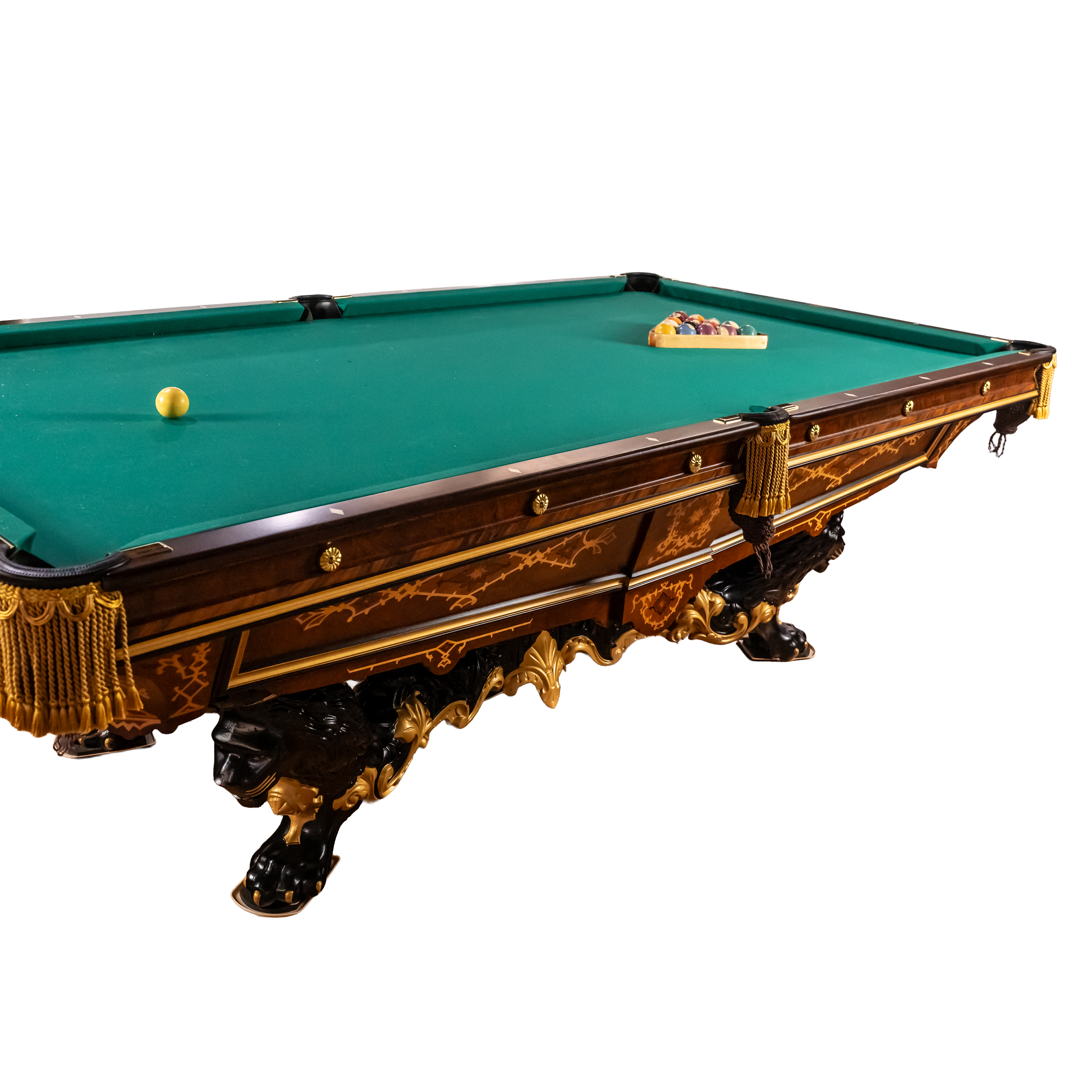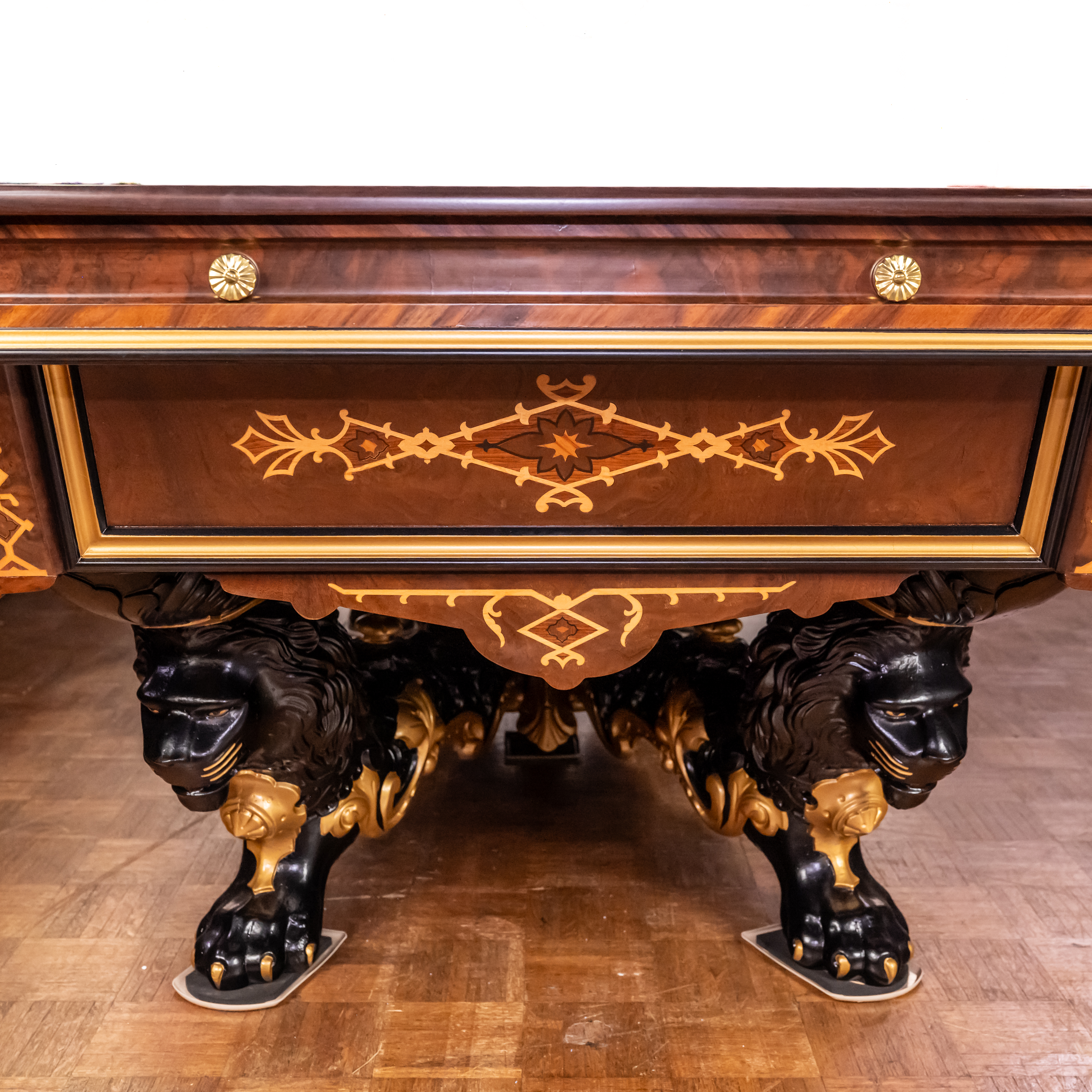 A very early example of the Brunswick Monarch table produced in the 1870s. Walnut background with extensive inlay of exotic woods on all surfaces. Genuine 18-karat gold accents. Highly desirable nine-foot X 4.5’W size. Four-piece slate playing surface.