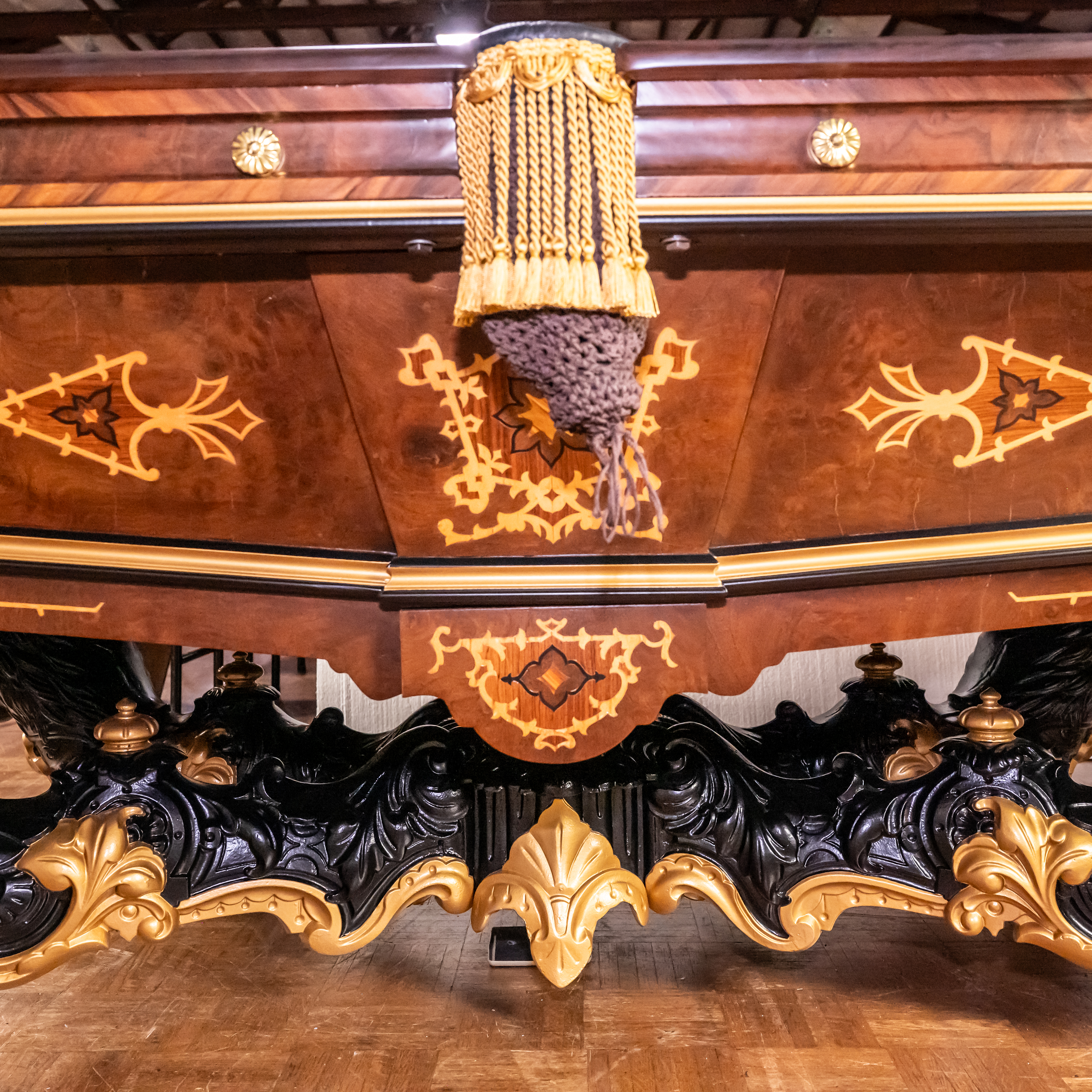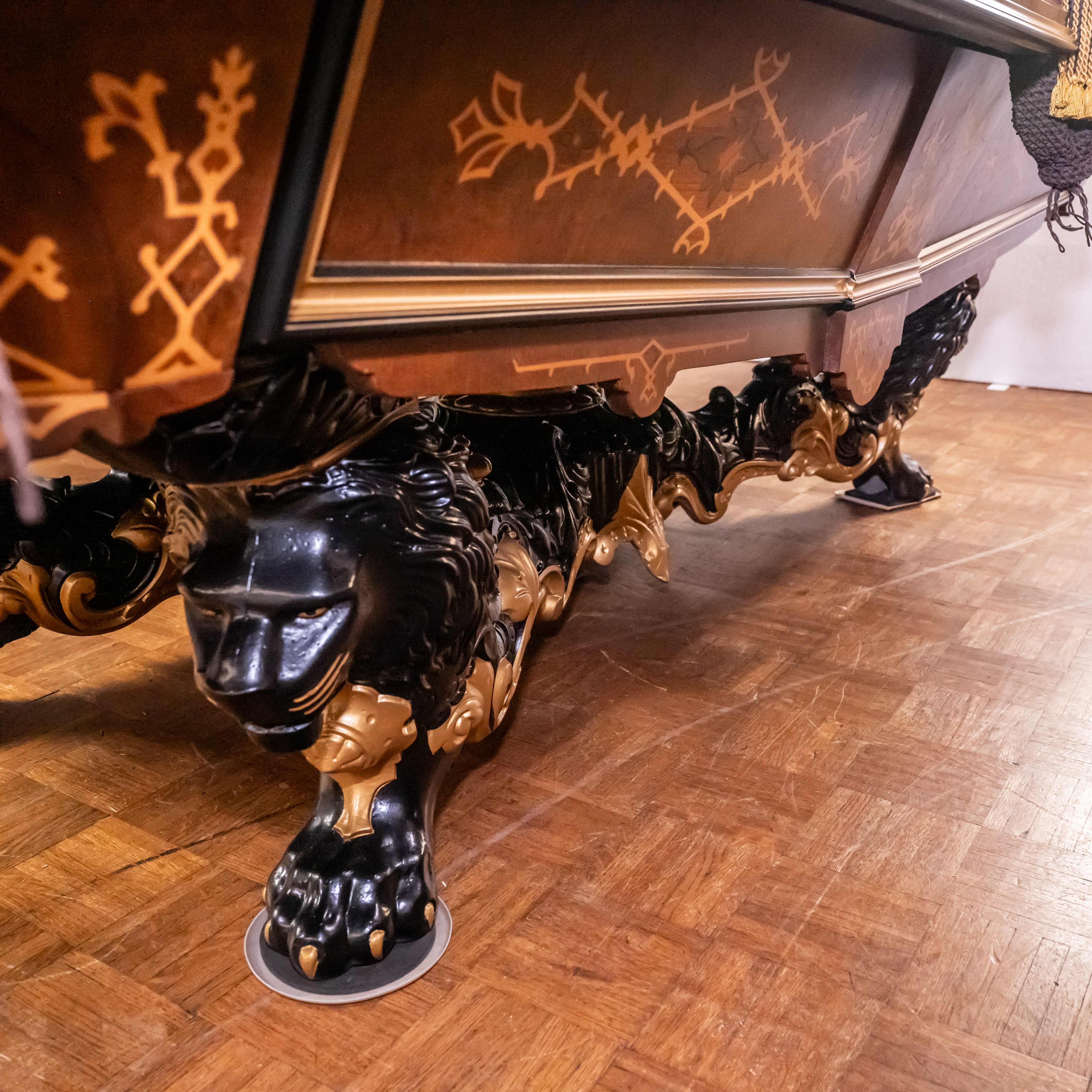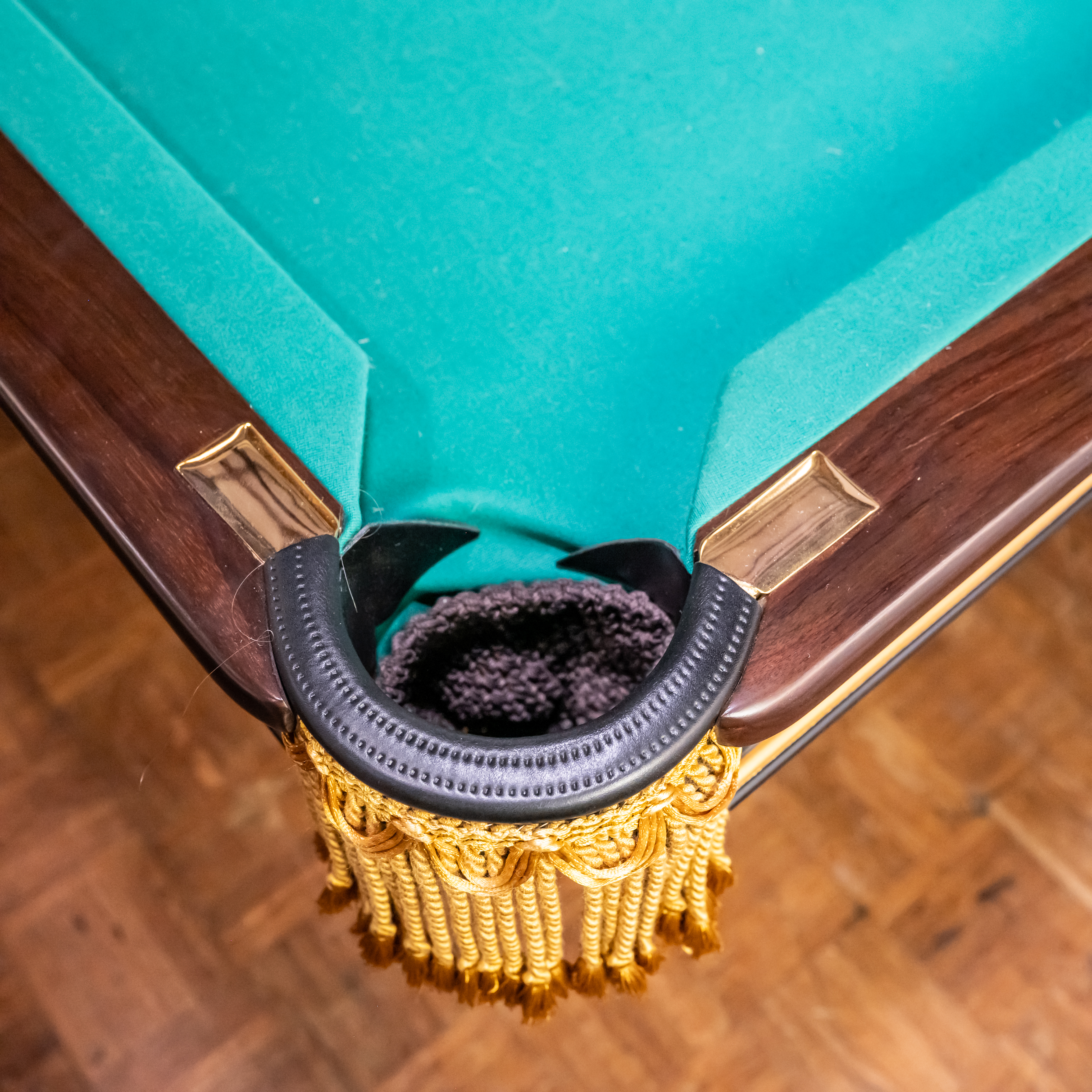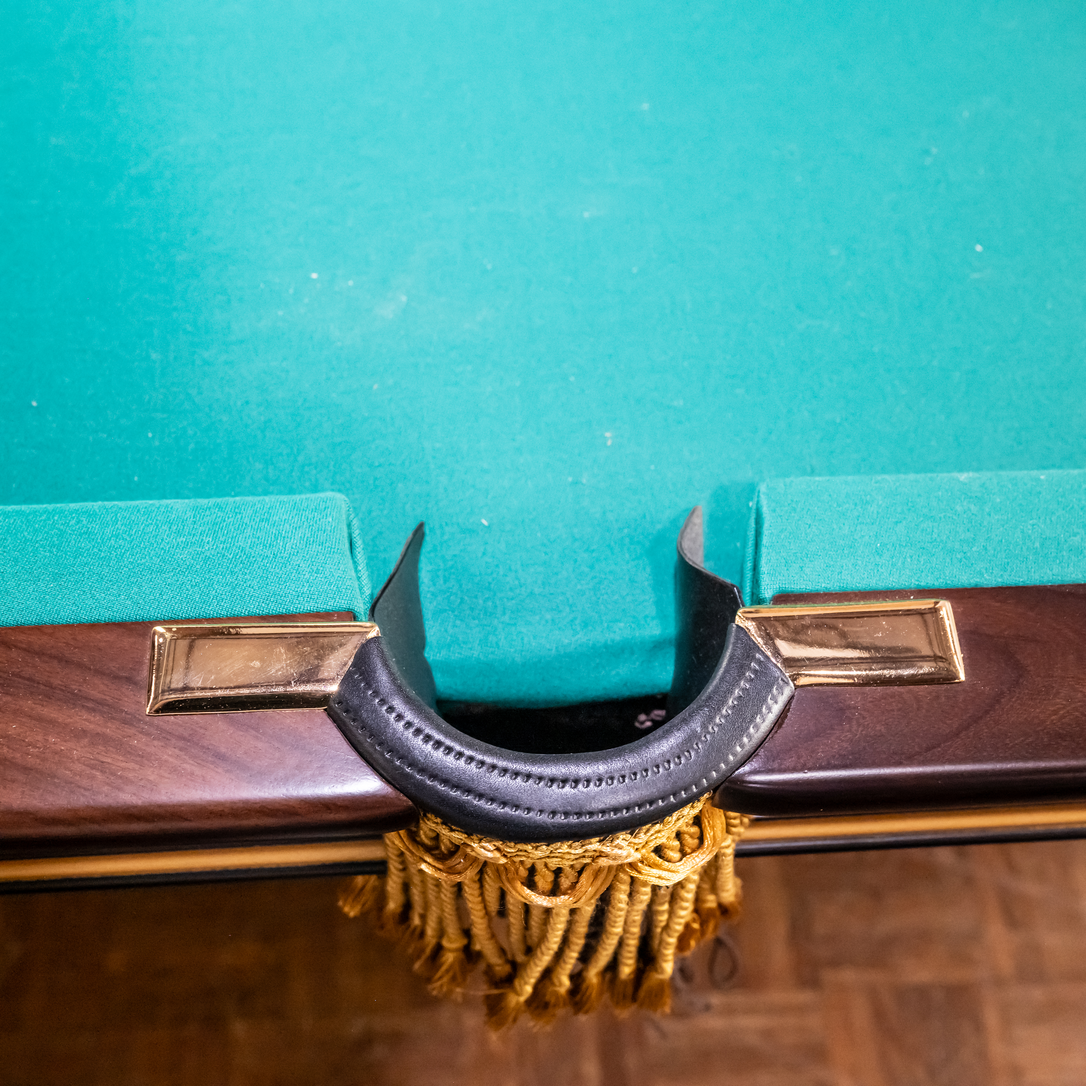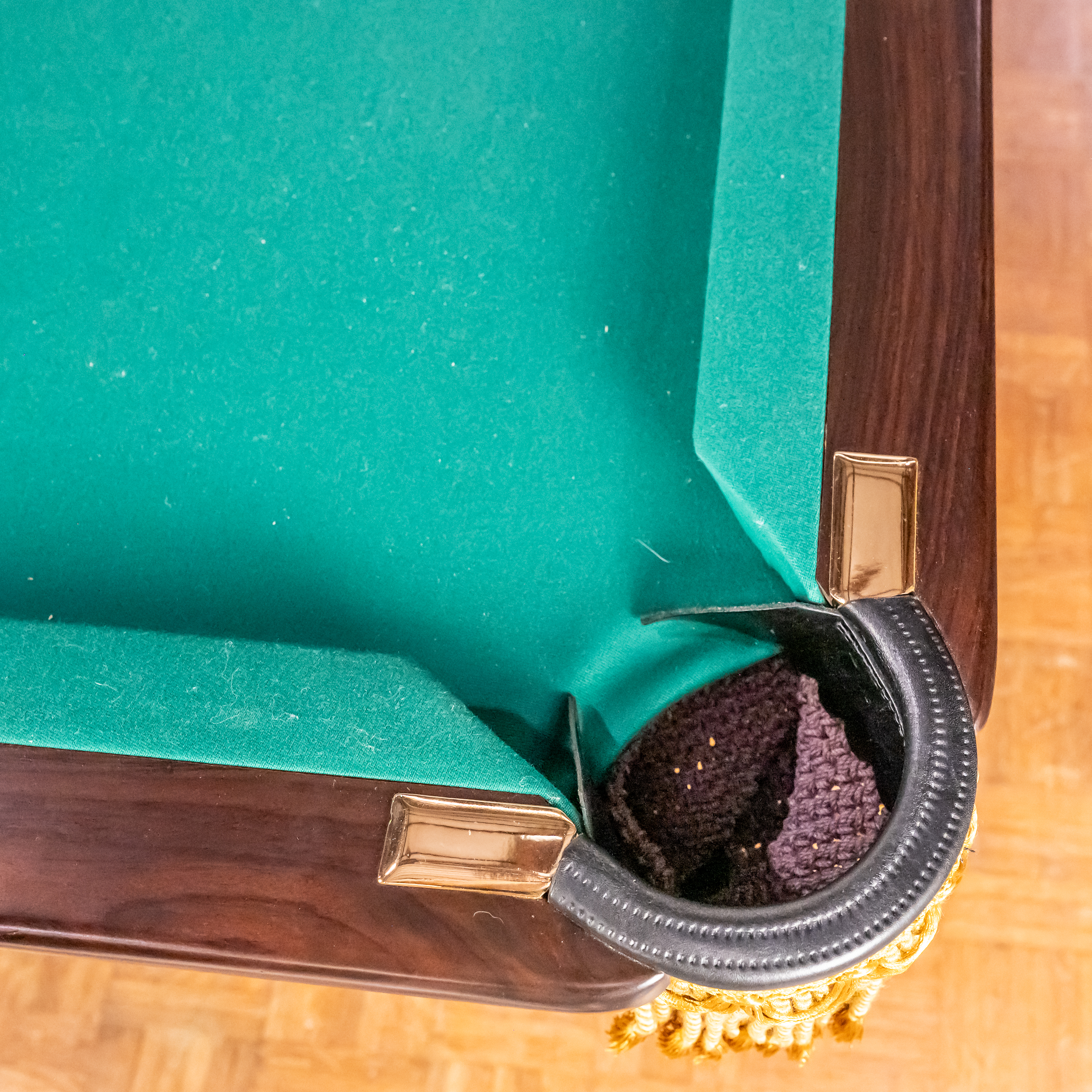 A very early example of the Brunswick Monarch table produced in the 1870s. Walnut background with extensive inlay of exotic woods on all surfaces. Genuine 18-karat gold accents. Highly desirable nine-foot X 4.5’W size. Four-piece slate playing surface.