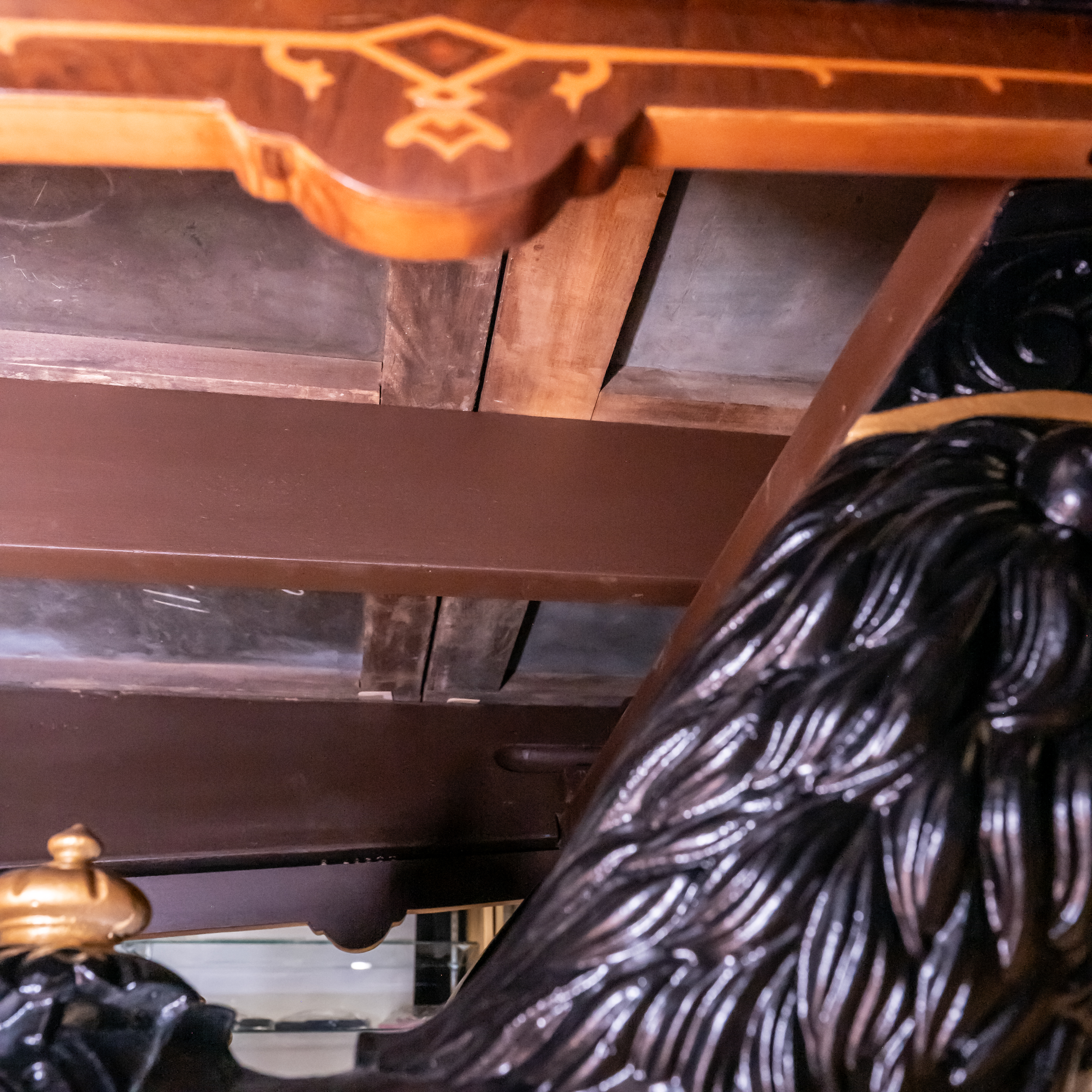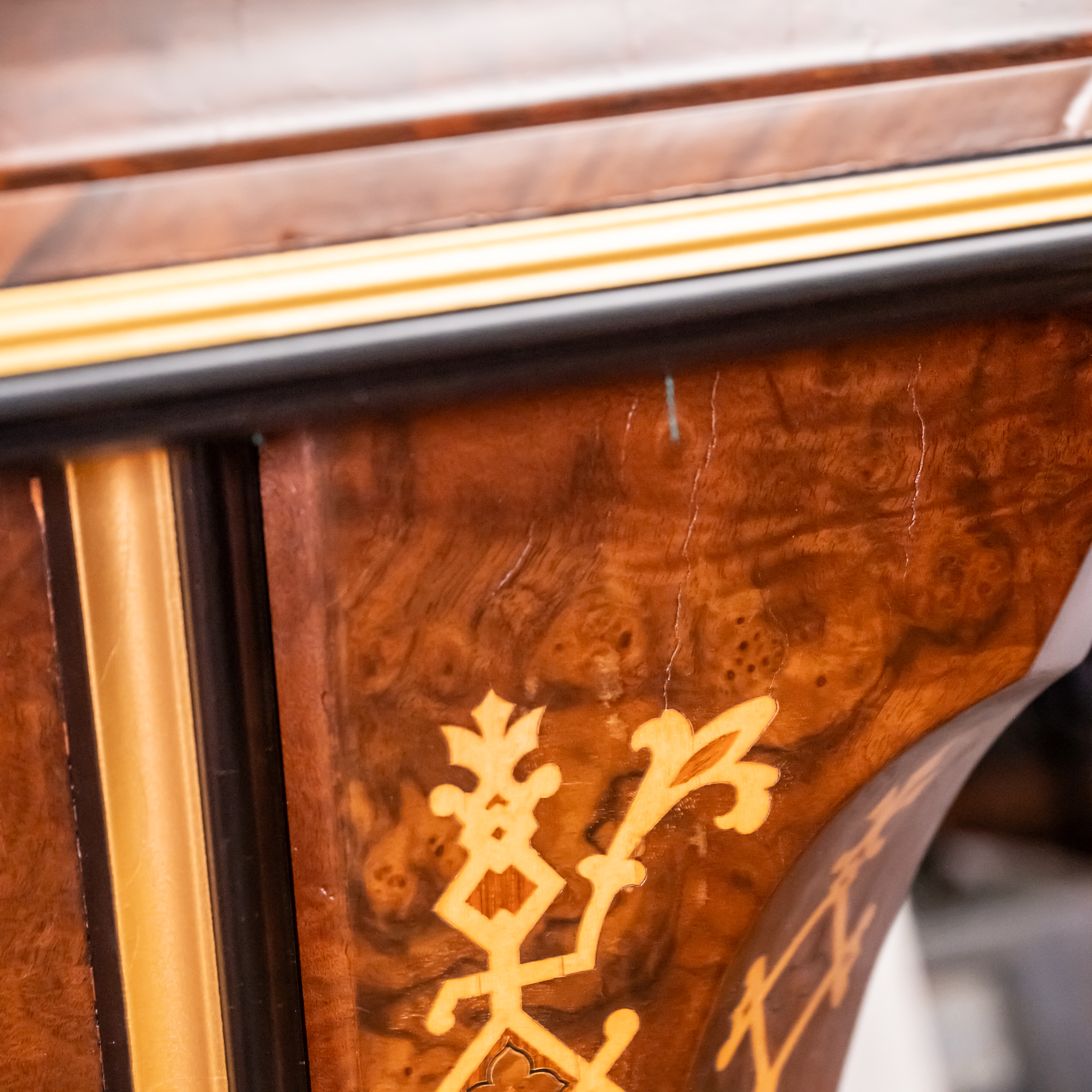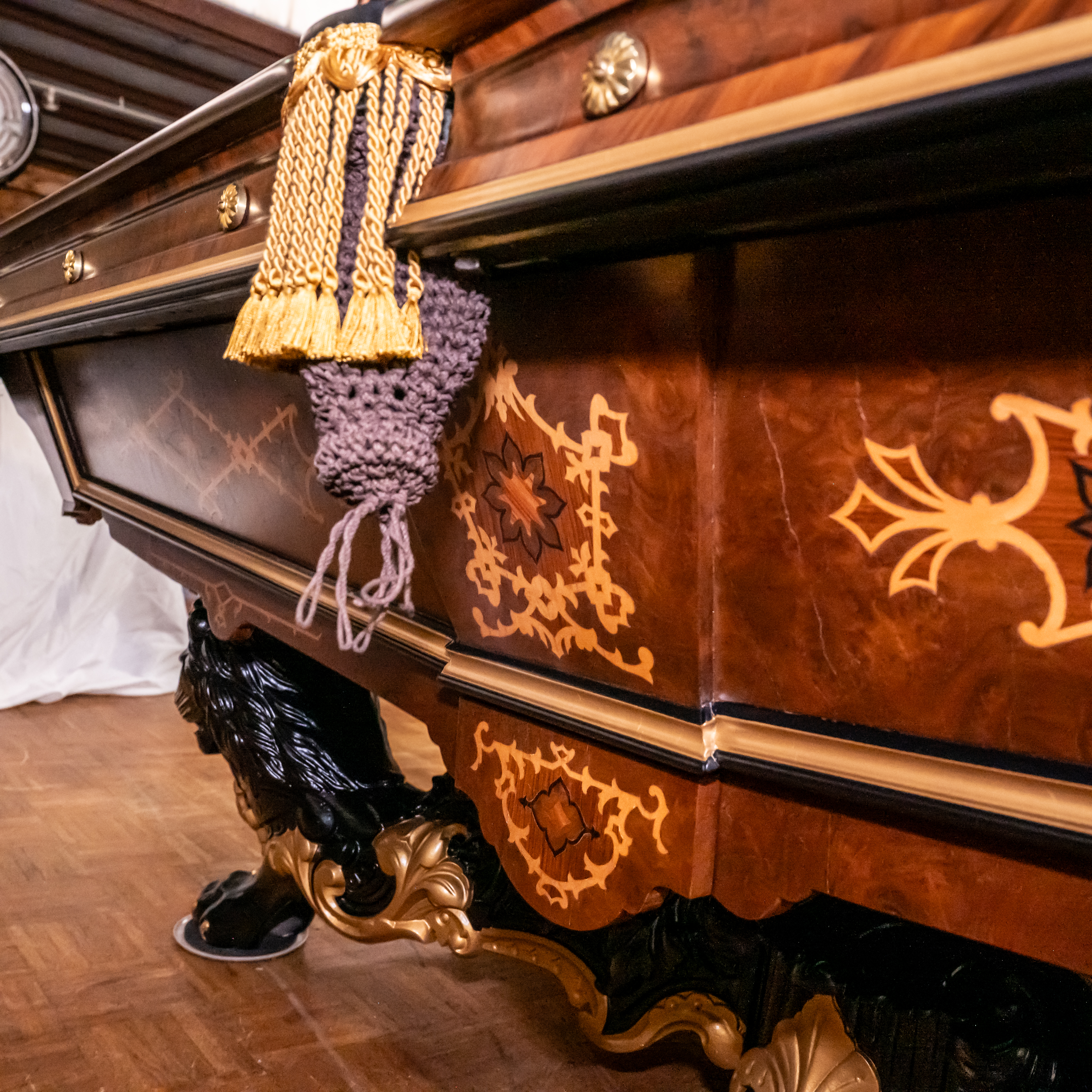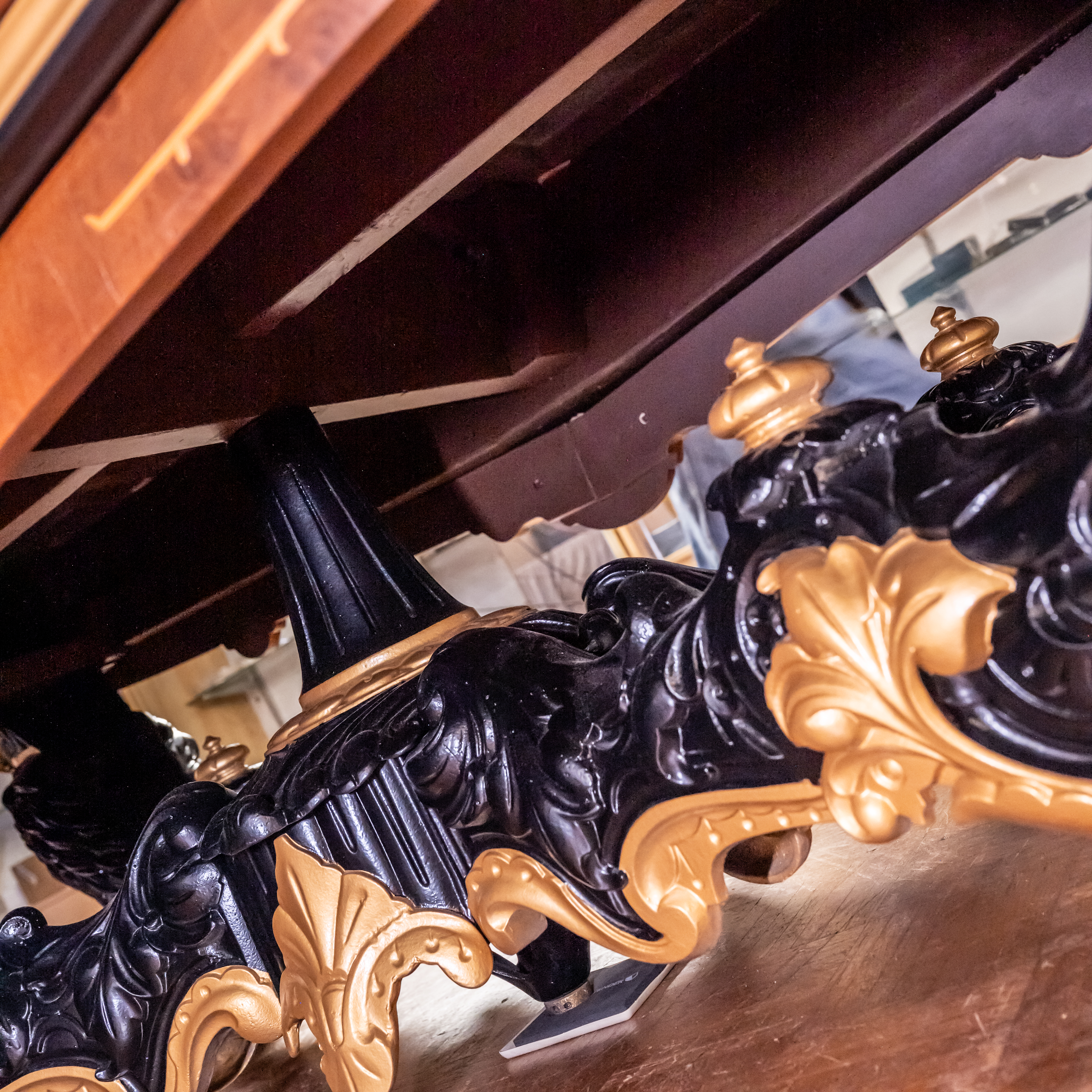 A very early example of the Brunswick Monarch table produced in the 1870s. Walnut background with extensive inlay of exotic woods on all surfaces. Genuine 18-karat gold accents. Highly desirable nine-foot X 4.5’W size. Four-piece slate playing surface.