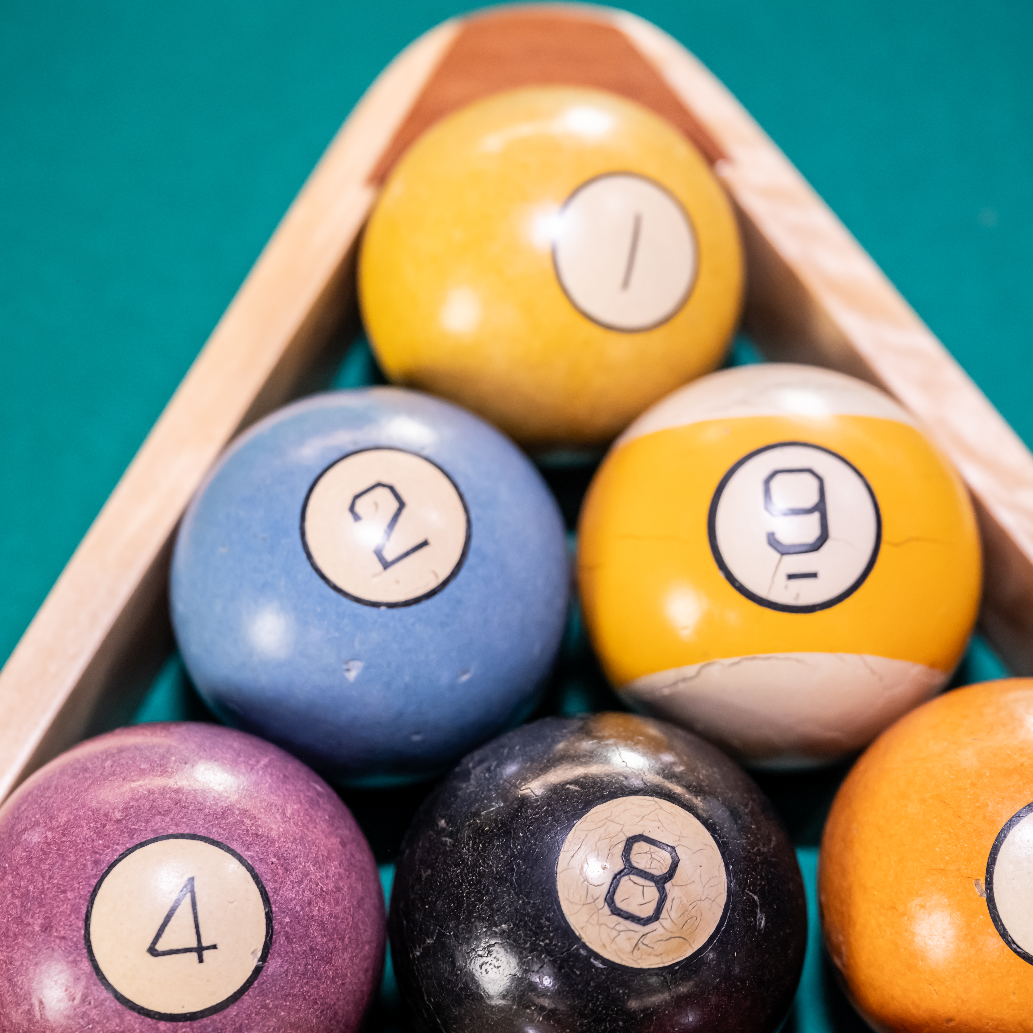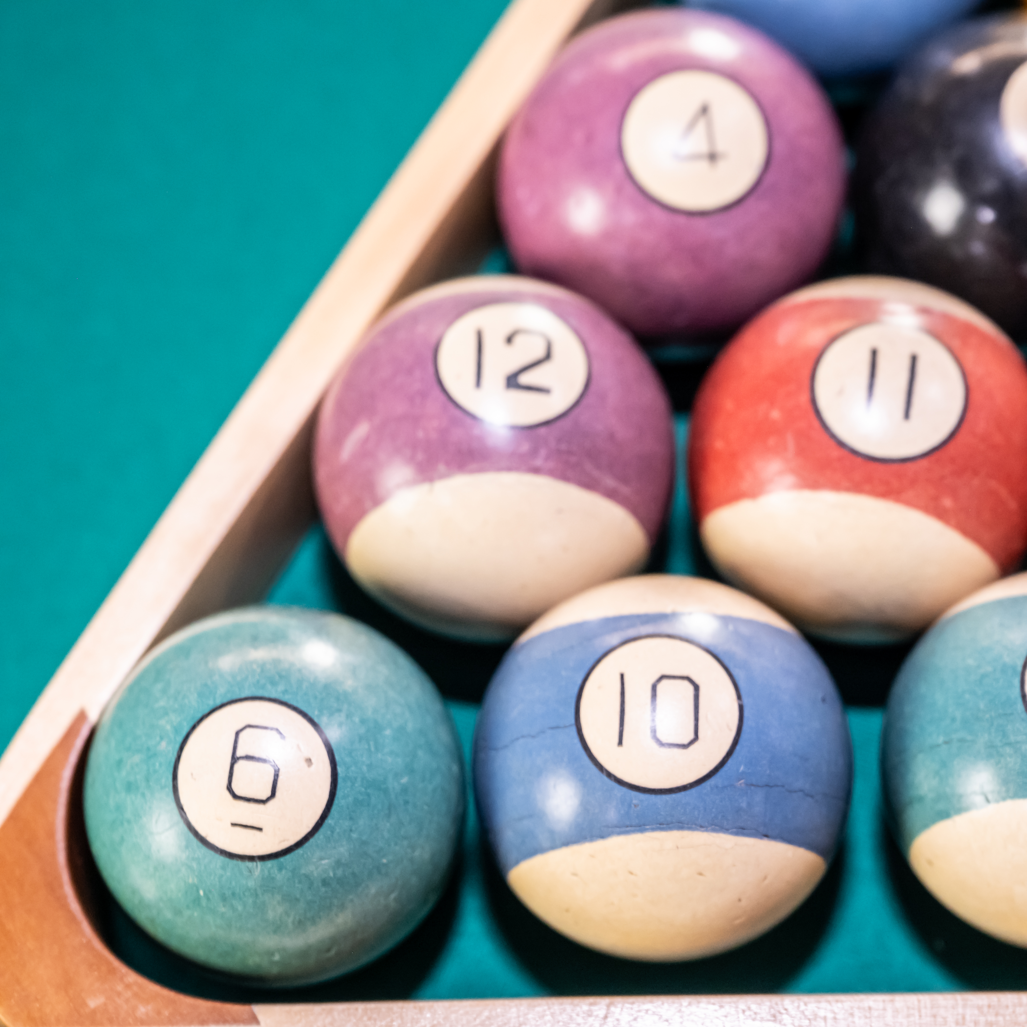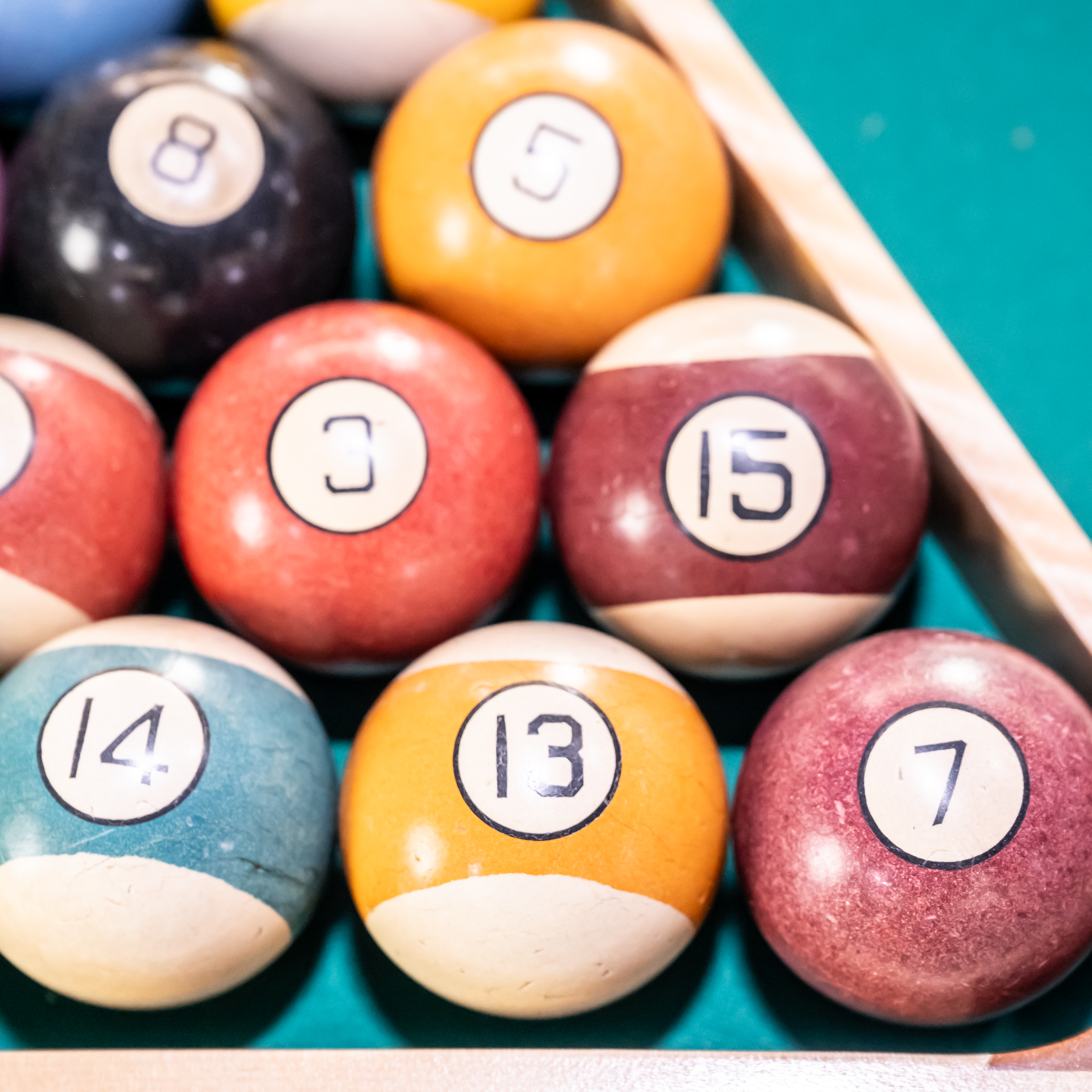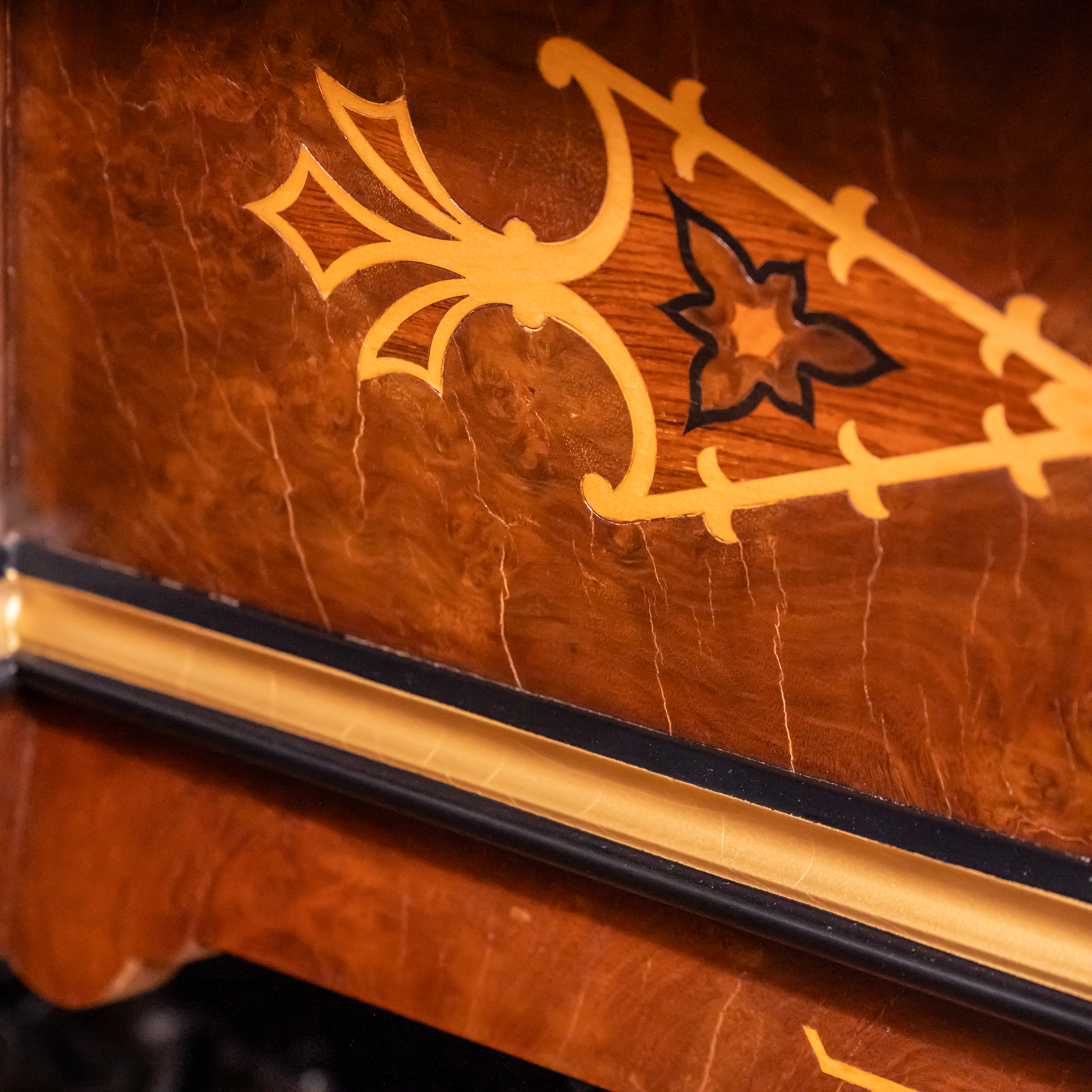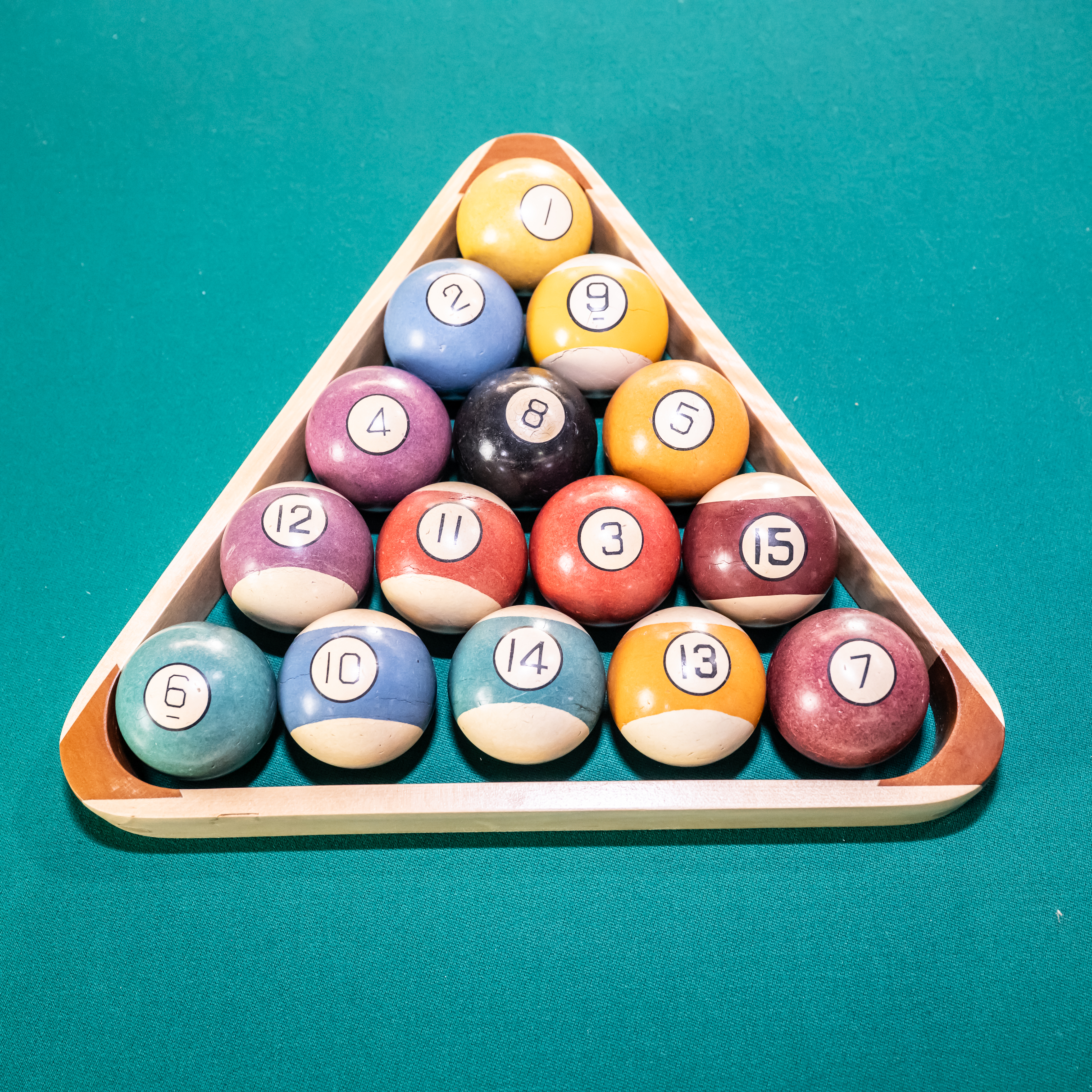 A very early example of the Brunswick Monarch table produced in the 1870s. Walnut background with extensive inlay of exotic woods on all surfaces. Genuine 18-karat gold accents. Highly desirable nine-foot X 4.5’W size. Four-piece slate playing surface.