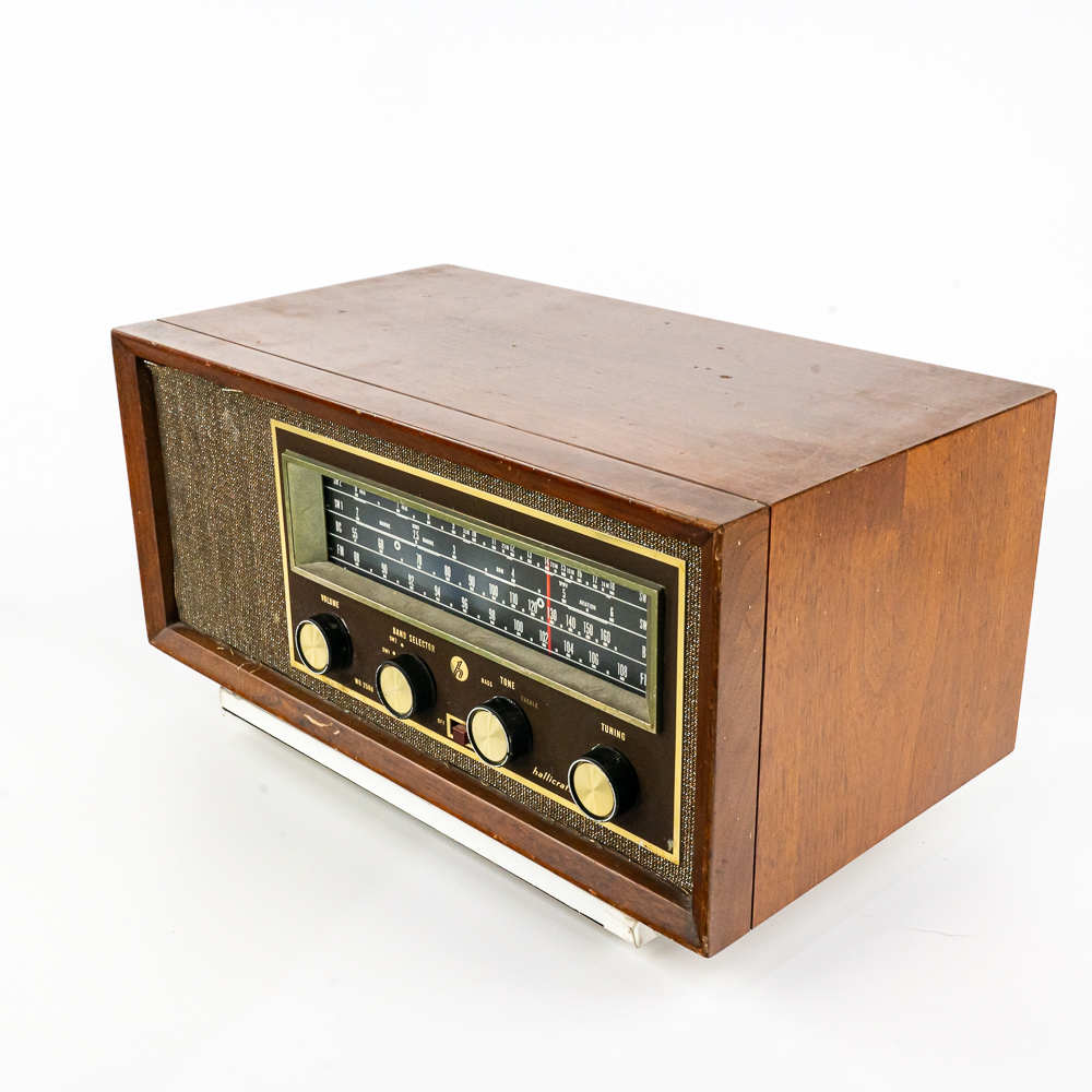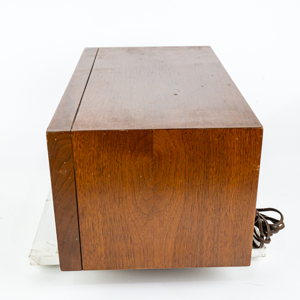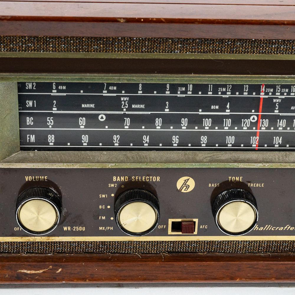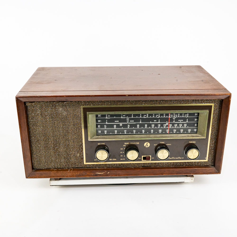 Vintage Hallicrafters model WR-2000 tuner receiver. Approximately 7.25″t x 8.5″w x 15.5″l and in good overall condition. Plugs, powers and lights up; able to get a couple stations. Wood case carries a couple minor blemishes such as a scratch just below the volume knob and a couple stray gold strands. Please use photos to judge condition and bid accordingly. Measures 15.5″ wide, 7.5″ tall, 8.75″ deep.