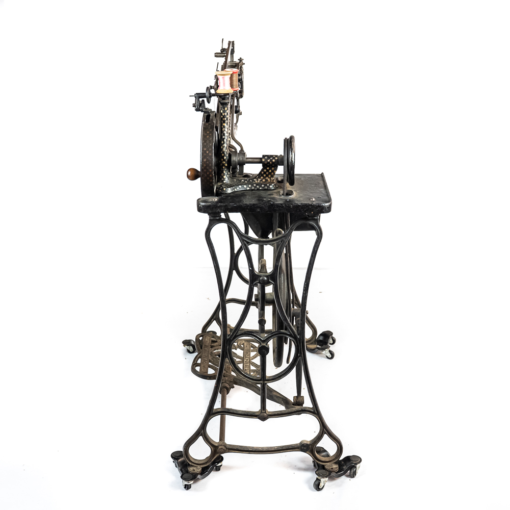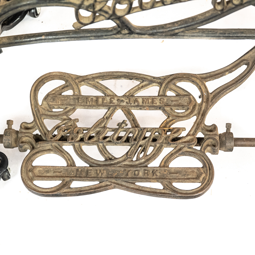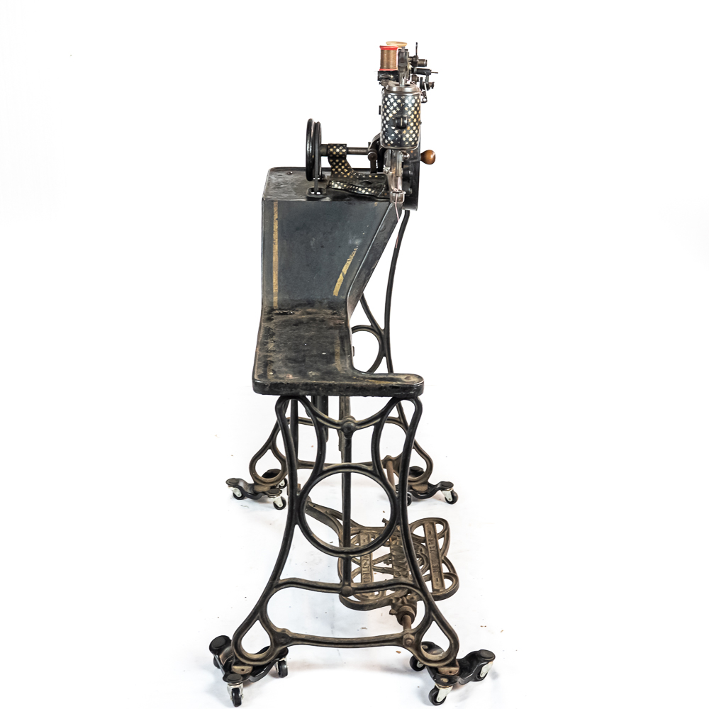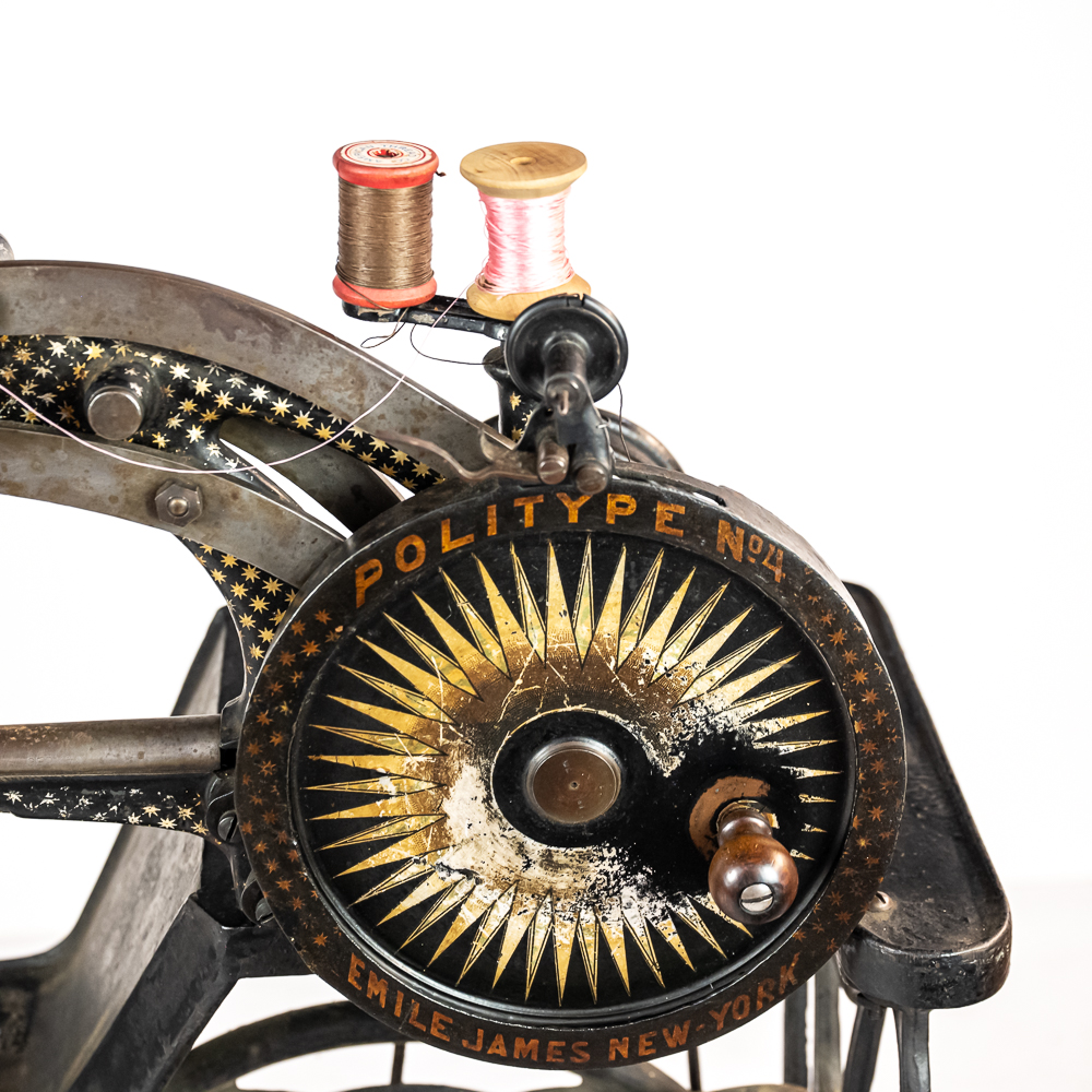 PRICE LOWERED! Wonderful foot treadle powered leather stitching machine made by Emile James of New York circa 1900. This Politype No. 4 is still prized and used by leather makers today. In overall VG condition with no breaks or repairs to the castings, it retains most of its original paint and decorations. Works well both by hand crank and treadle operation. Serial No.207119. Measures 44″ tall, 33″ wide, 17″ deep. NOTE: Pickup/transport required. Contacts available post auction.
