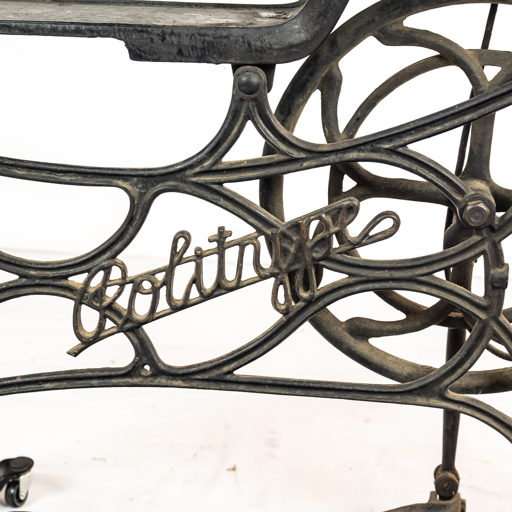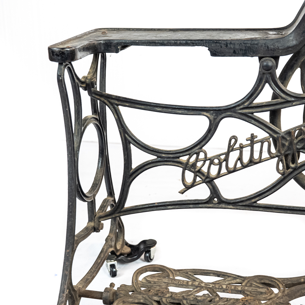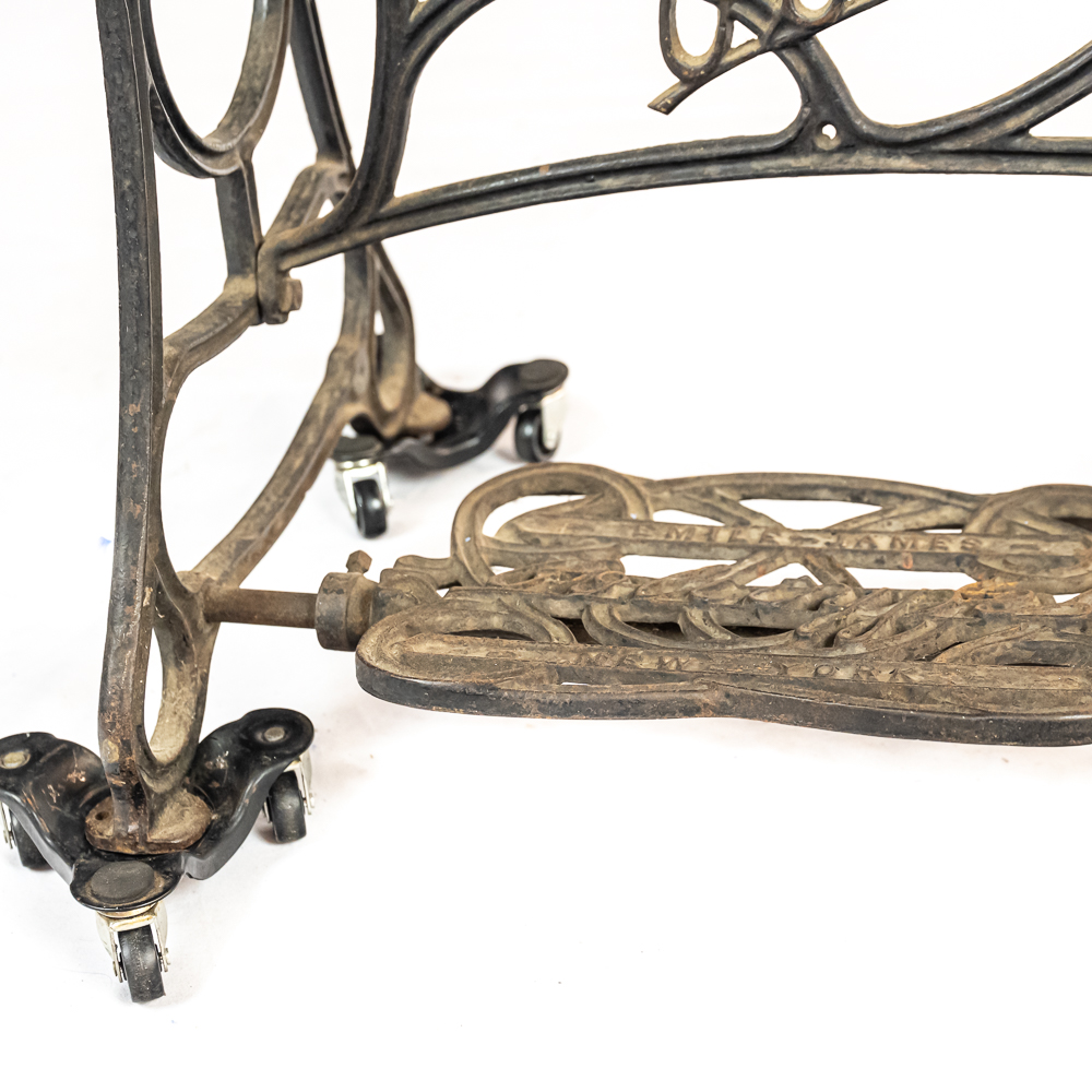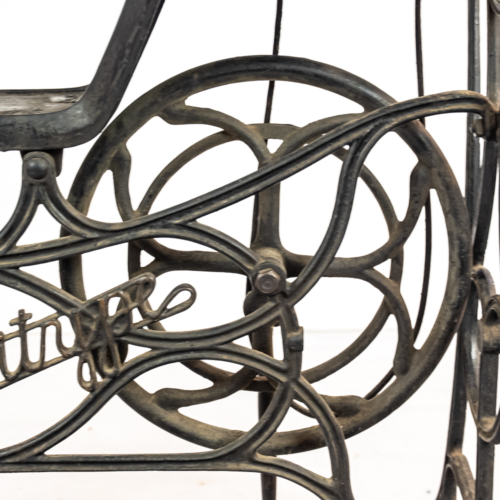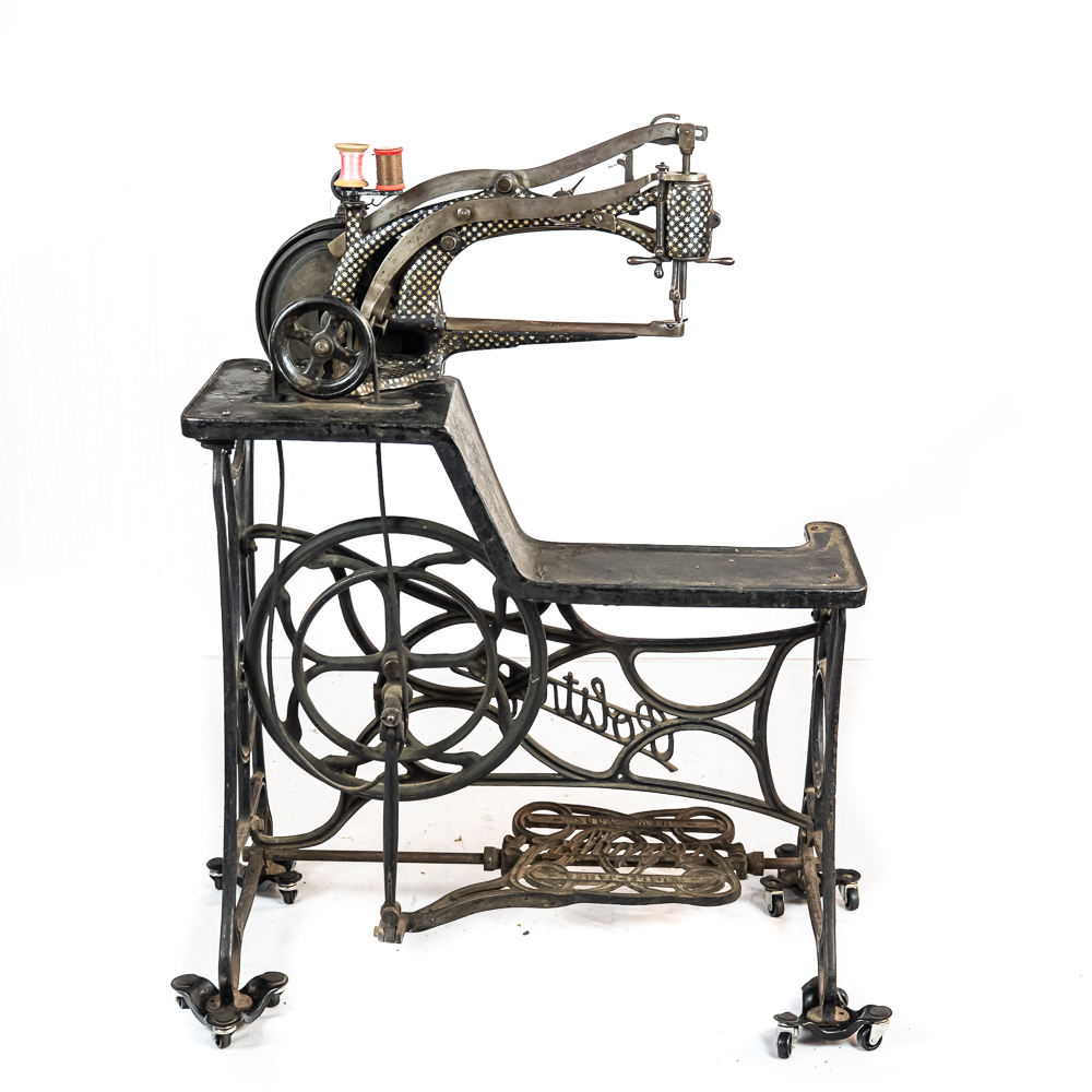 PRICE LOWERED! Wonderful foot treadle powered leather stitching machine made by Emile James of New York circa 1900. This Politype No. 4 is still prized and used by leather makers today. In overall VG condition with no breaks or repairs to the castings, it retains most of its original paint and decorations. Works well both by hand crank and treadle operation. Serial No.207119. Measures 44″ tall, 33″ wide, 17″ deep. NOTE: Pickup/transport required. Contacts available post auction.