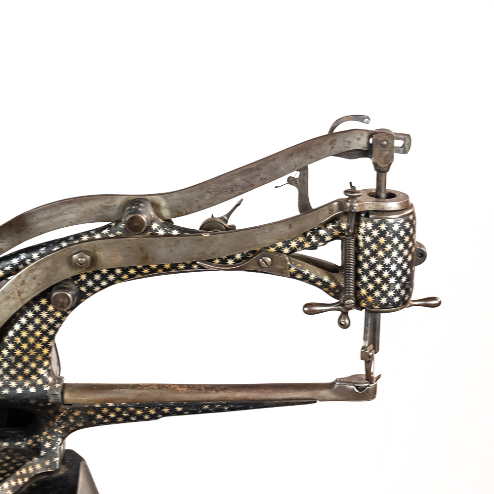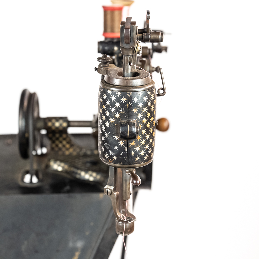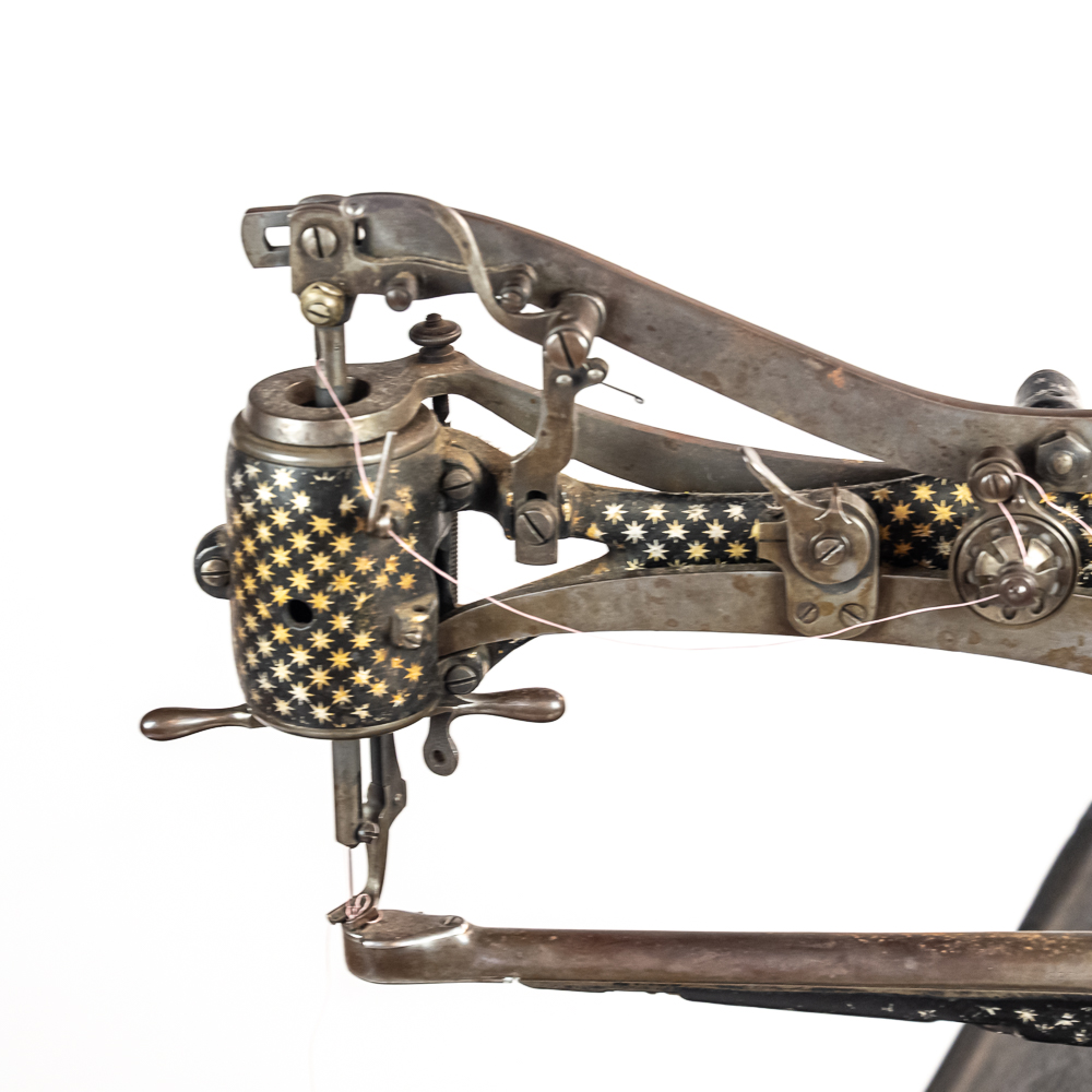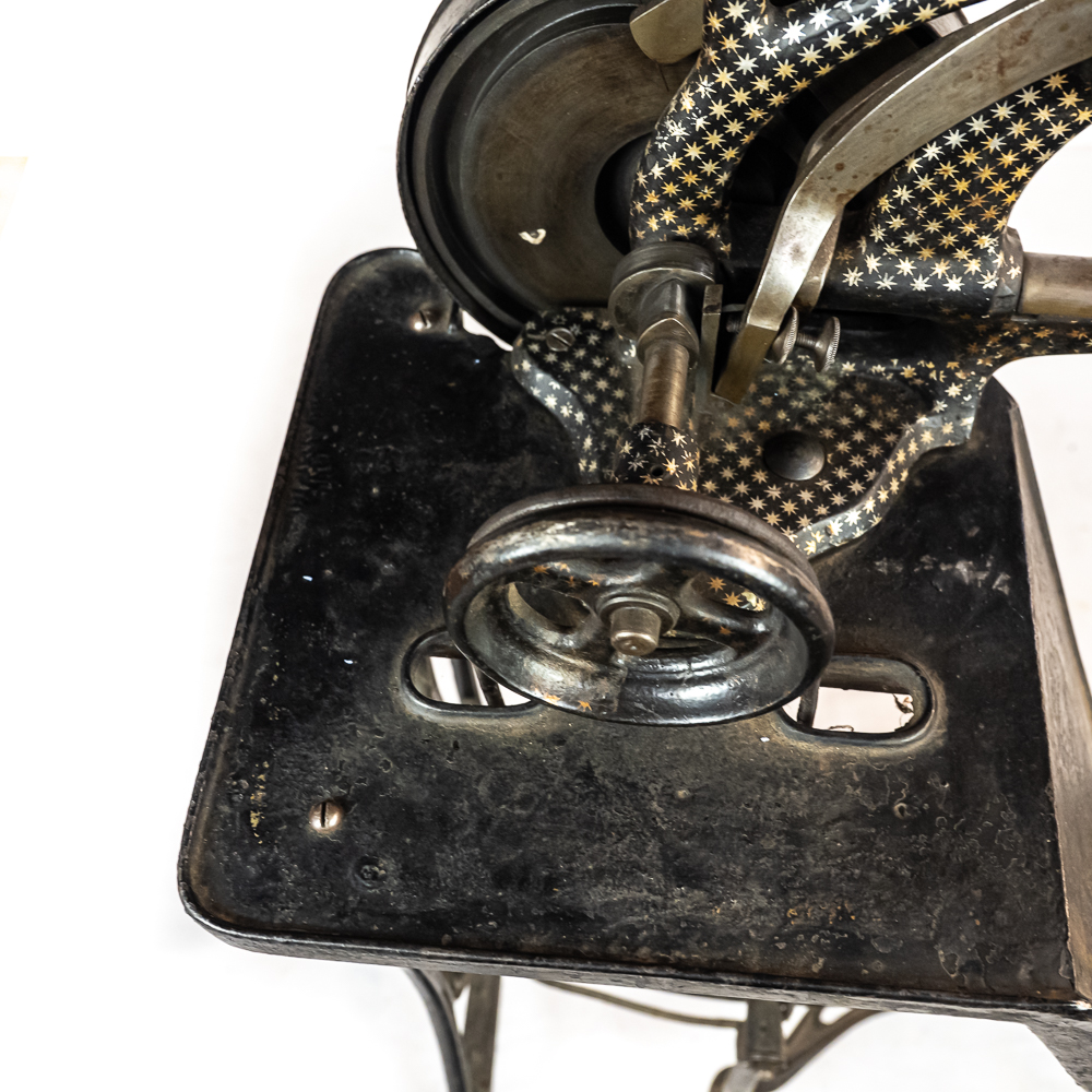 PRICE LOWERED! Wonderful foot treadle powered leather stitching machine made by Emile James of New York circa 1900. This Politype No. 4 is still prized and used by leather makers today. In overall VG condition with no breaks or repairs to the castings, it retains most of its original paint and decorations. Works well both by hand crank and treadle operation. Serial No.207119. Measures 44″ tall, 33″ wide, 17″ deep. NOTE: Pickup/transport required. Contacts available post auction.