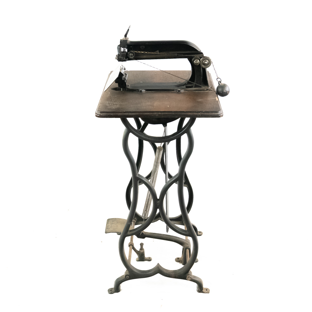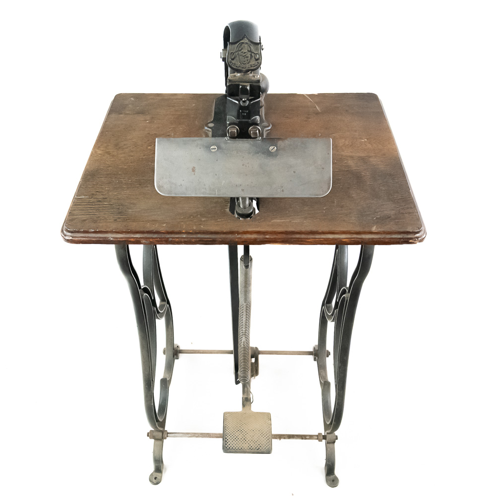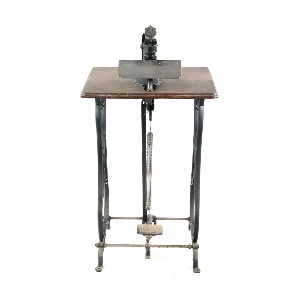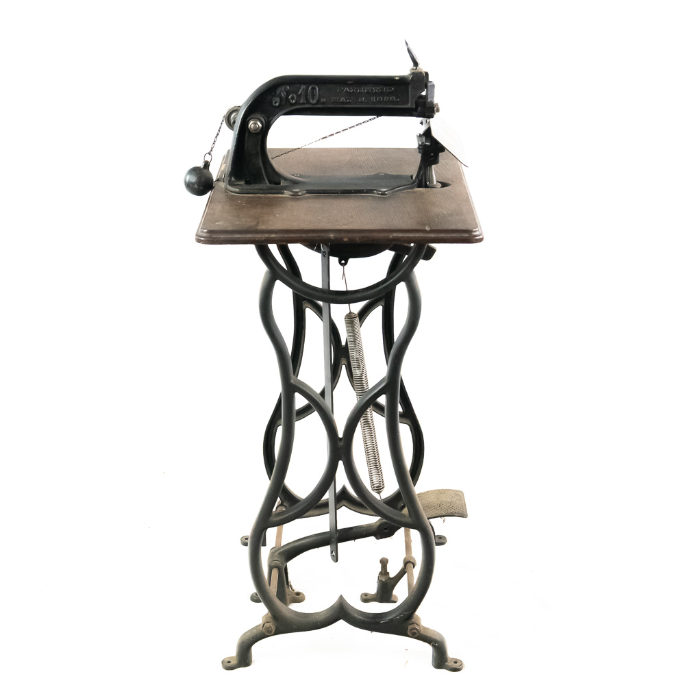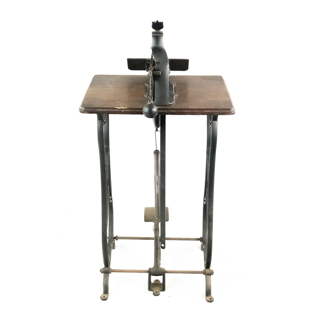 Unusual cast iron press of some type mounted on an oak top sitting on an ornate cast iron stand that looks similar to early sewing machines. Patent dated 1898, model # 10. Has a foot control pedal and looks to be fairly complete, possibly missing a small push pin or chisel type pin. Overall good condition with no breaks or cracks.