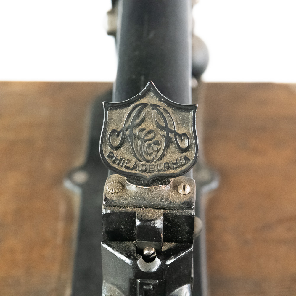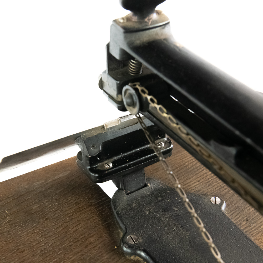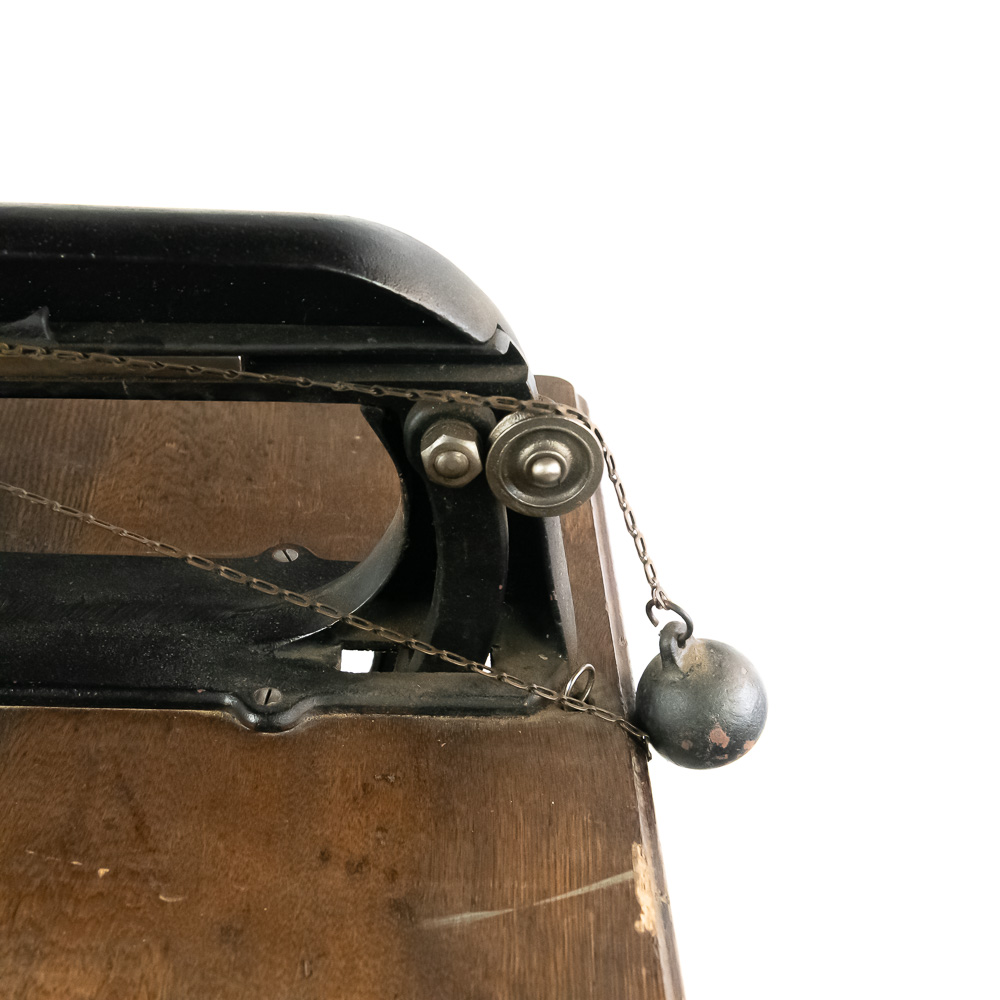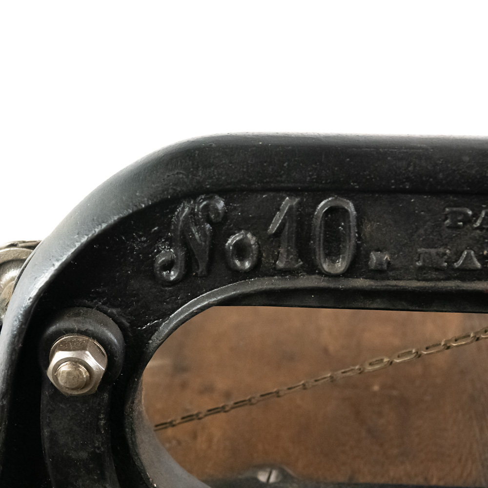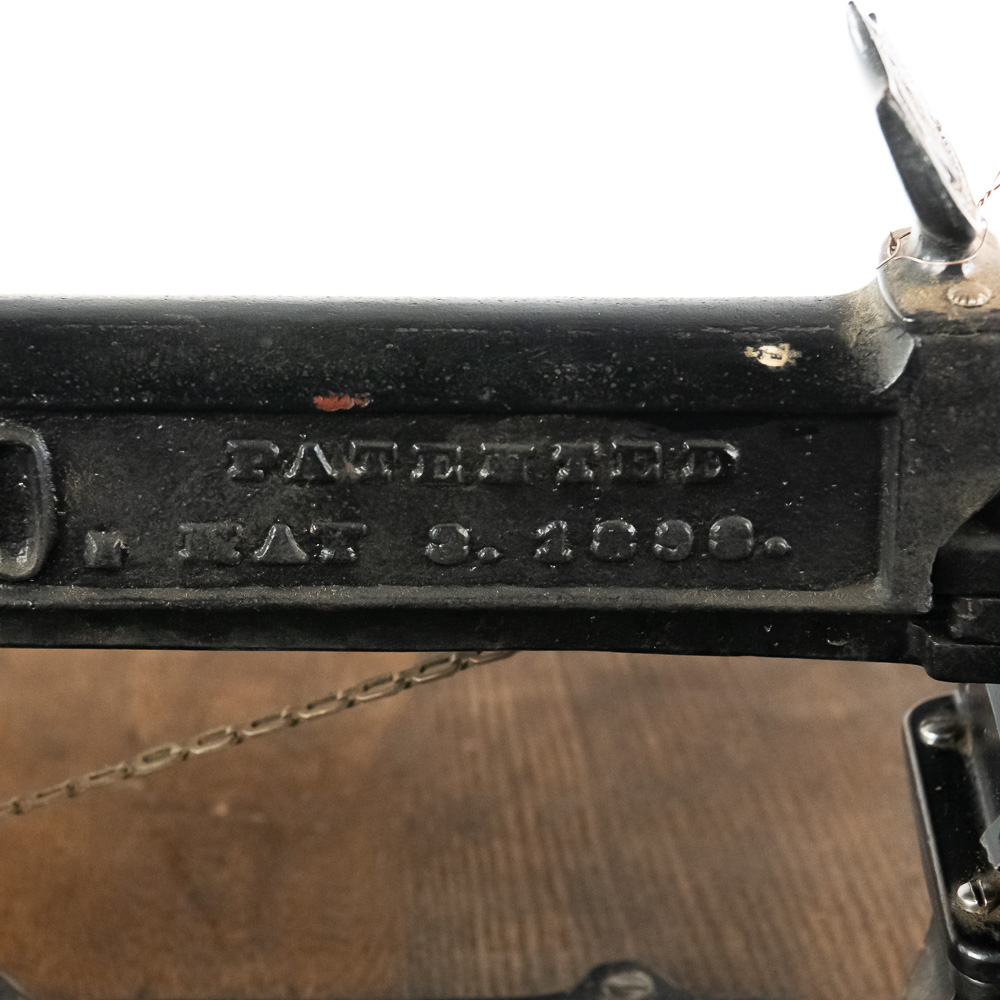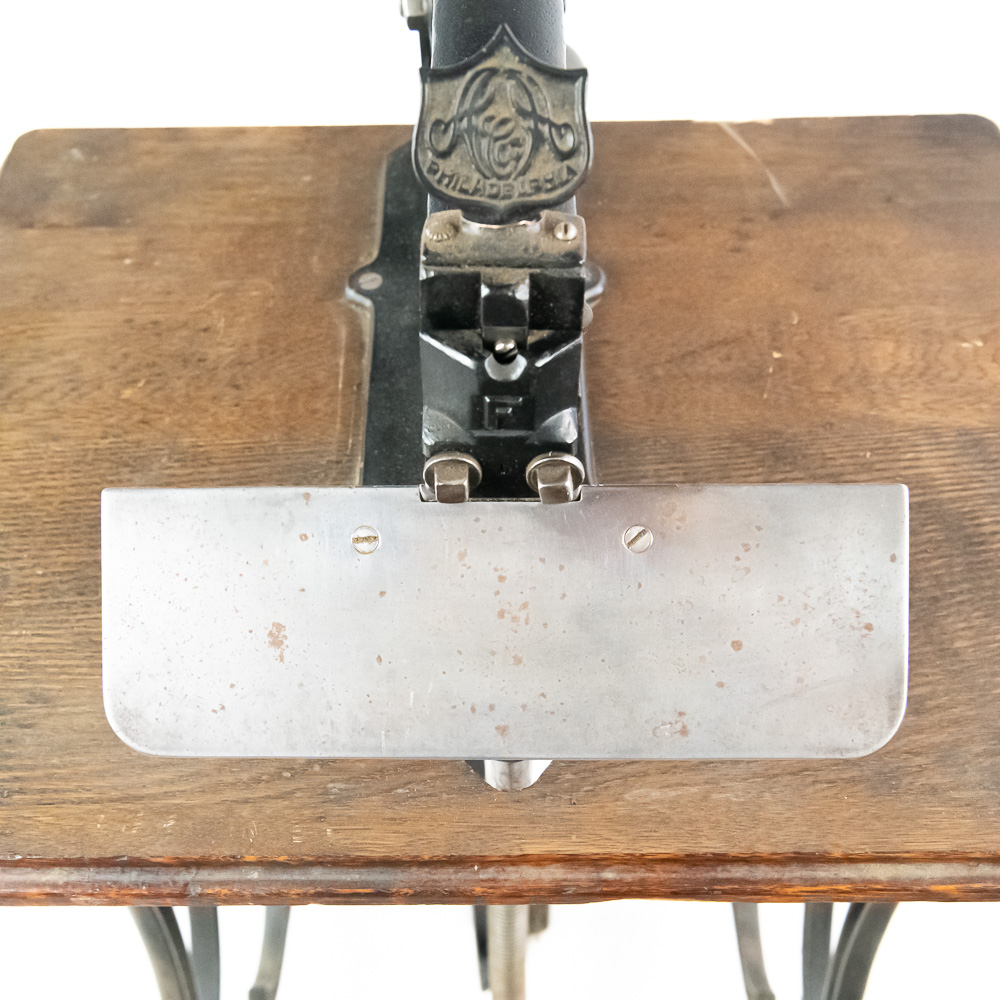 Unusual cast iron press of some type mounted on an oak top sitting on an ornate cast iron stand that looks similar to early sewing machines. Patent dated 1898, model # 10. Has a foot control pedal and looks to be fairly complete, possibly missing a small push pin or chisel type pin. Overall good condition with no breaks or cracks.