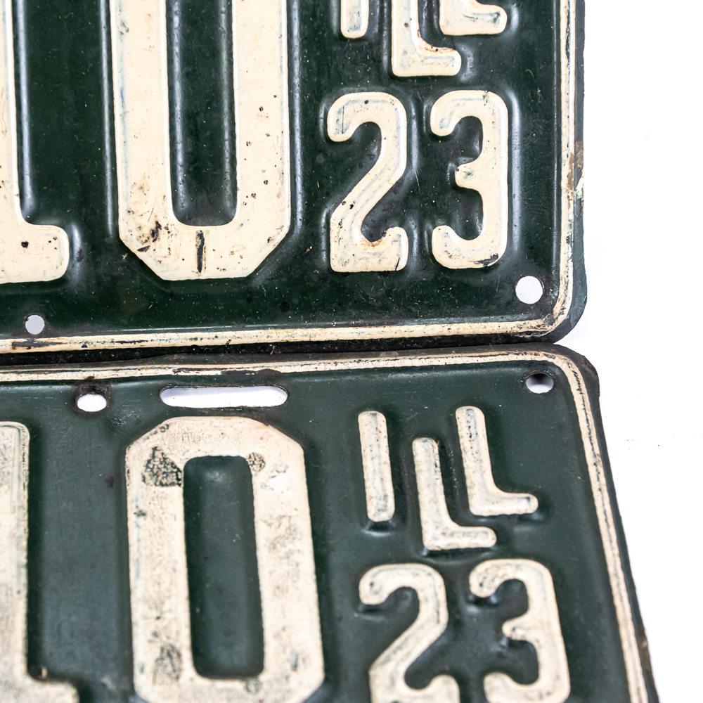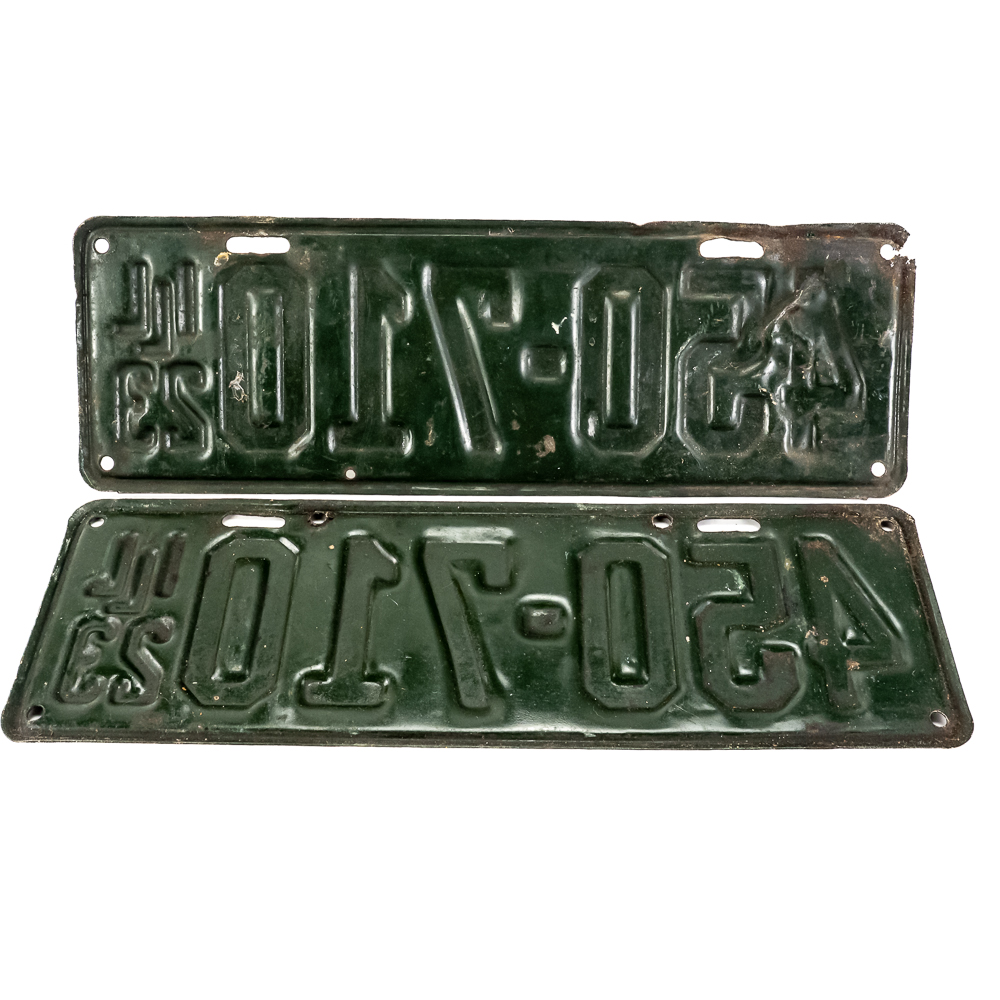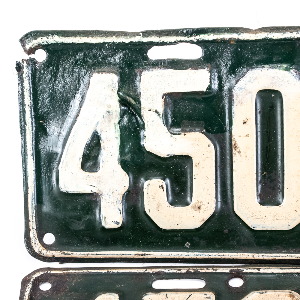 # 450-710 pair in fair condition with one plate having damage and paint touch up to the upper left corner, maybe from an accident? See pics.