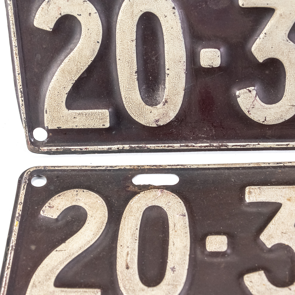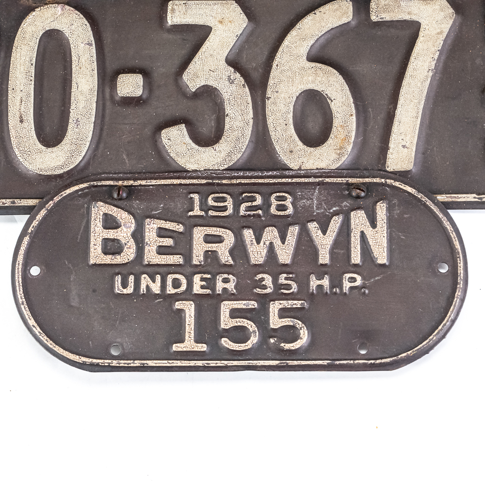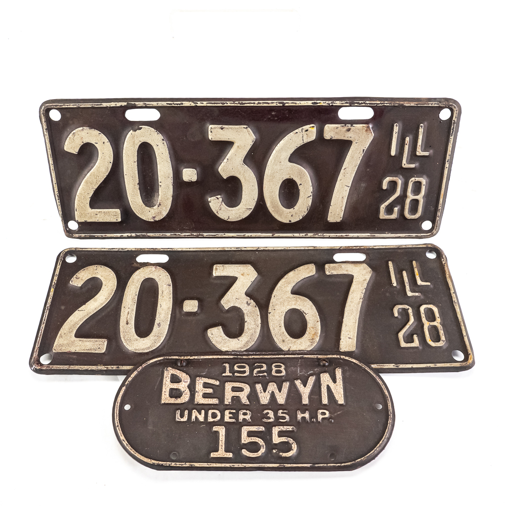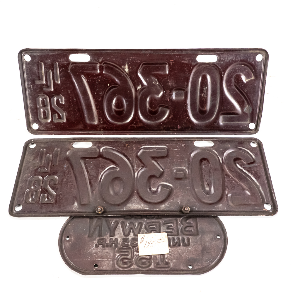 # 20-367 pair in good original condition with a 1928 Berwyn Tax Tag mounted to the bottom of one plate. See pics. From the Jim Dvorak collection.