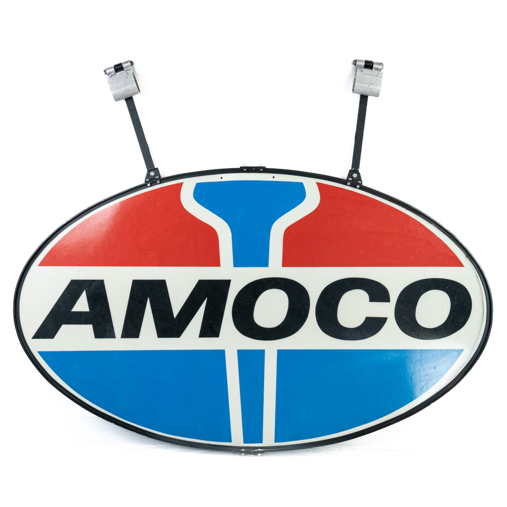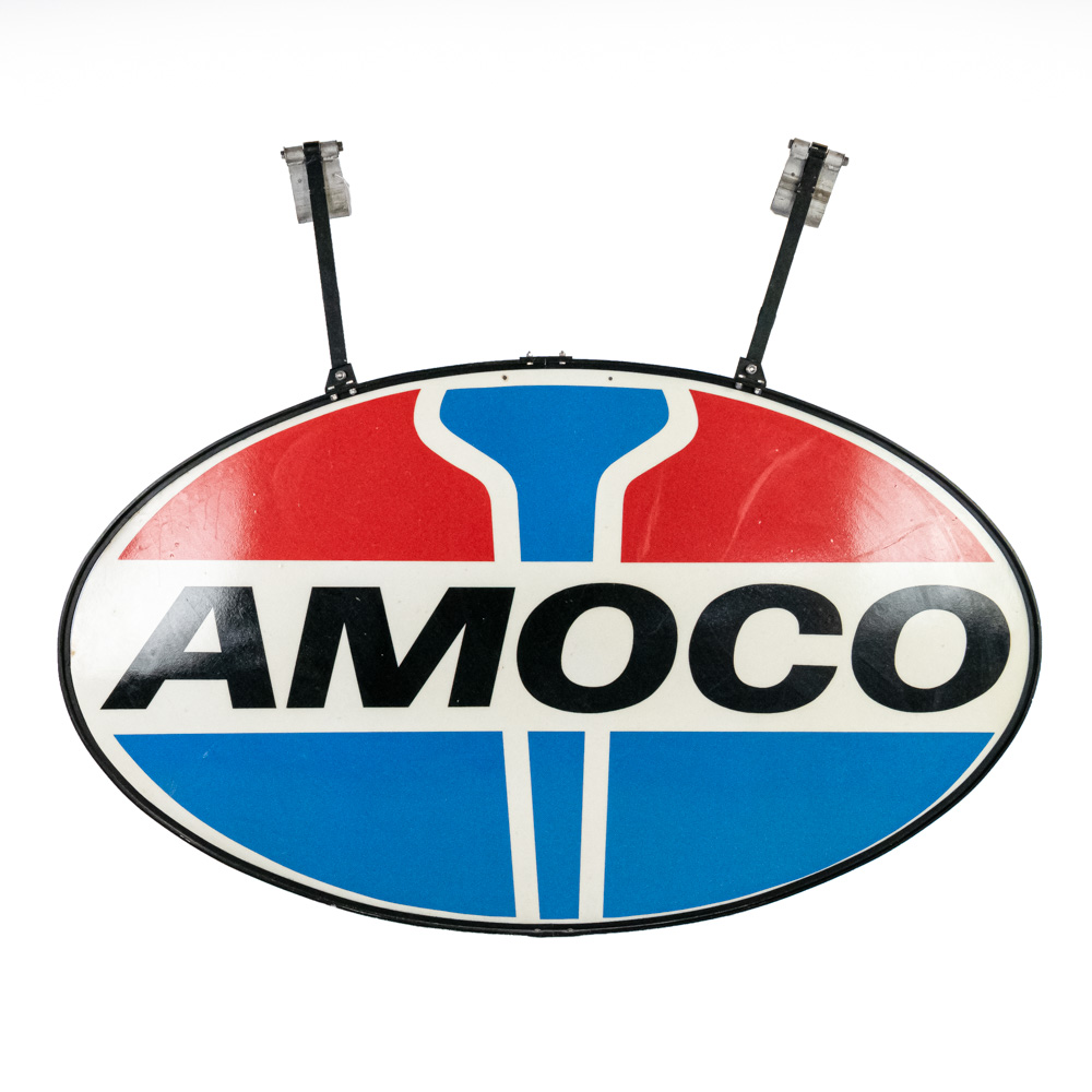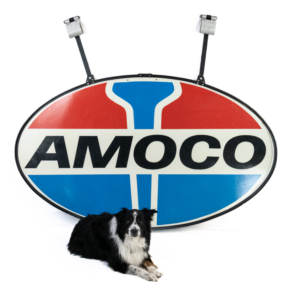 Iconic “AMOCO” framed “fiberglass” oval double sided service station advertising sign. Very good to good overall condition with some age and wear related cosmetic imperfections including discoloration, stray marks, scratches and peripheral oxidation. Presents well with strong RED, WHITE & BLUE color featured inside customized hanging frame with two hanging “hook arm” attachments, sign approximately 45″t x 3″d x 75″l . Perfect addition to your collection; Fantastic gift idea. Please use photos to judge condition and bid accordingly.
