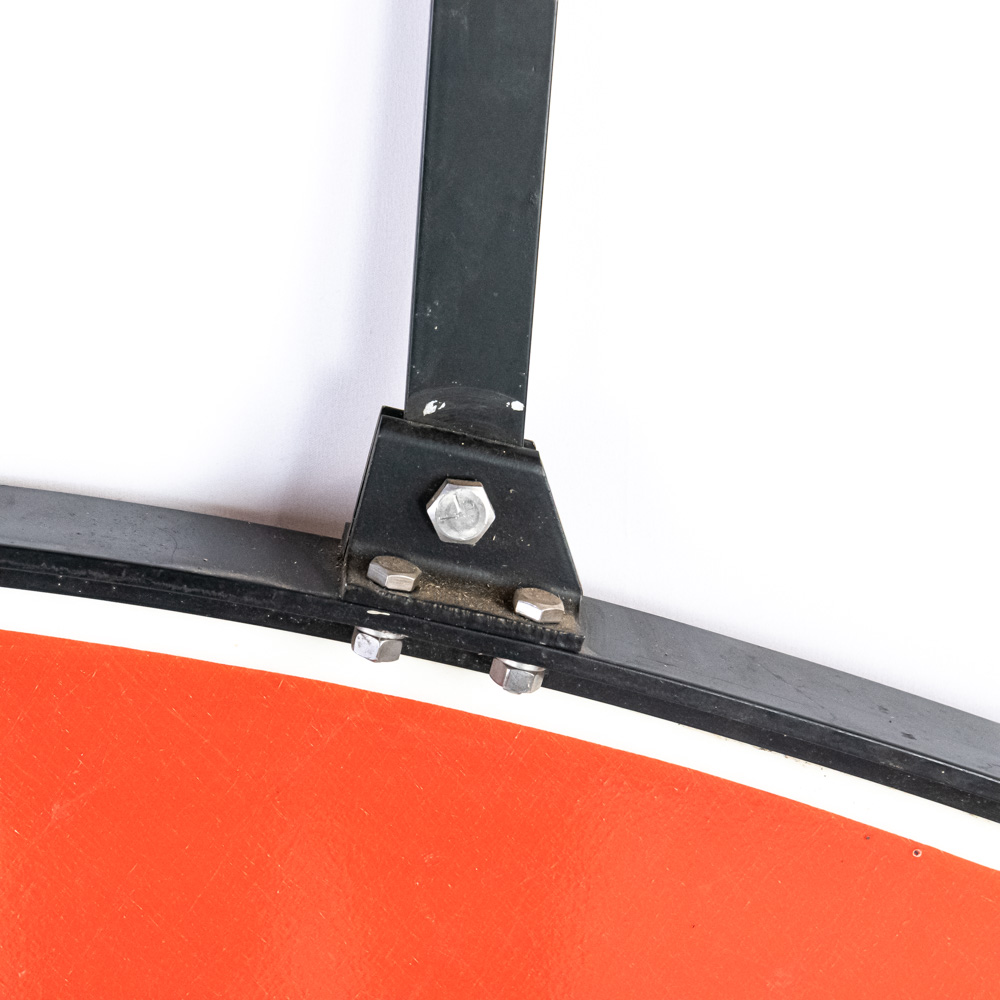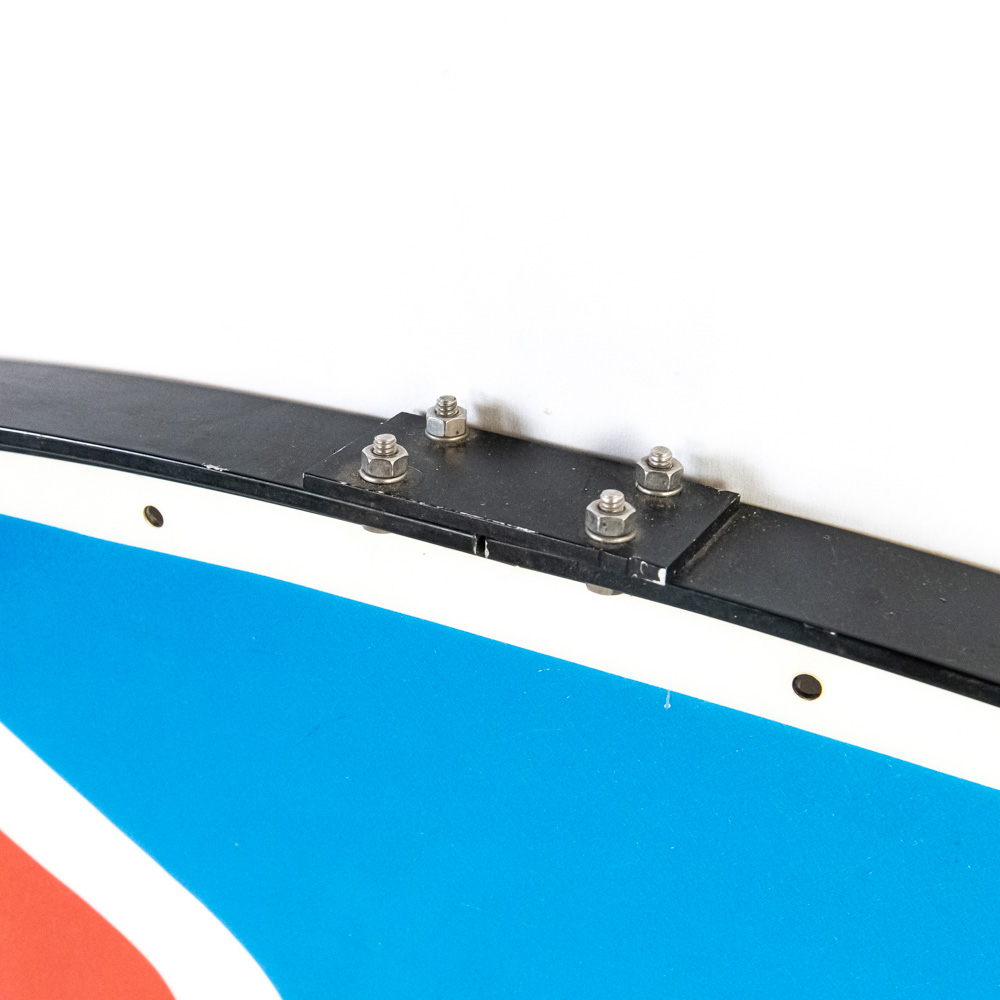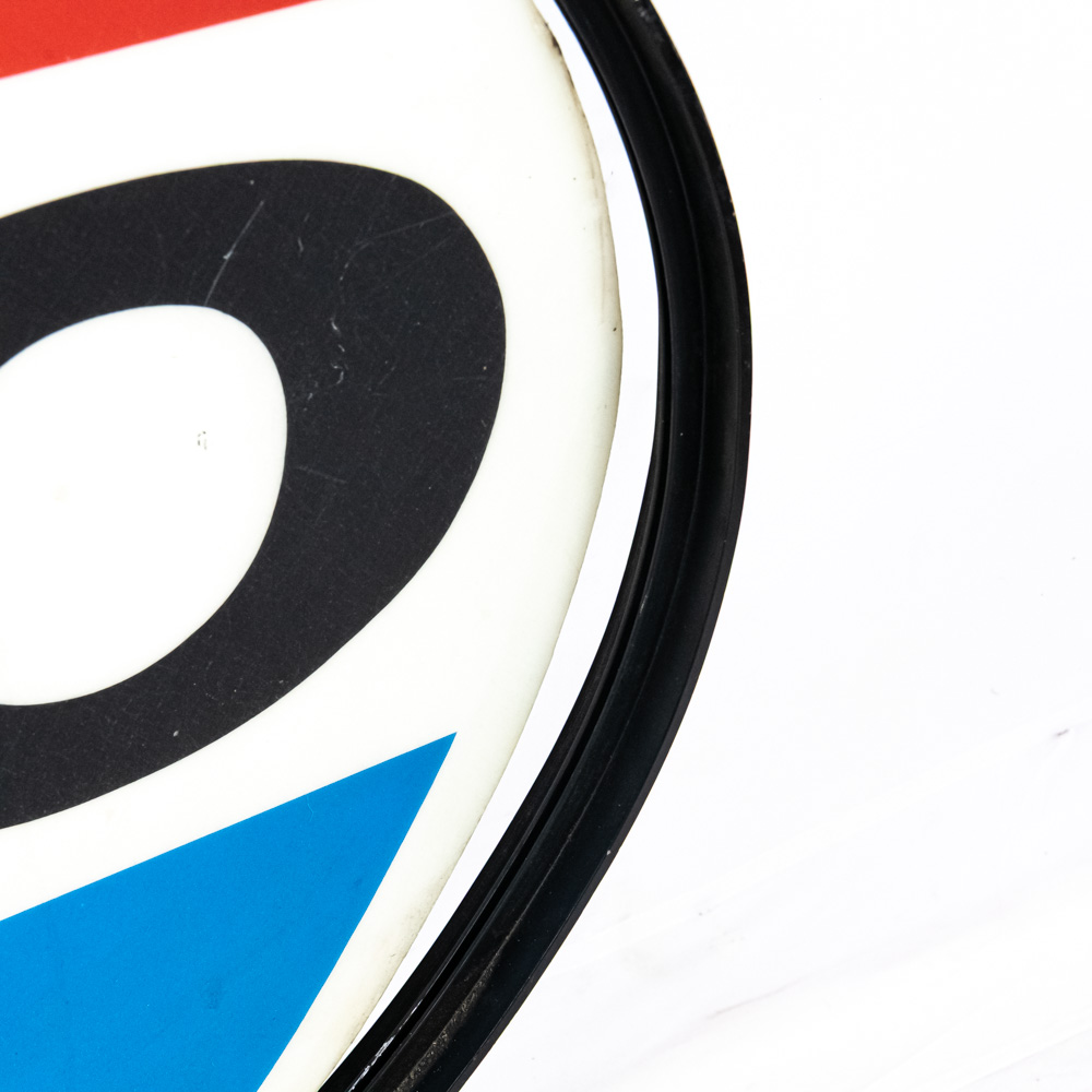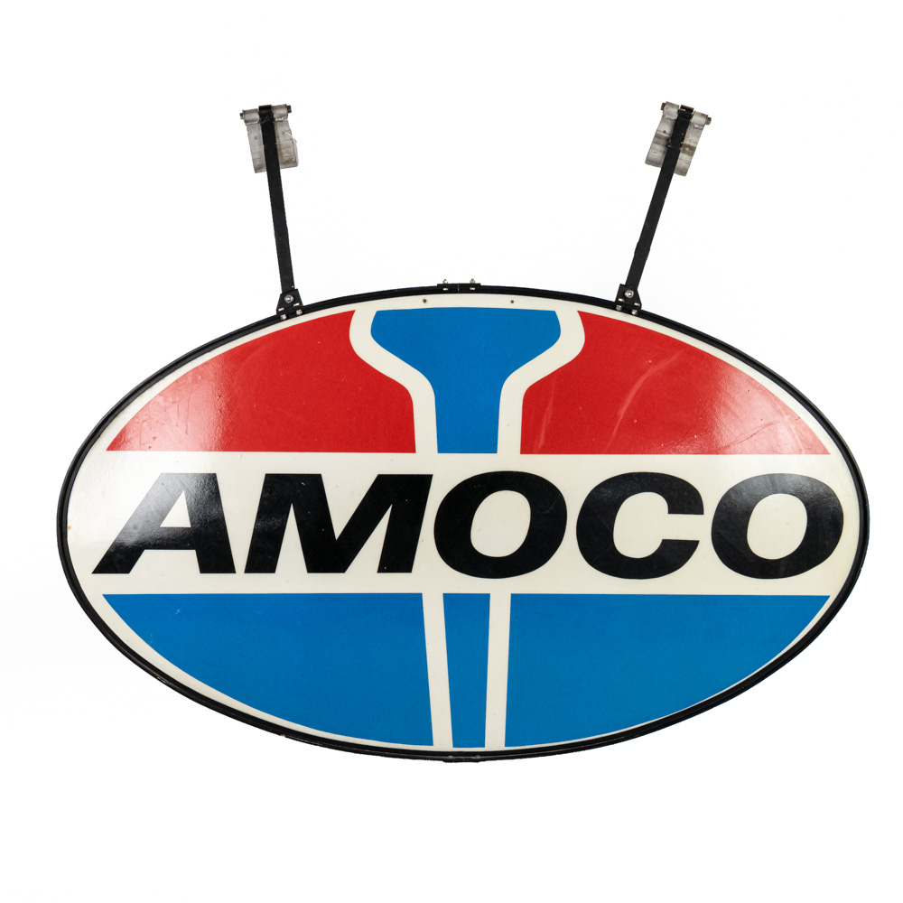 Iconic “AMOCO” framed “fiberglass” oval double sided service station advertising sign. Very good to good overall condition with some age and wear related cosmetic imperfections including discoloration, stray marks, scratches and peripheral oxidation. Presents well with strong RED, WHITE & BLUE color featured inside customized hanging frame with two hanging “hook arm” attachments, sign approximately 45″t x 3″d x 75″l . Perfect addition to your collection; Fantastic gift idea. Please use photos to judge condition and bid accordingly.