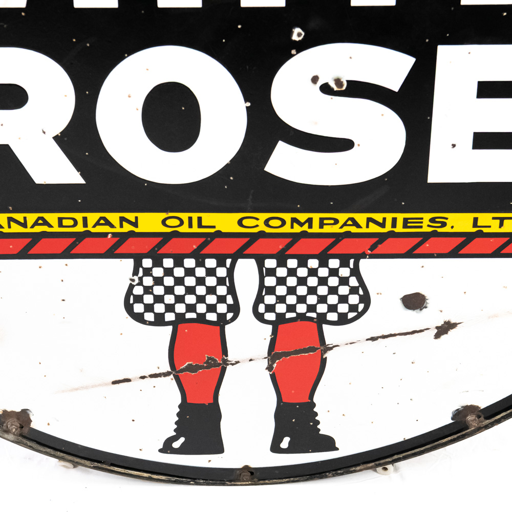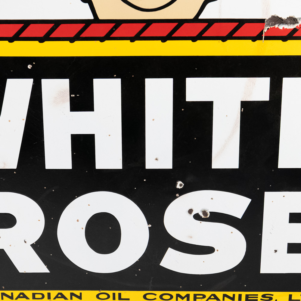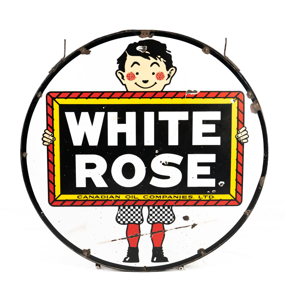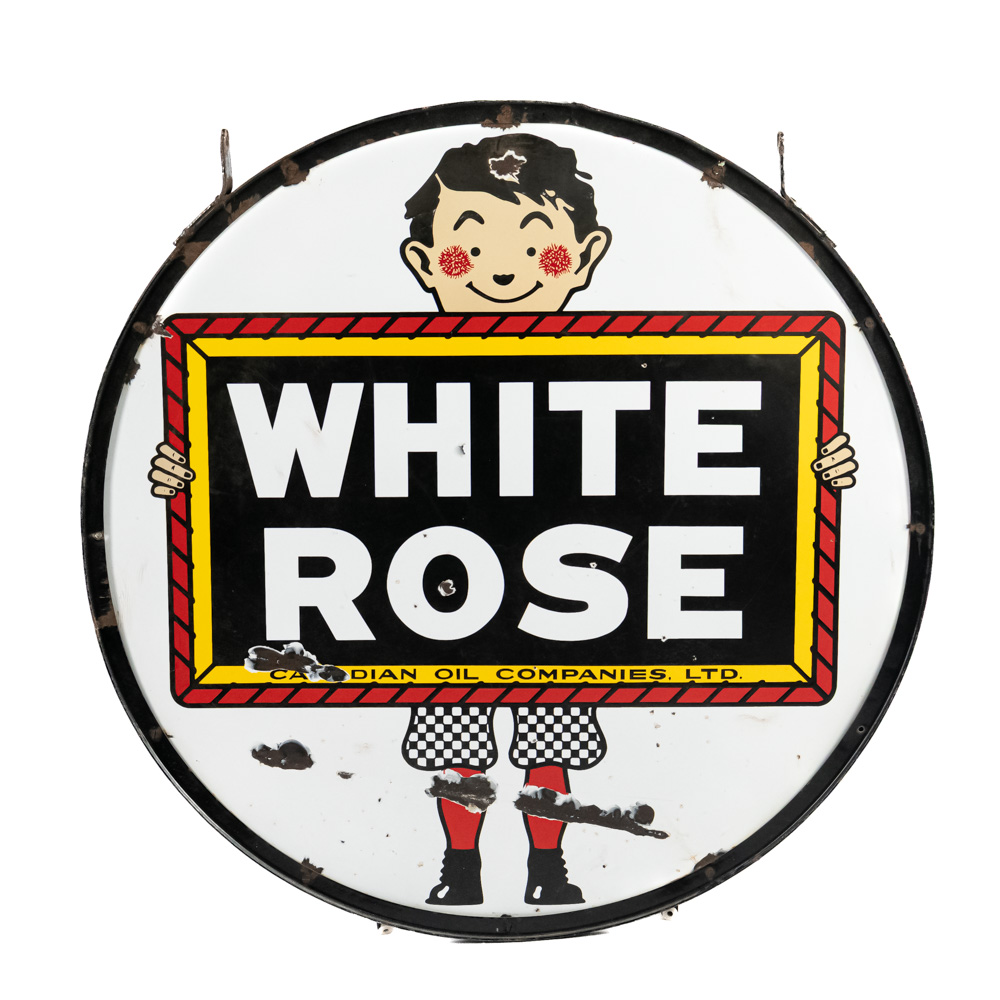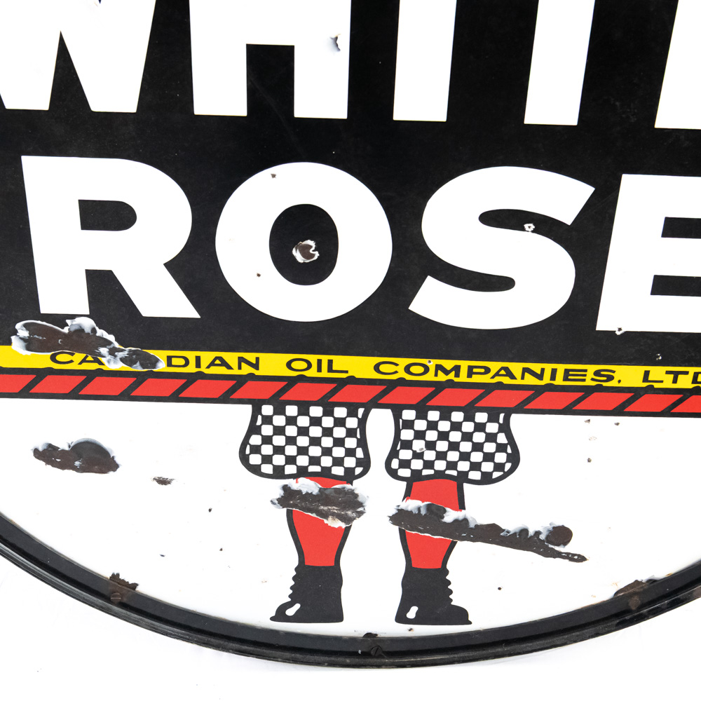 48″ White Rose double sided porcelain advertising sign showcased inside metal frame collar with two attachment loops. Presents extremely well with strong color and gloss, in good overall condition with some stray marks, scratches, chipped porcelain spots and oxidation. Perfect addition to your collection, great gift idea. Please use photos to judge condition and bid accordingly.