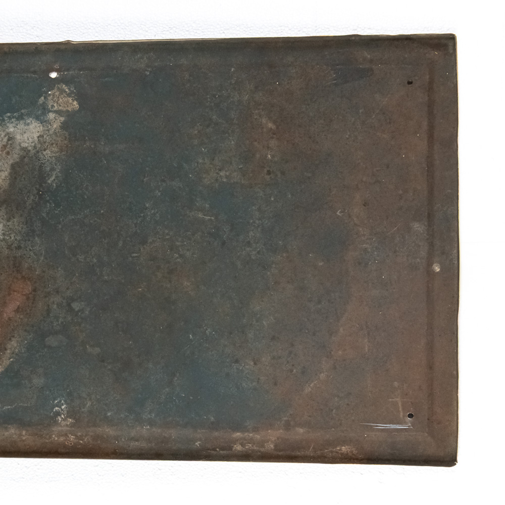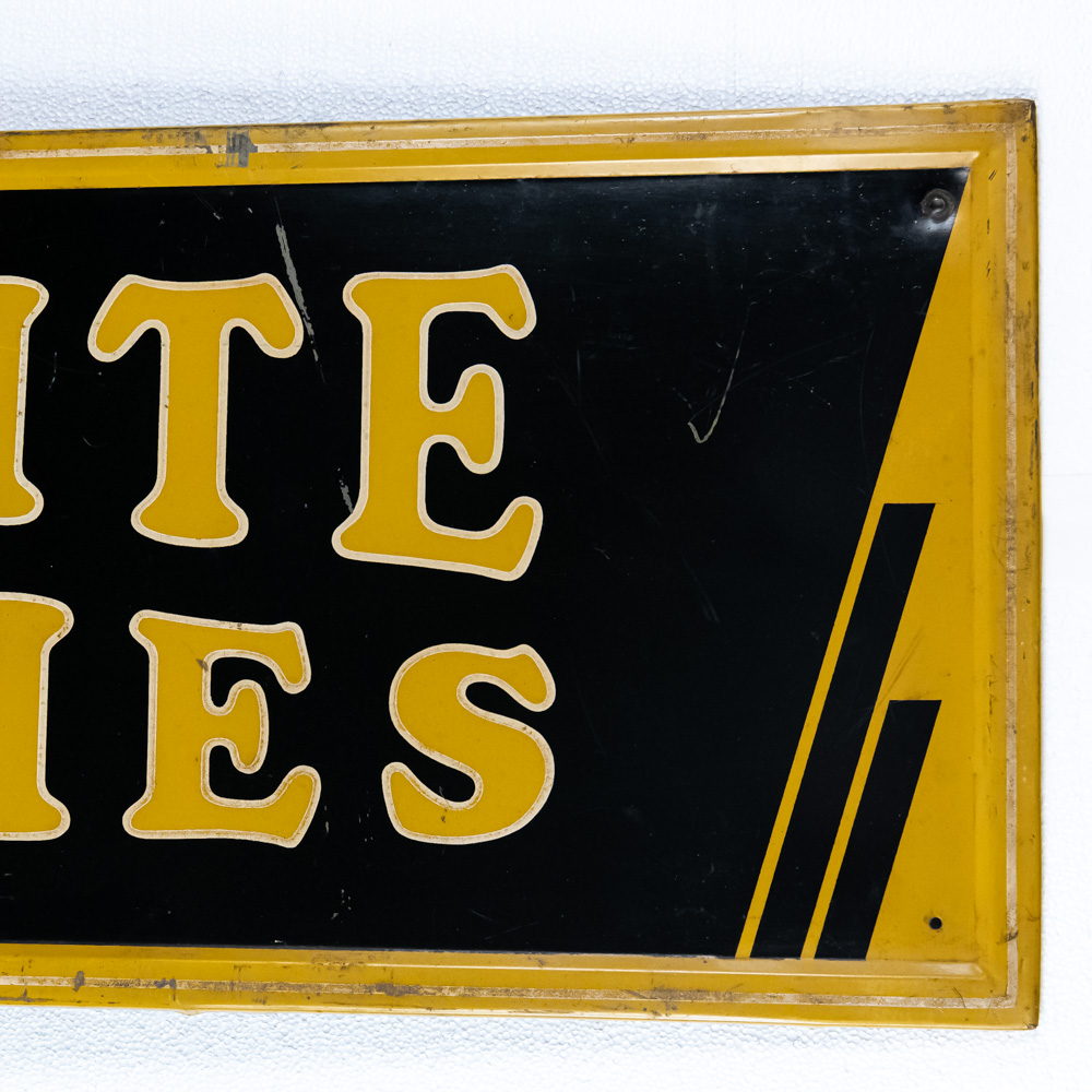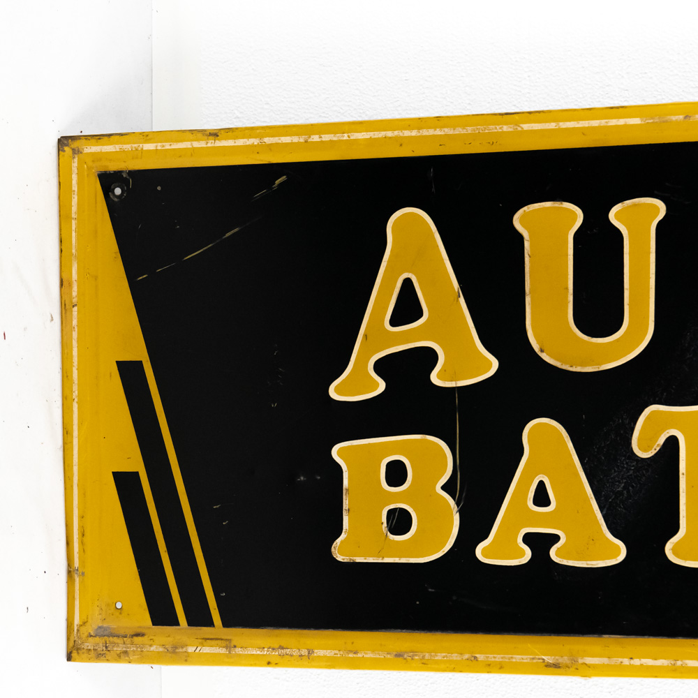 Auto-Lite Batteries single sided metal advertising sign. “Fogarty Dayton O. 1952-A ” stamped along bended edge, self framed and in very good to good overall condition with discoloration, stray marks, scratches and missing paint. Approximately 15.5″t x 53.5″w. Please use photos to judge condition and bid accordingly.