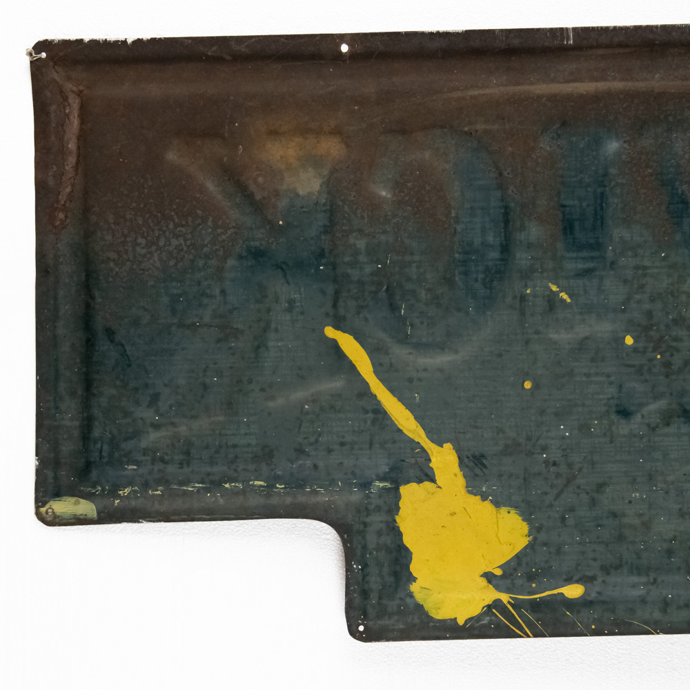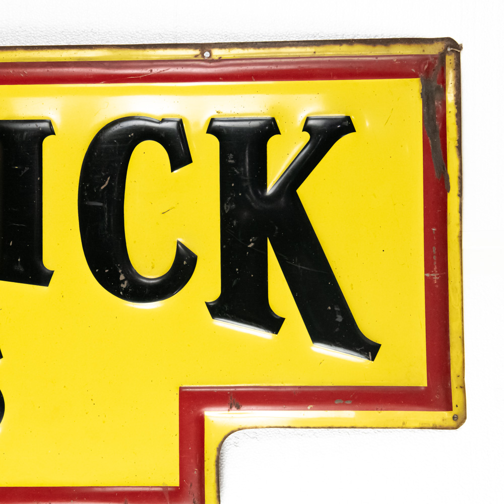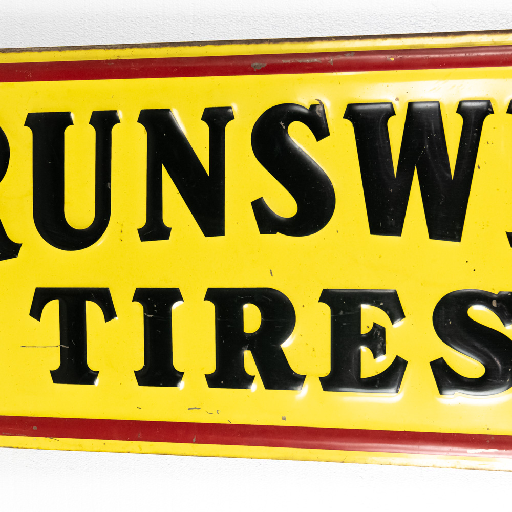 Large and in charge “Brunswick Tires” single sided, embossed metal advertising sign. Good overall condition with some discoloration, scratches, chipped paint / loss and oxidation. Approximately 20″t x 60″l. Please use photos to judge condition and bid accordingly.