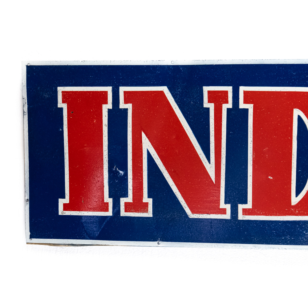 Vintage India Tires single sided tin advertising sign. Very good to good overall condition with minor discoloration, stray marks and paint loss. Presents well with attractive bold color & gloss. Approximately 10.5″t x 70″l; wood backed rear framing. Please use photos to judge condition and bid accordingly.