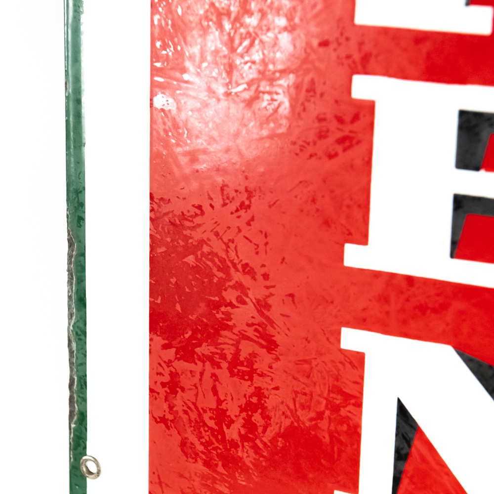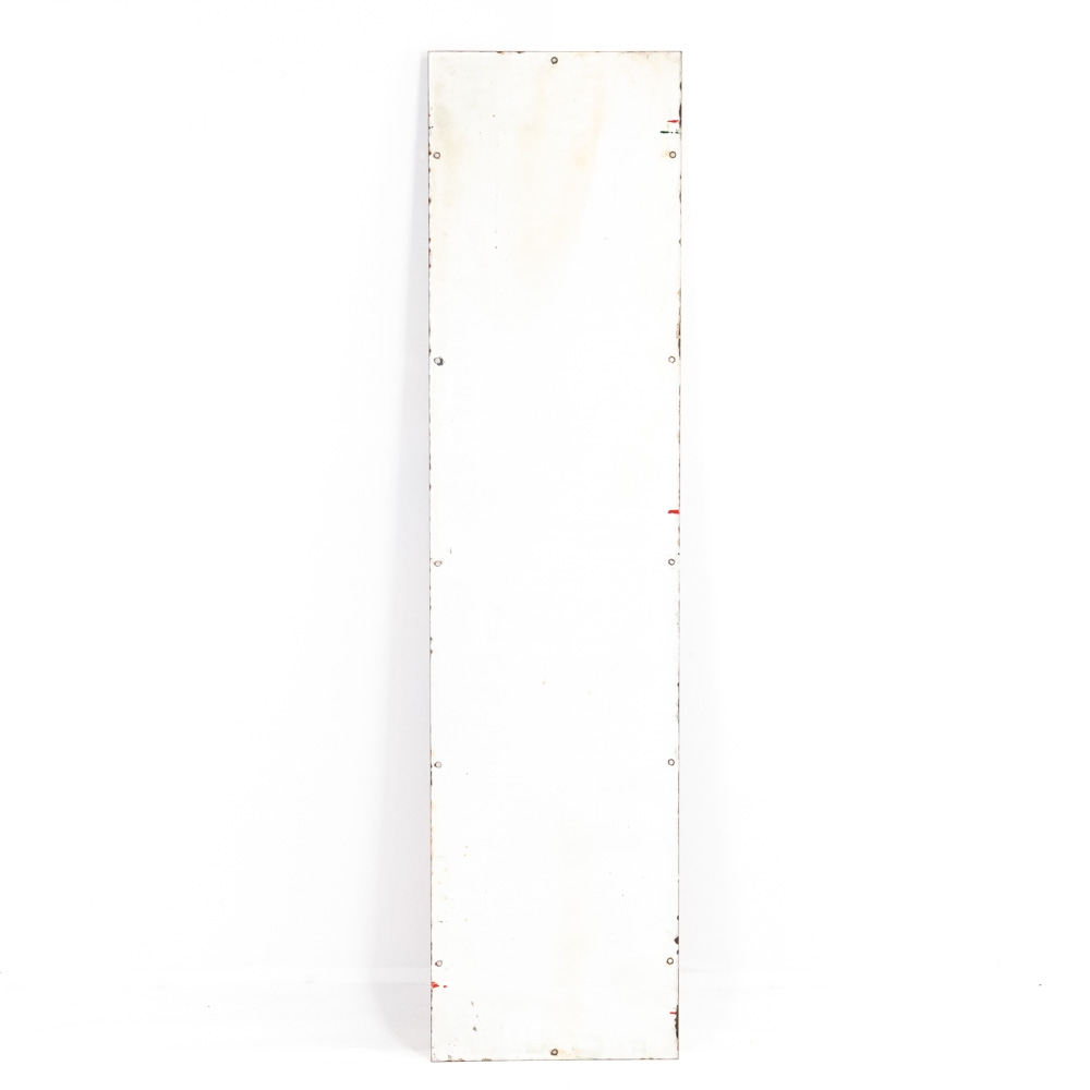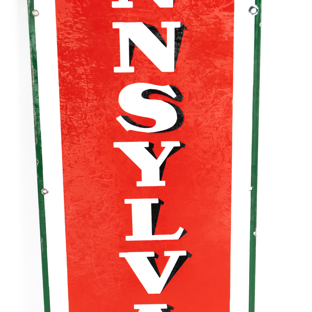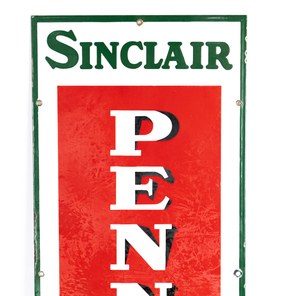 “Sinclair Pennsylvania Motor Oil” single sided elongated porcelain advertising sign. Very Good to good overall condition with some discoloration, stray marks, porcelain chips (by “L” and edges) and oxidation; Slight dullness to gloss. Approximately 60″t x 15″l. Please use photos to judge condition and bid accordingly.