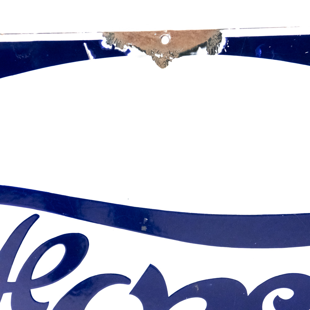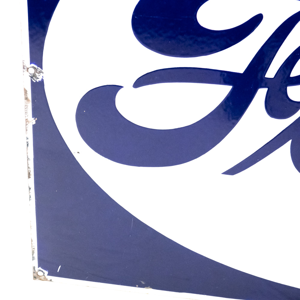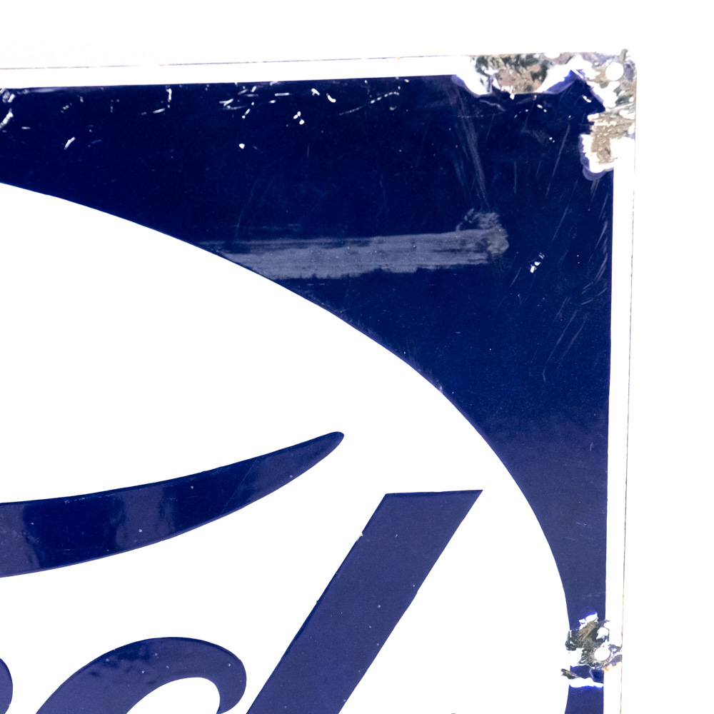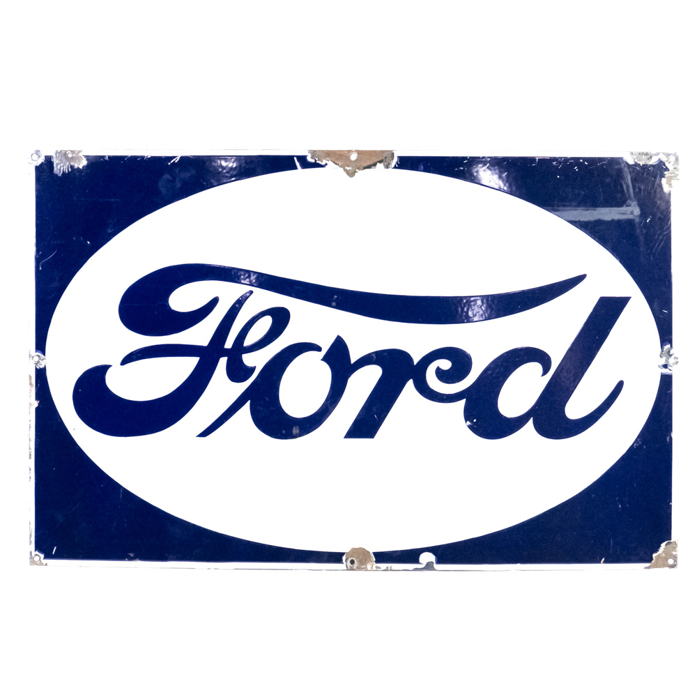 “FORD” (featured in reverse colors) single sided porcelain advertising sign. Presents well with strong color and gloss, very good overall condition with stray marks, chipped porcelain in areas (primarily near edges) and oxidation. Approximately 25″t x 39″l; “Veribrite” stamped near bottom corner (partially chipped). Please use photos to judge condition and bid accordingly.